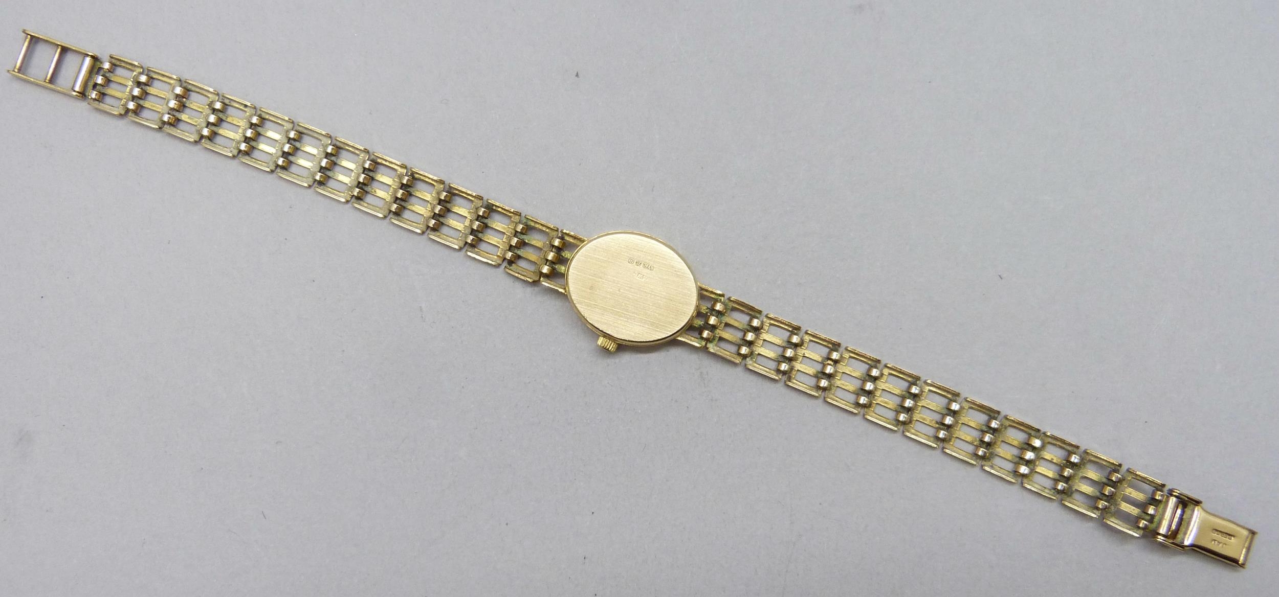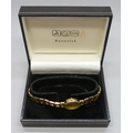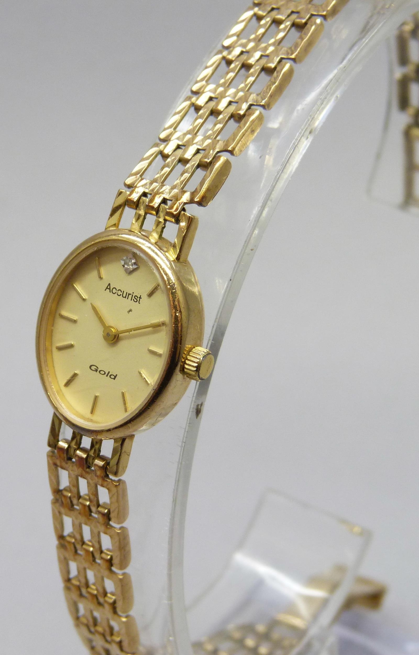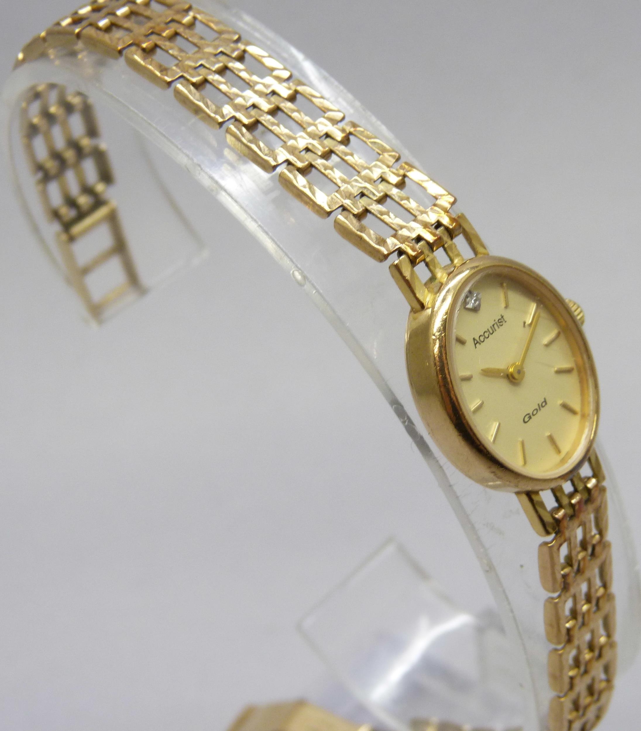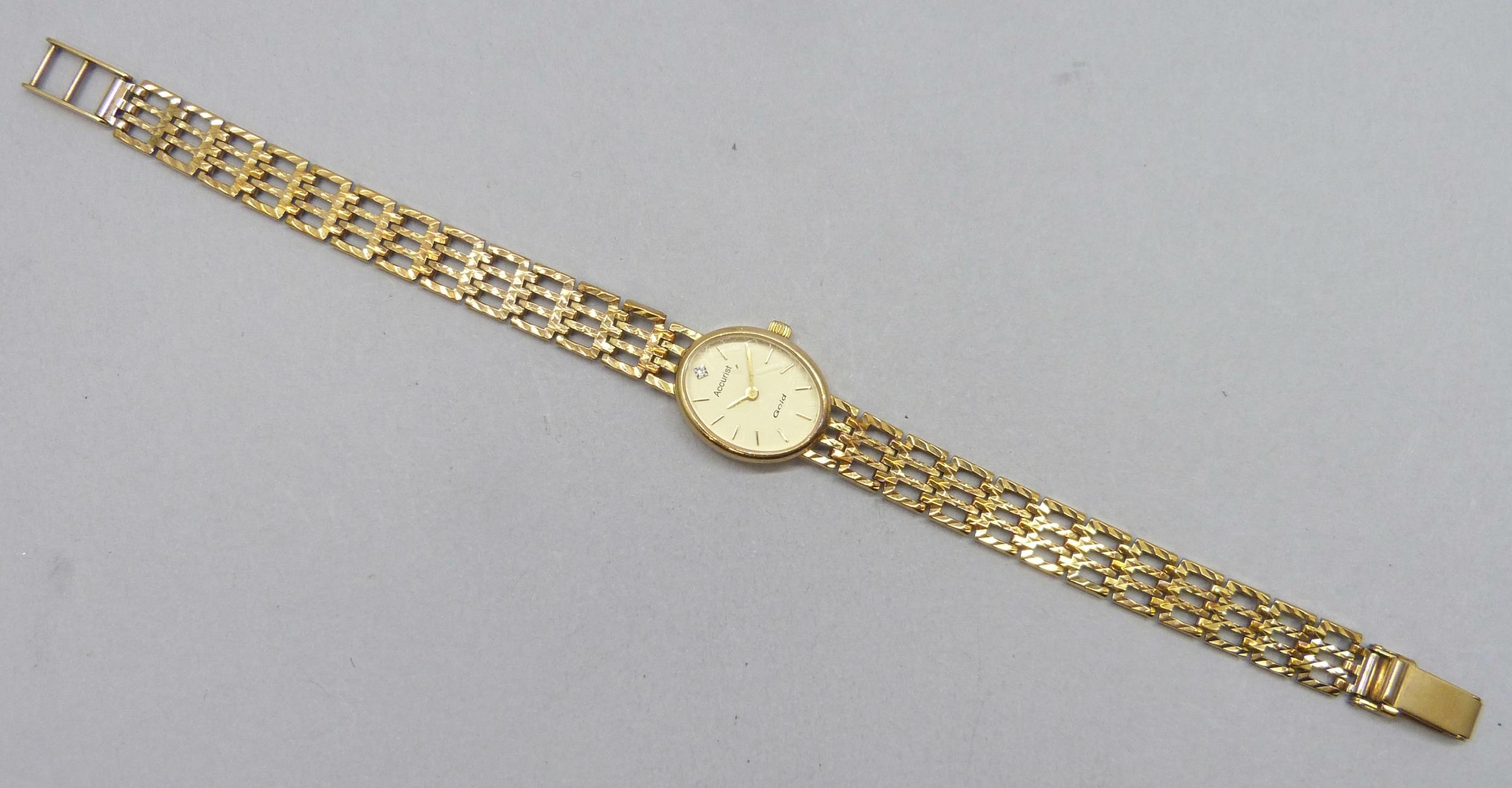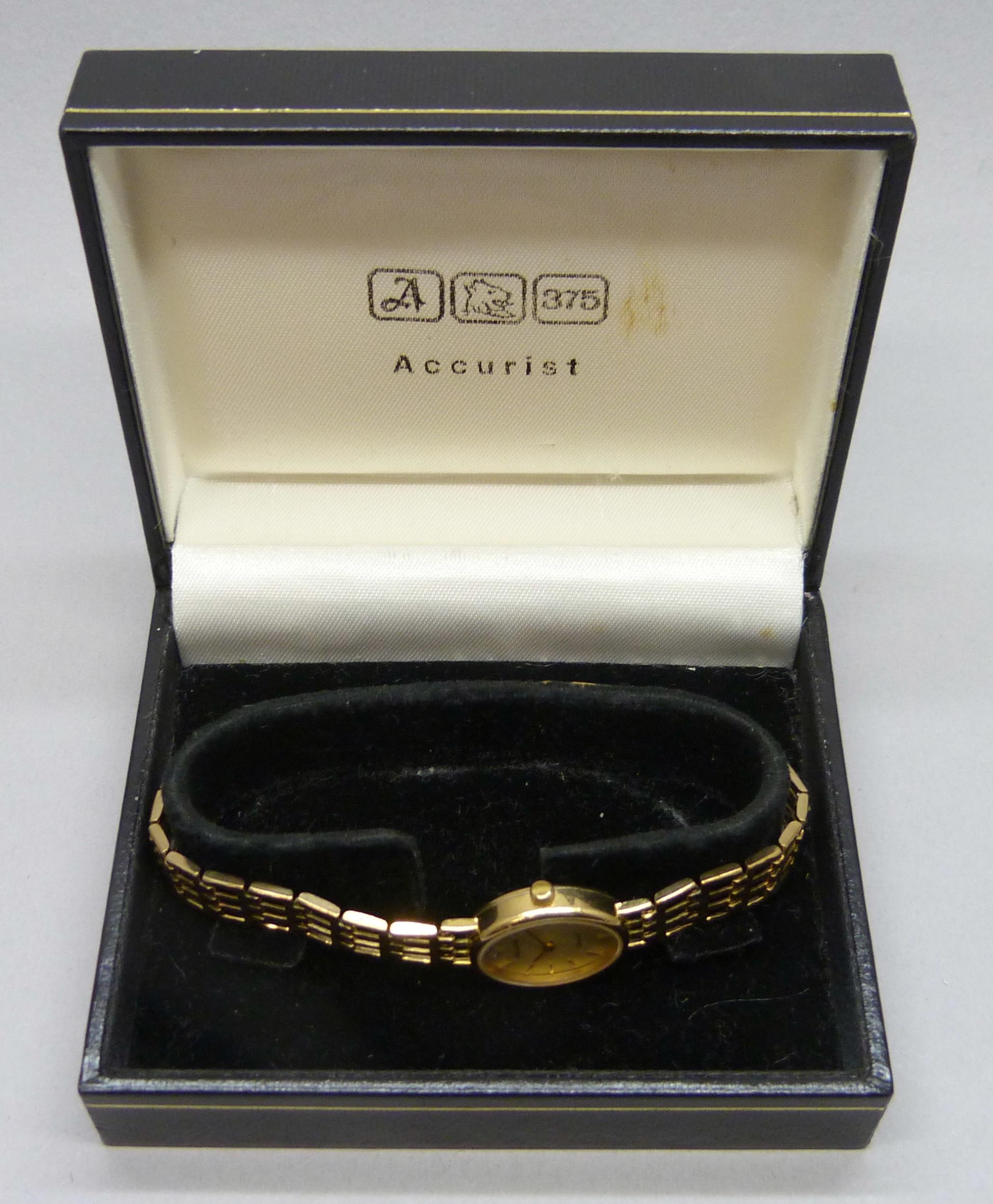 A lady's 9ct gold Accurist wristwatch on a 9ct gold strap, 17mm including crown, 14.5g total weight, boxed