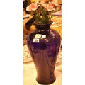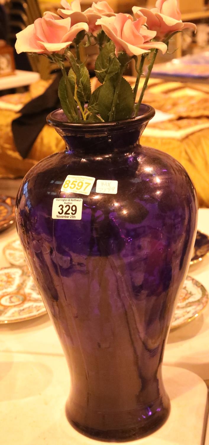 Large blue glass vase with six ceramic roses. Not available for in-house P&P