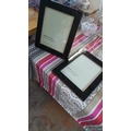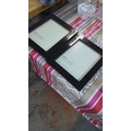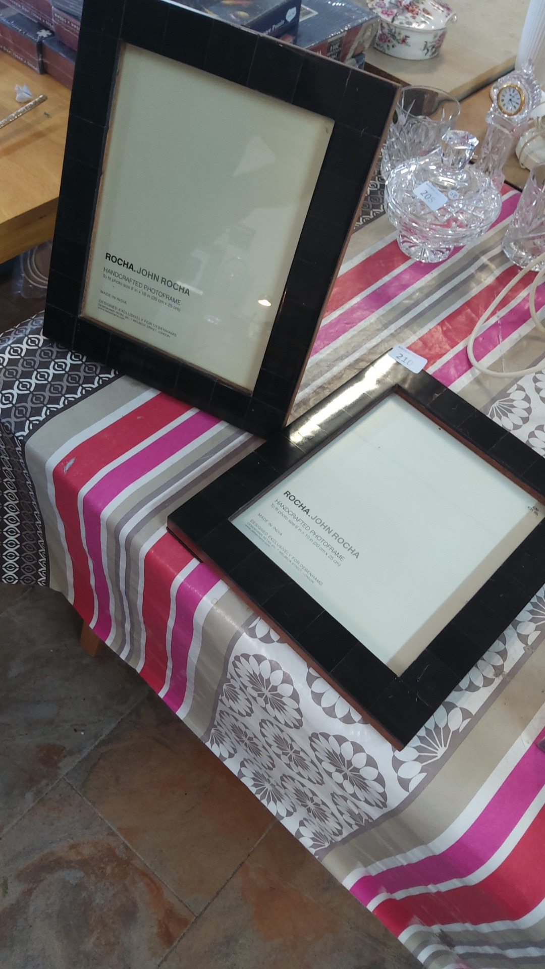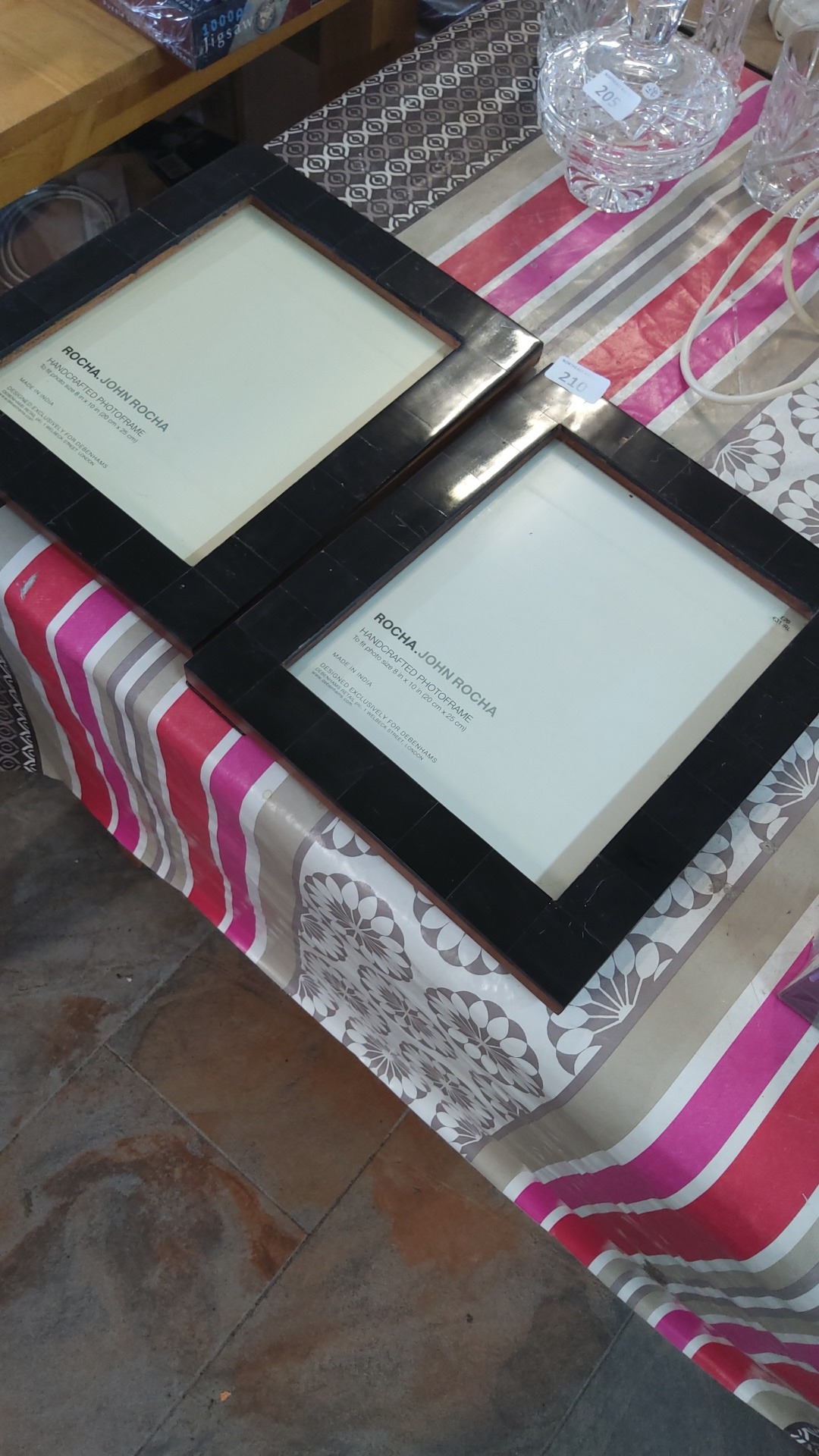 A pair of Rocha John Rocha handcrafted photograph frames, with wide ebonised square-section borders and wood inlay edges; branded inserts stating 10 x 8 in (20 x 25 cm).