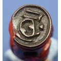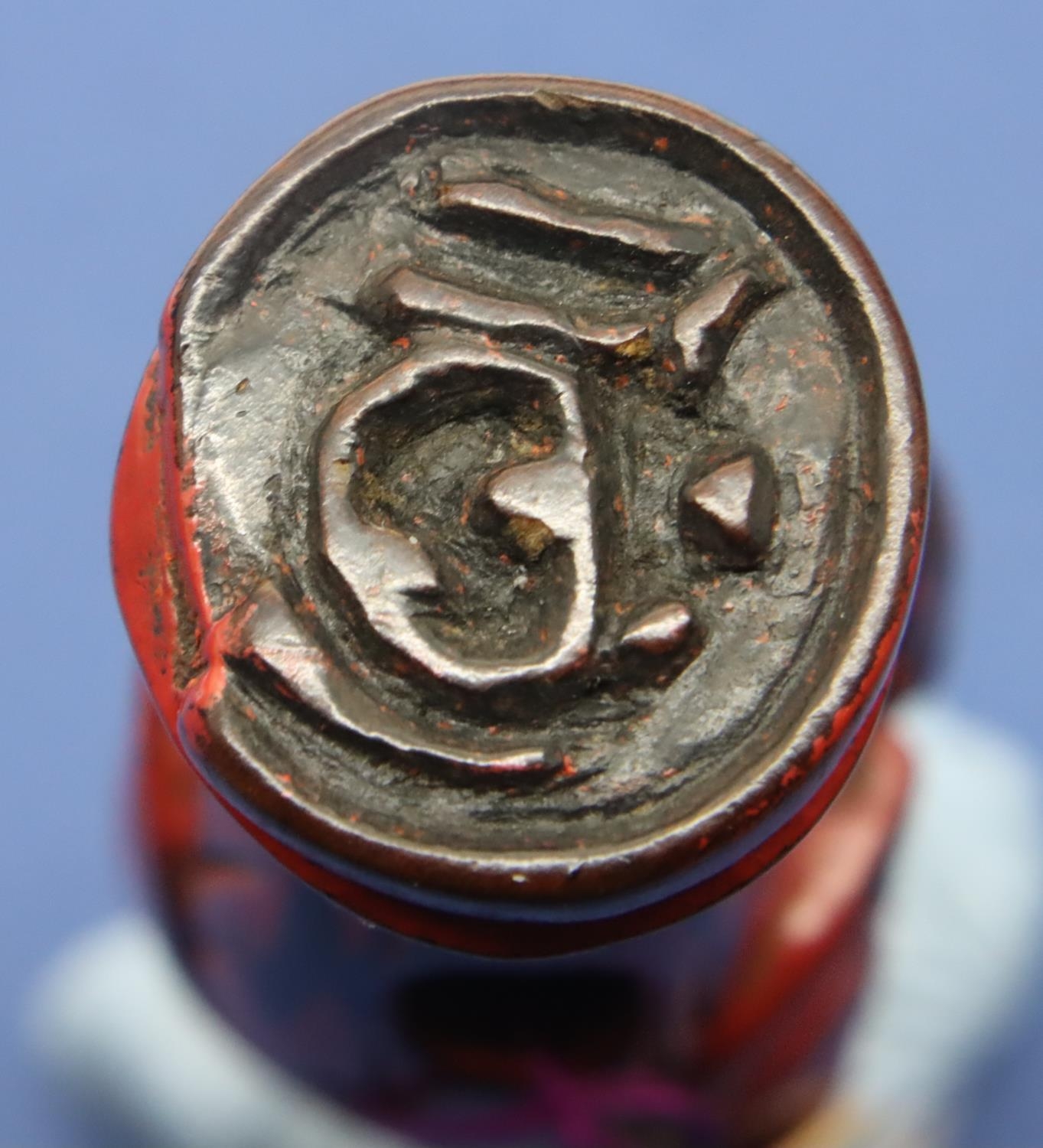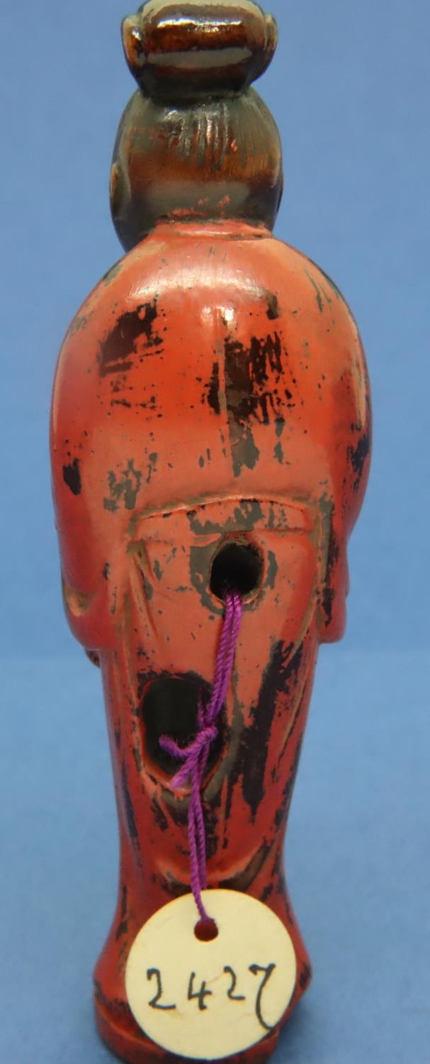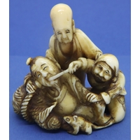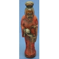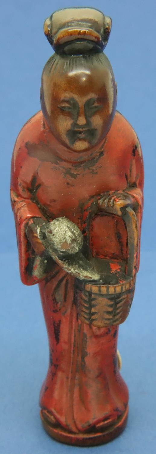Boxwood carved netsuke seal in the form of a figure carrying a basket and a fruit, H: 75 mm, unsigned. Slight wear to holes, otherwise good condition. P&P Group 1 (£14+VAT for the first lot and £1+VAT for subsequent lots)
