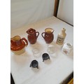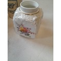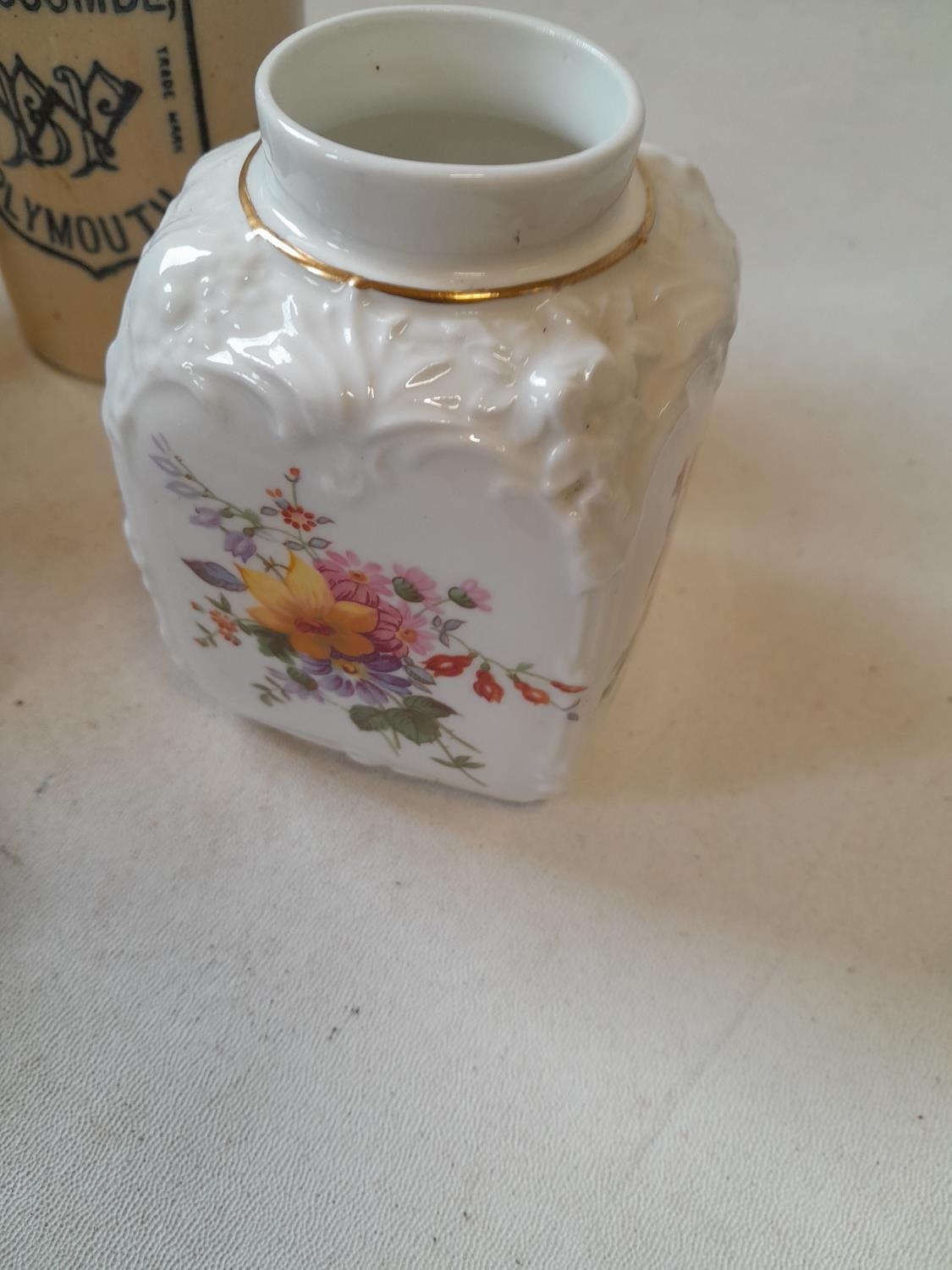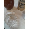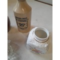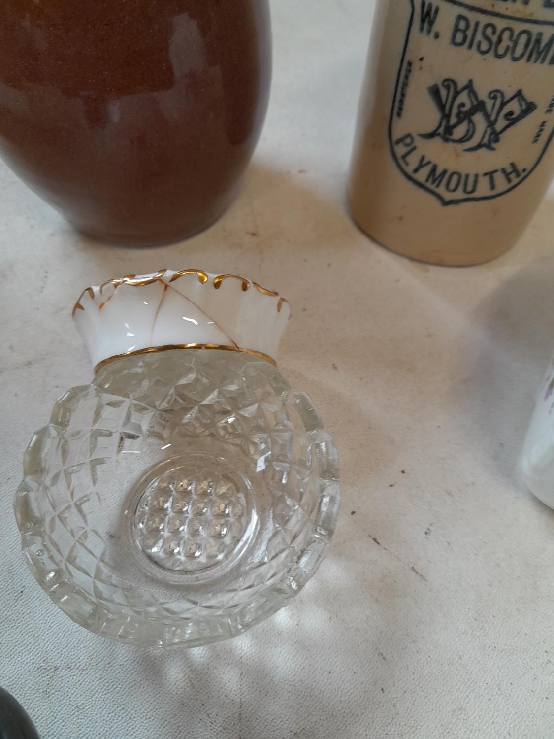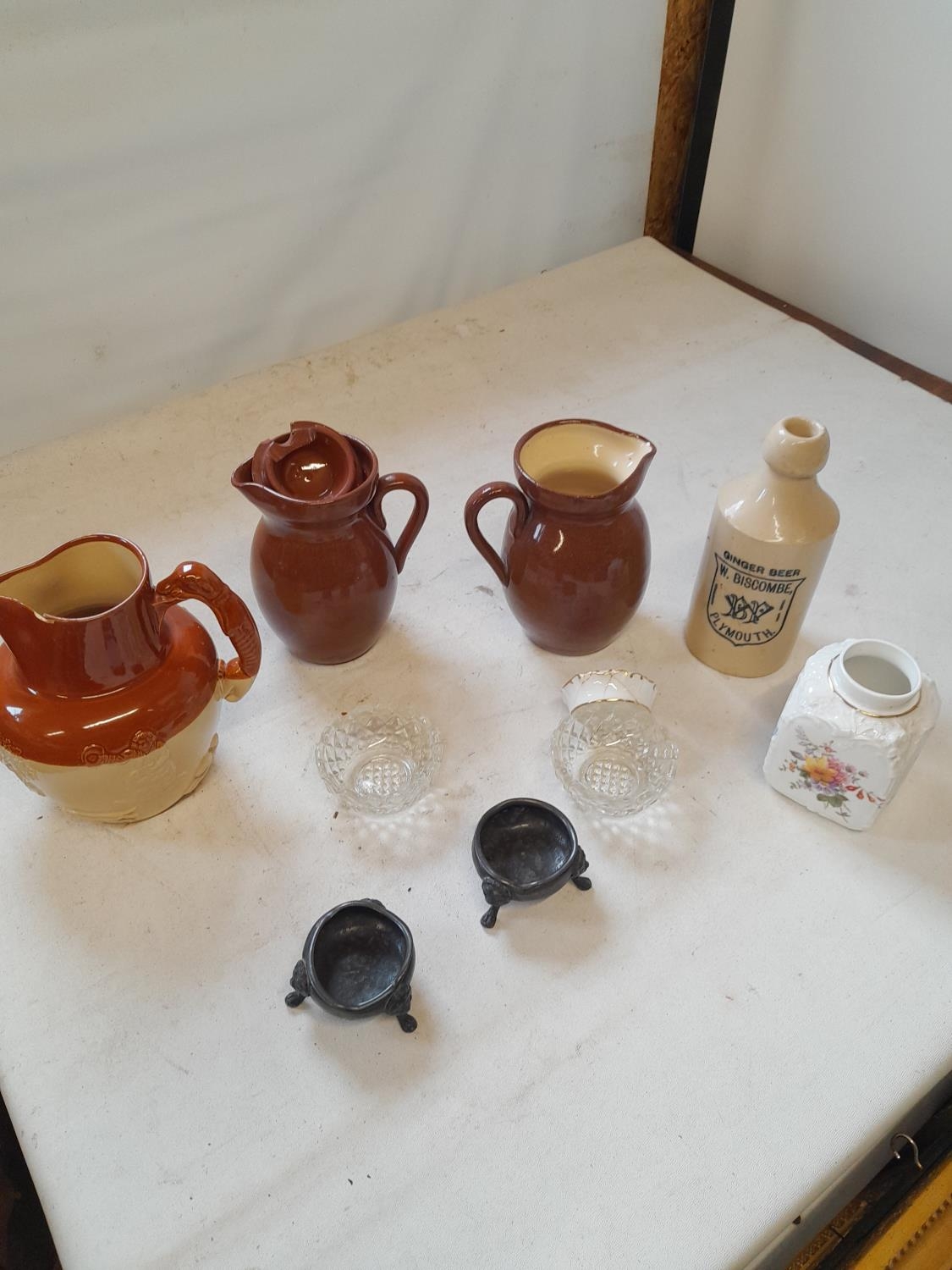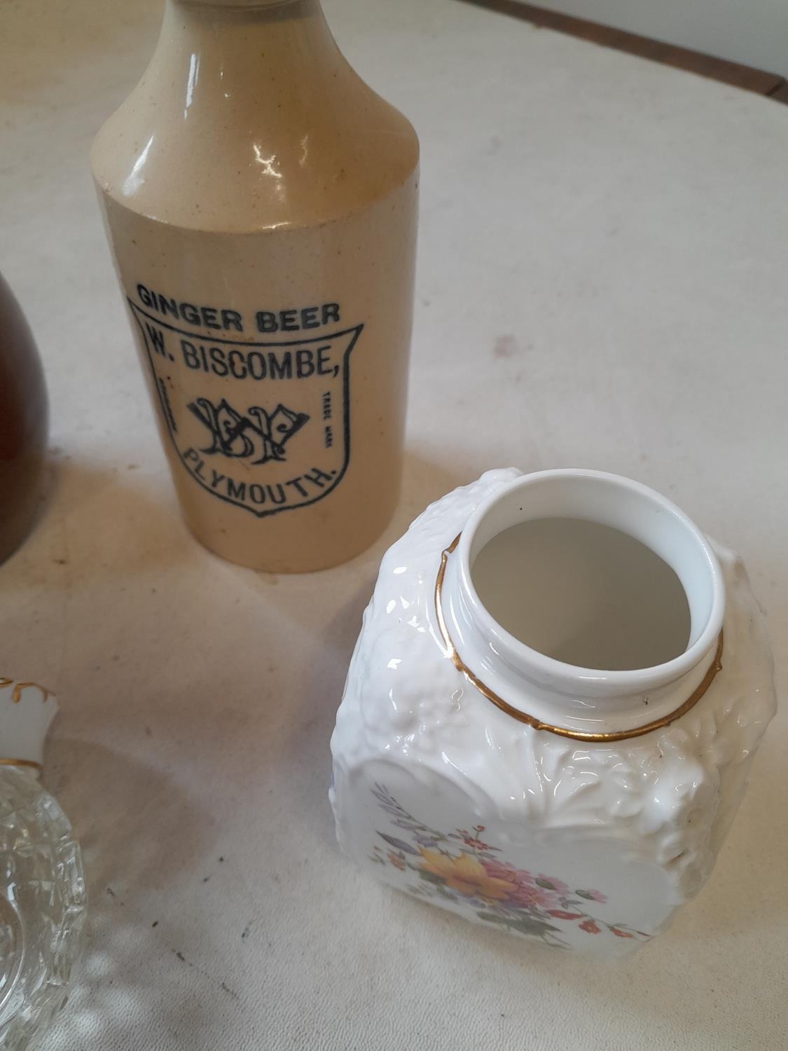 Decorative china : Crown Derby vase, lid damaged Devon ware, pewter table salts, Biscombe Brewery stone ware ginger beer bottle