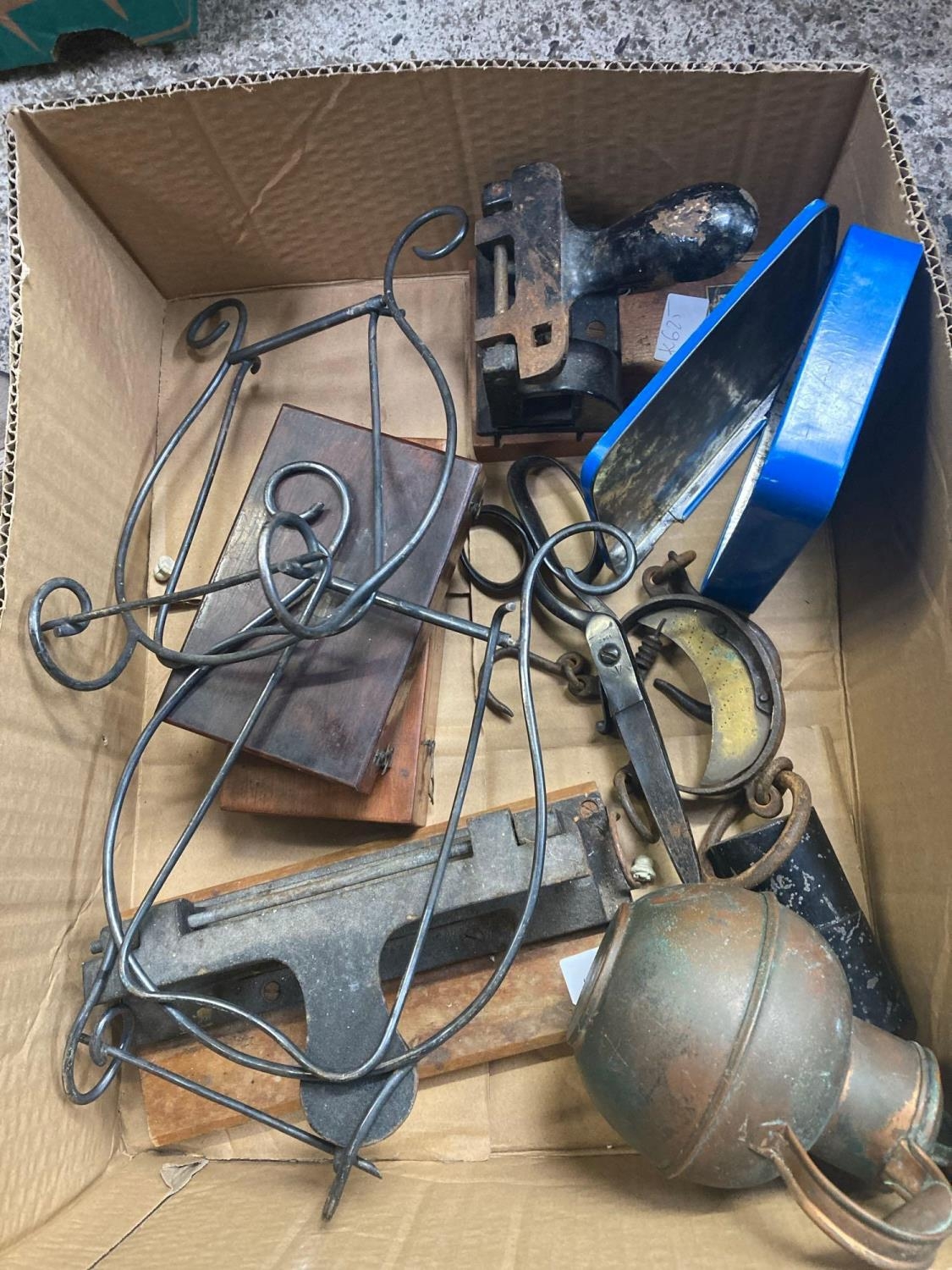CARTON WITH 2 VINTAGE PAPER PUNCHES, PINKING SCISSORS & 2 METAL MUSIC STANDS