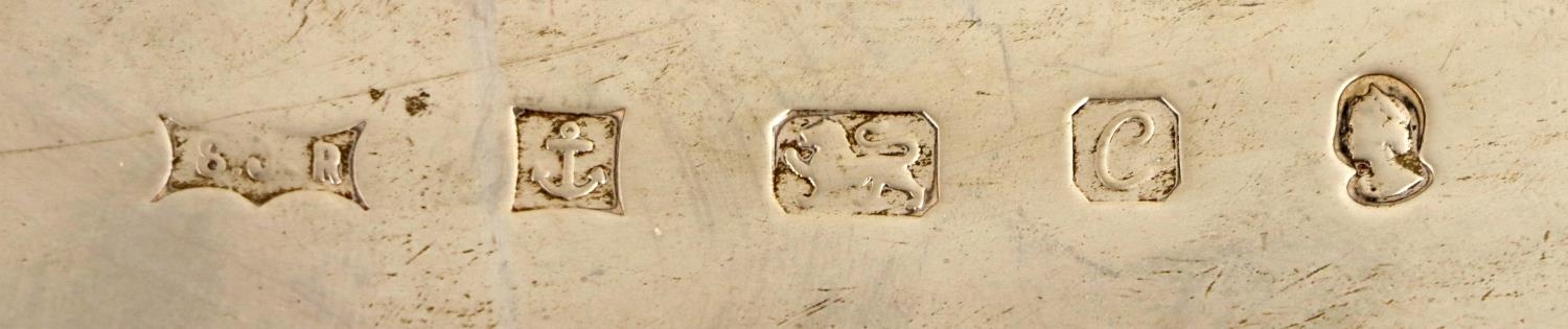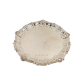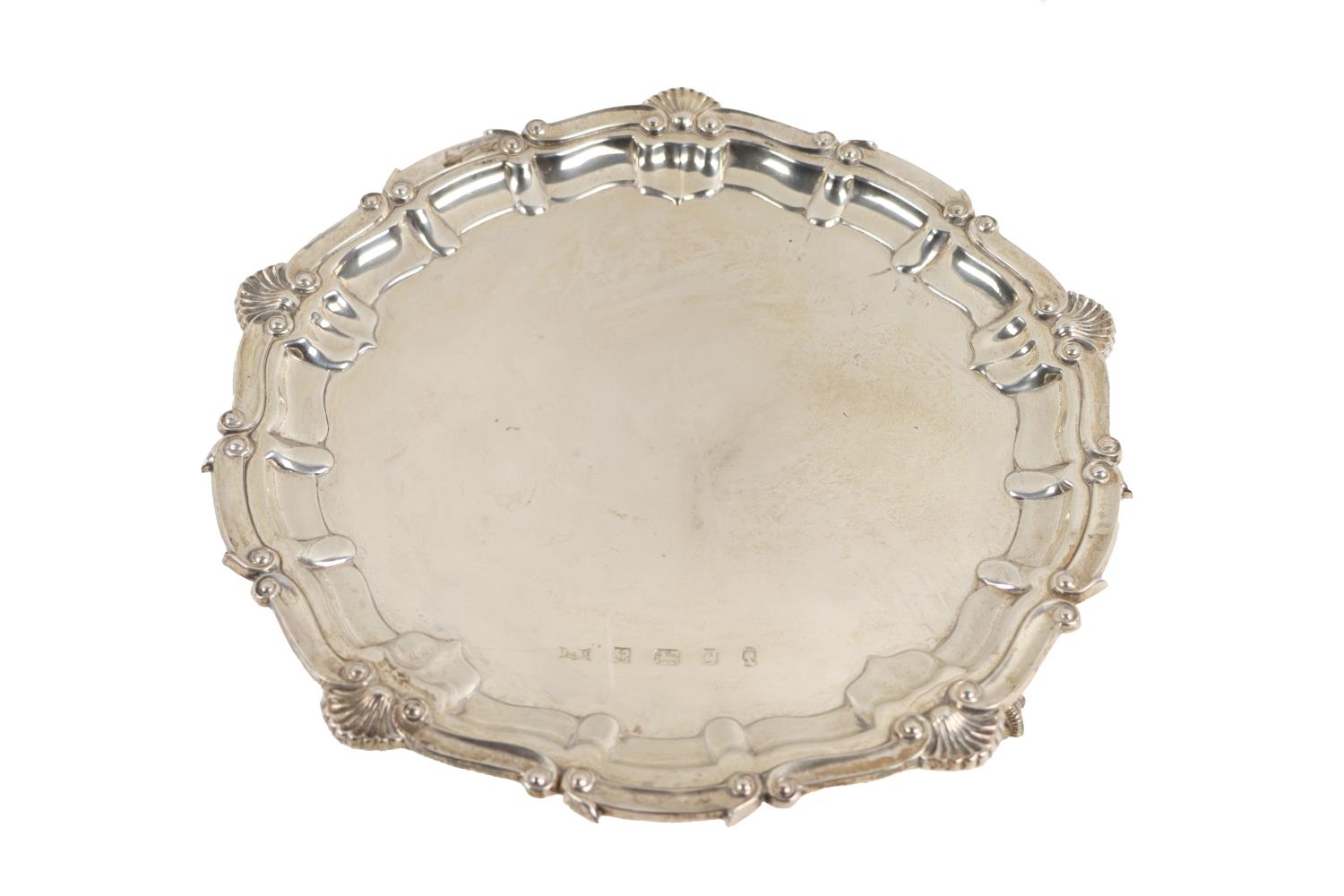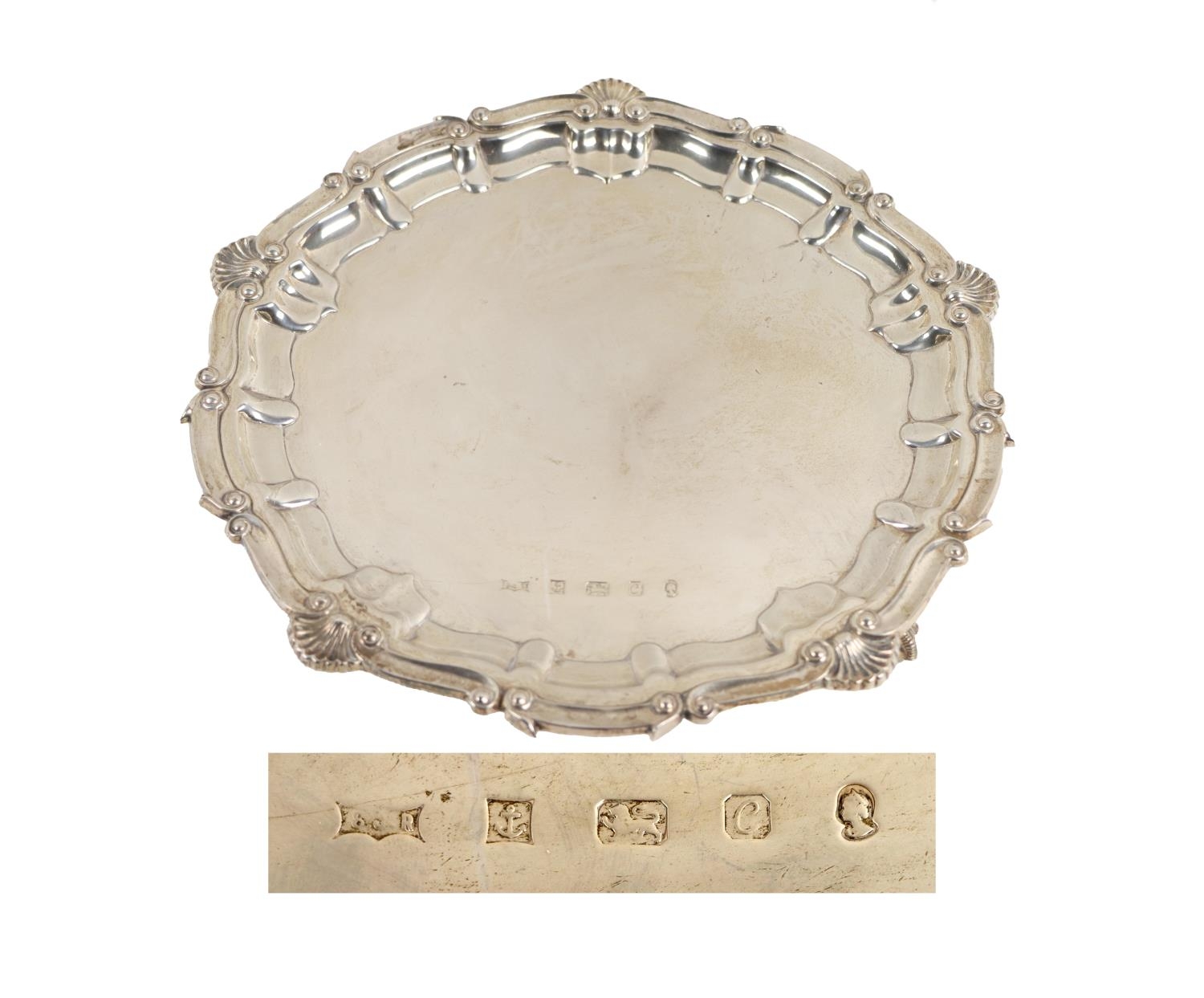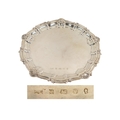 A good quality heavy English silver Card Tray, with scroll edge and shell decoration on ball n' claw feet, approx. 30cms (12") diameter, hallmarked Birmingham, by S.J. Rose & Son, 1977, approx. 24 ounces. (1)