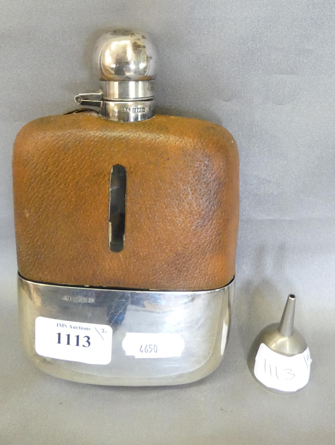 Large Birmingham Silver Mounted Spirits Flask with leather outer covering.