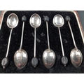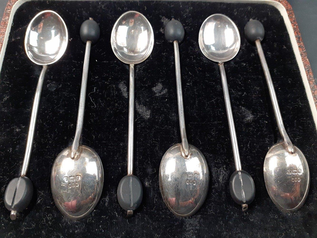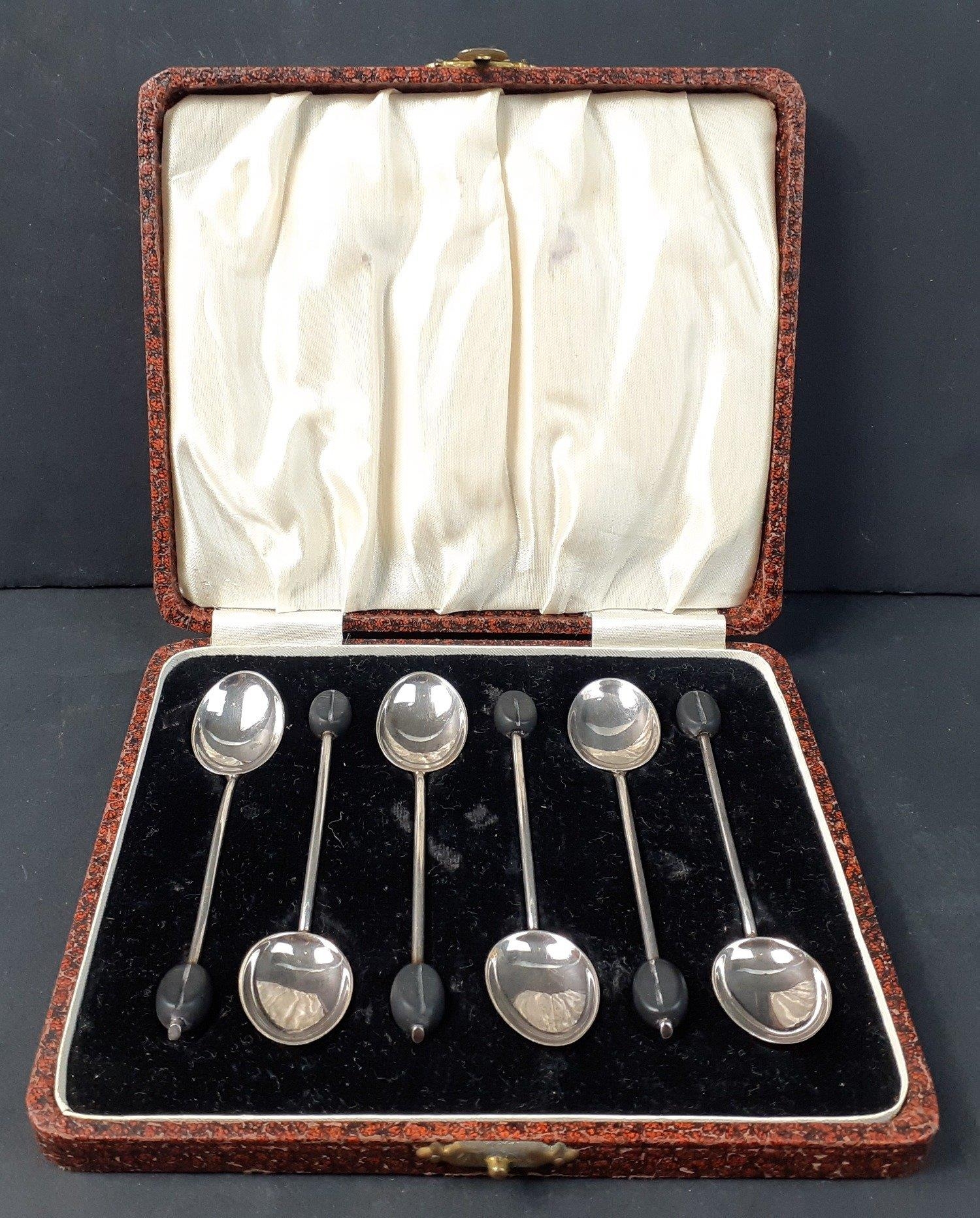 A boxed set of 6 silver coffee bean spoons, hallmarked for Birmingham 1937. Gross weight 38g approx