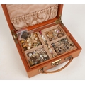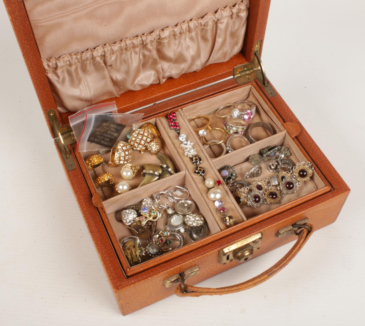 A jewellery box and contents of costume jewellery. Includes rings, silver gilt cubic zirconia solitaire, earrings, continental silver filigree bracelet etc.