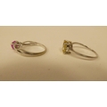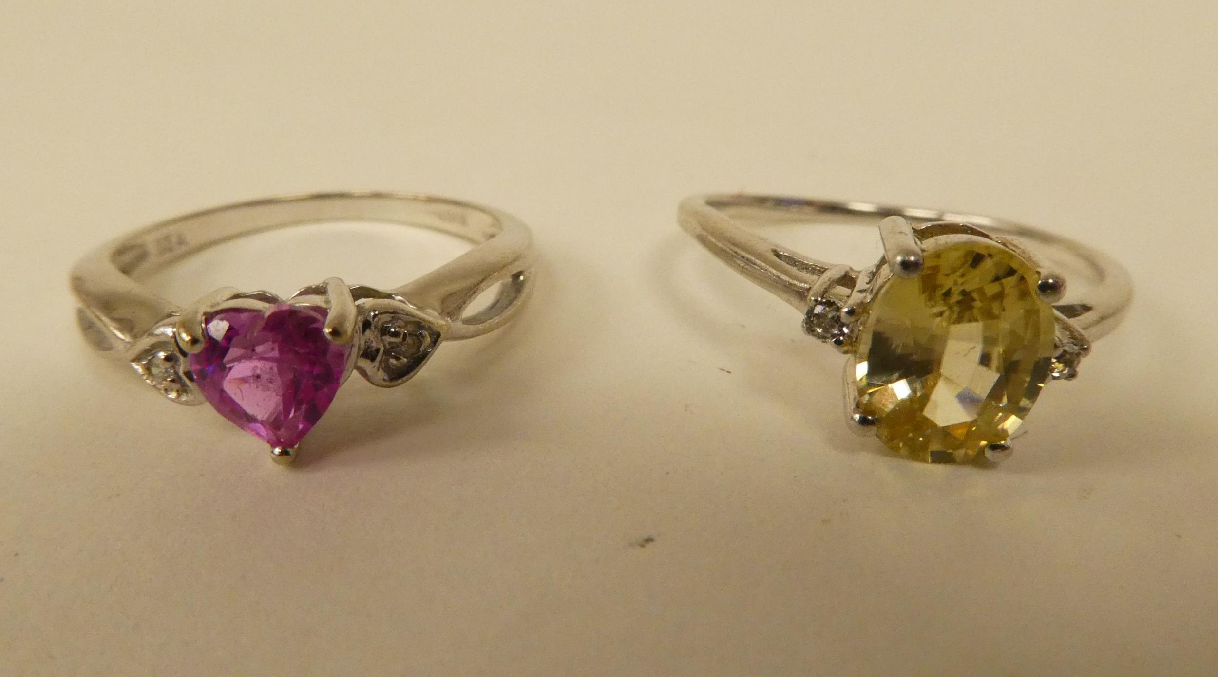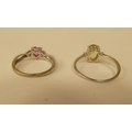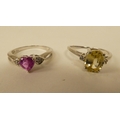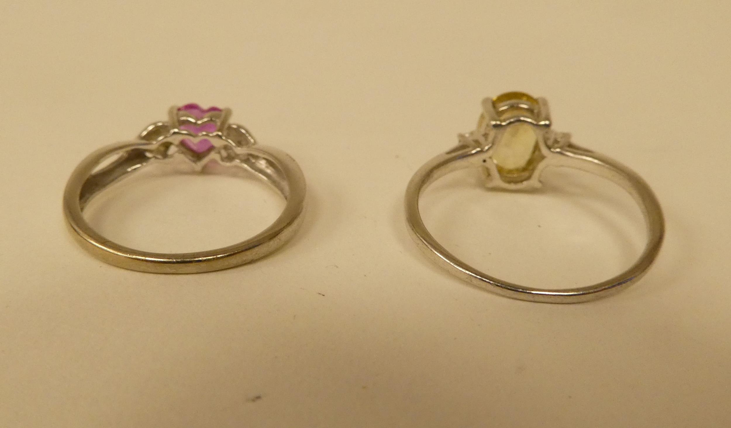 Two white metal rings, one set with a yellow citrine, the other with a heart shaped pink stone