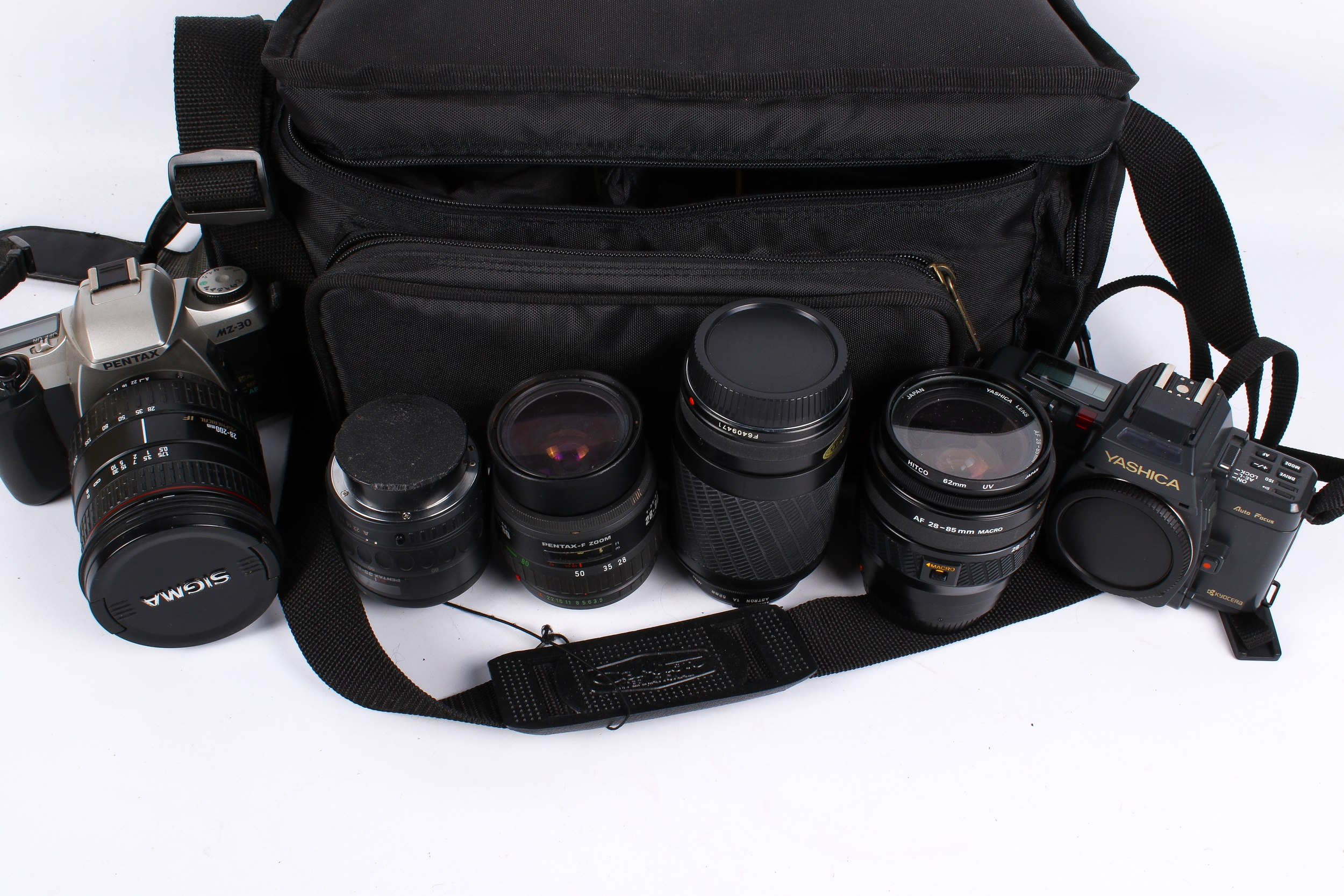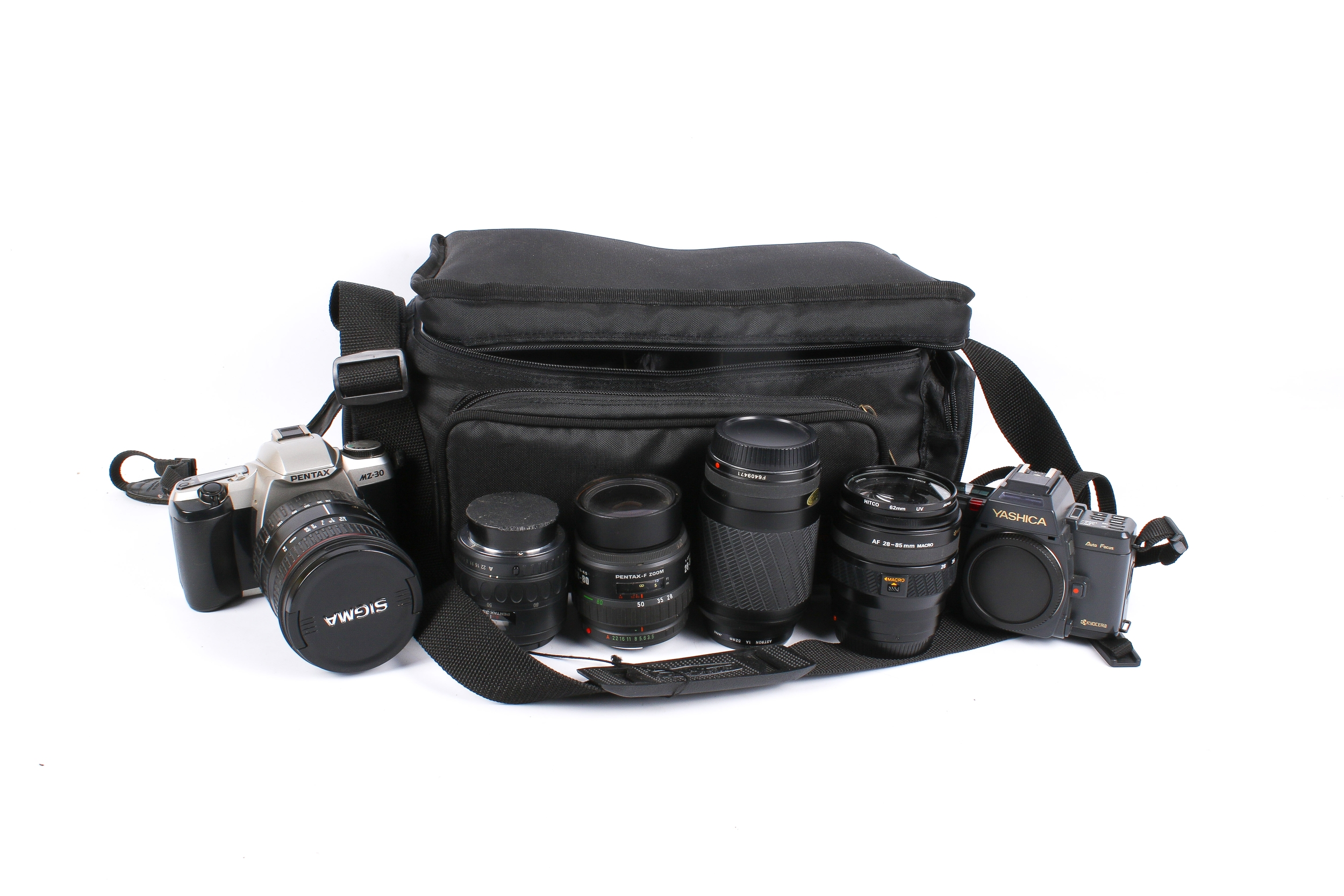A group of 35mm film cameras and lenses. Including a Pentax MZ-30 with a Sigma Zoom 28-200mm 1:3.5-5.6 Macro lens, etc.