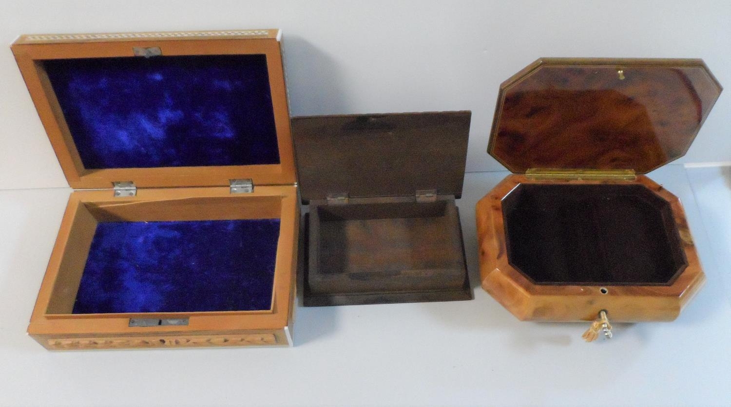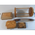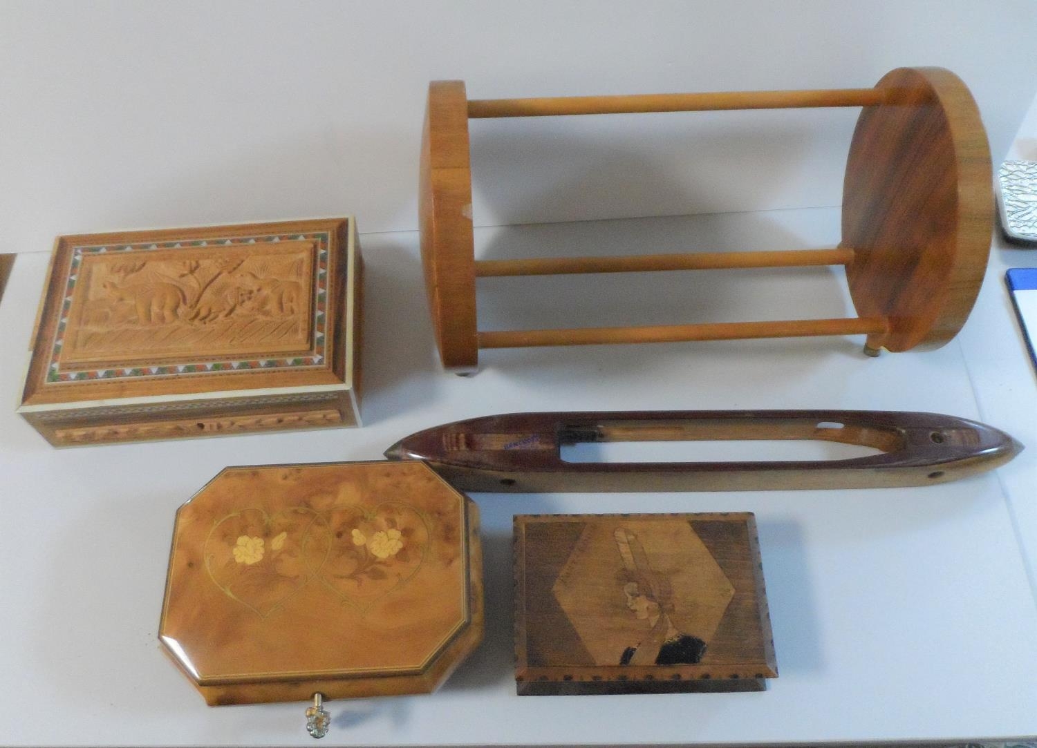 Collection of Treen including a musical box and a small Art Nouveau style book shelf