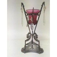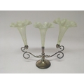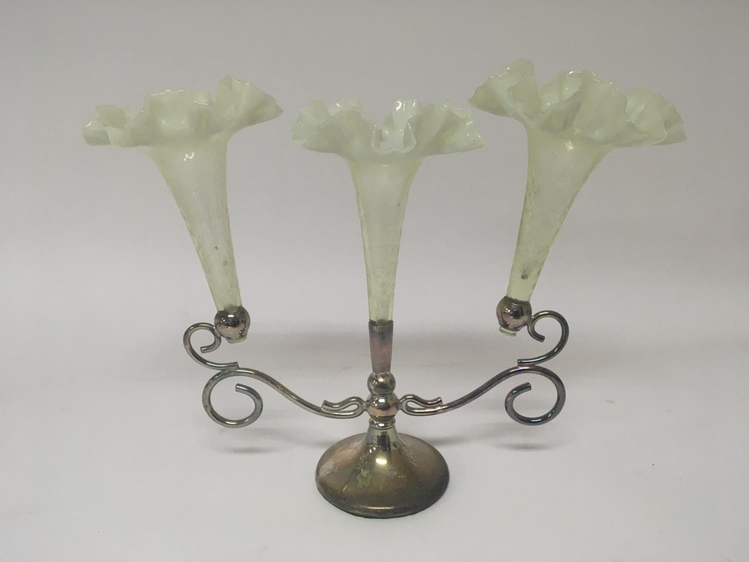 A silver plated a d Vaseline glass Edwardian eperne with three glass flutes with shaped edges and scroll silver plated supports no obvious damage.