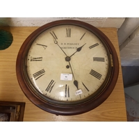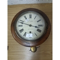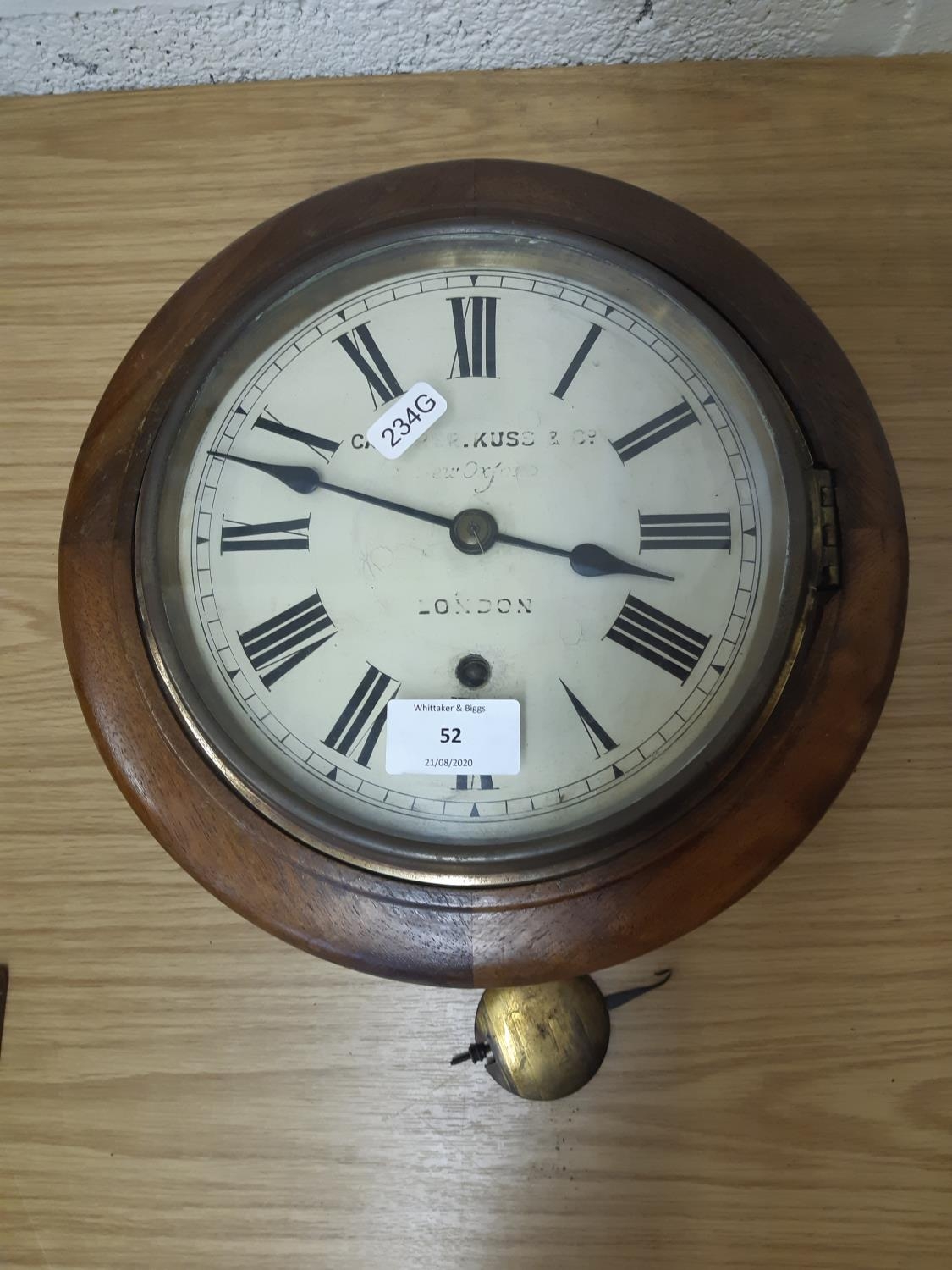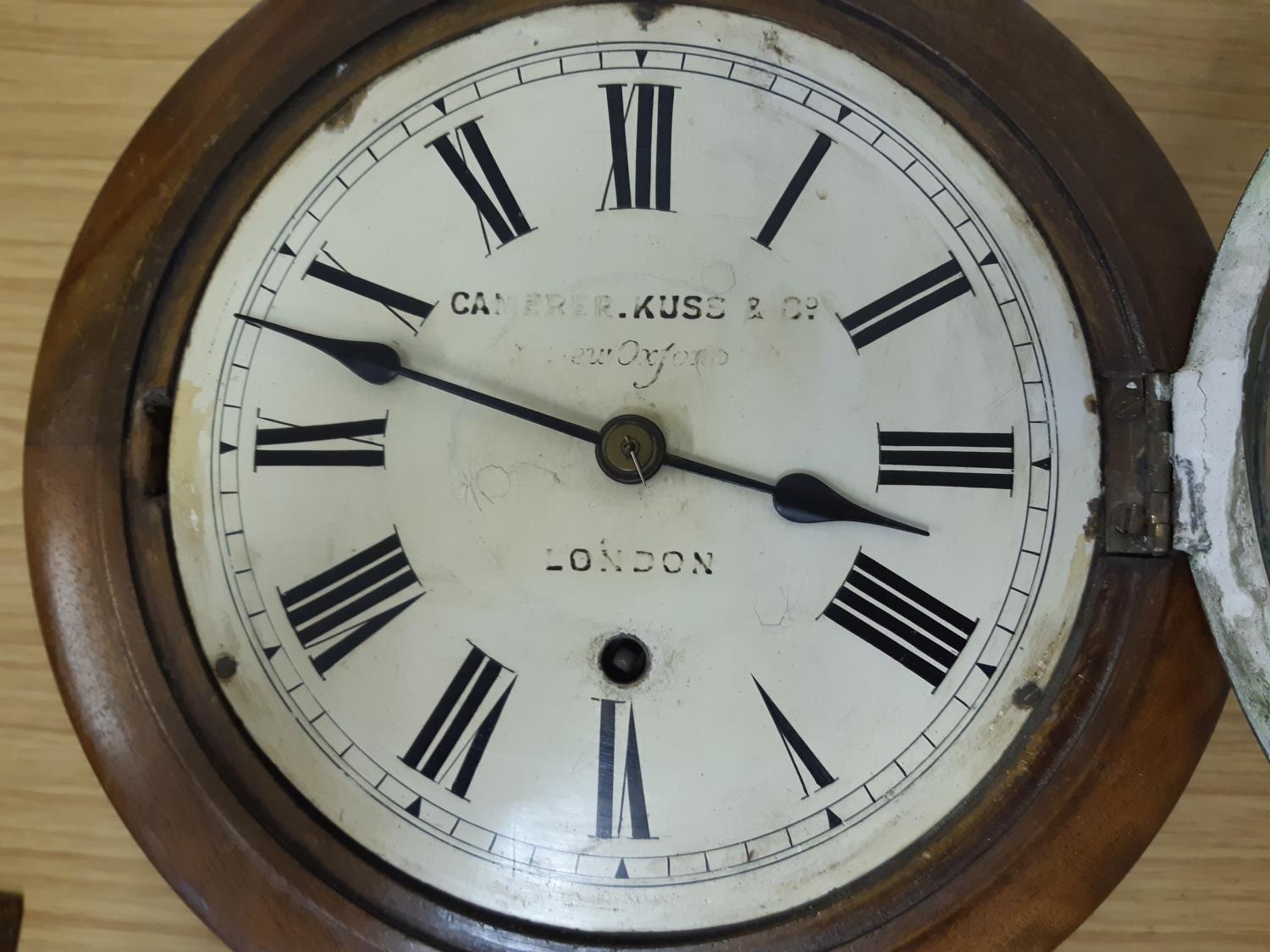 A small Victorian walnut cased circular mechanical wall clock with off white enamel dial, Brass bezel, pendulum, black Roman numerals and the face being stamped for “Camerer.Kuss & co of New Oxford”