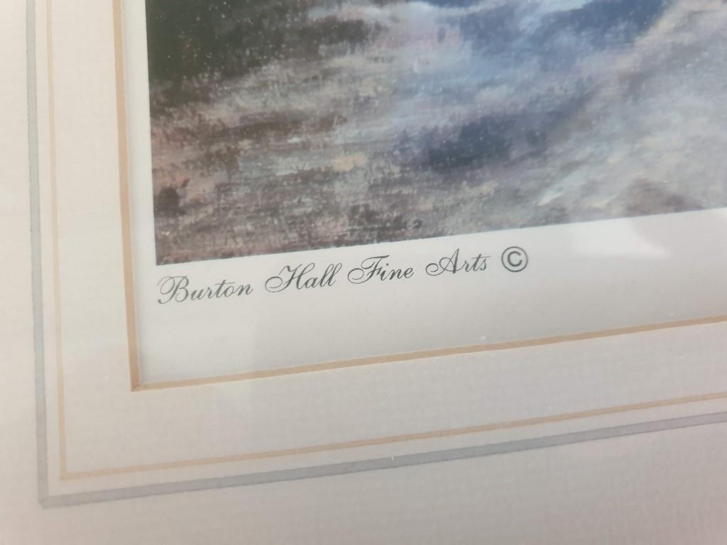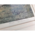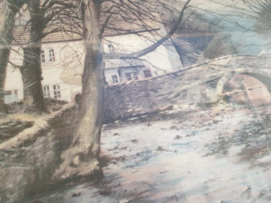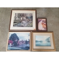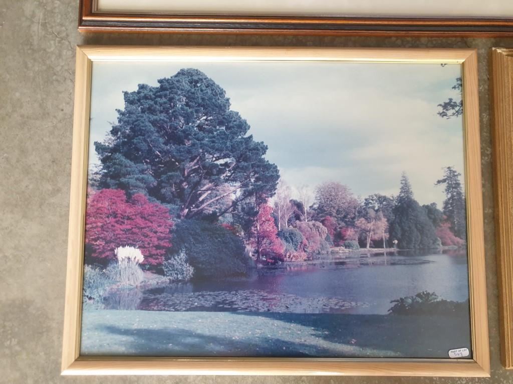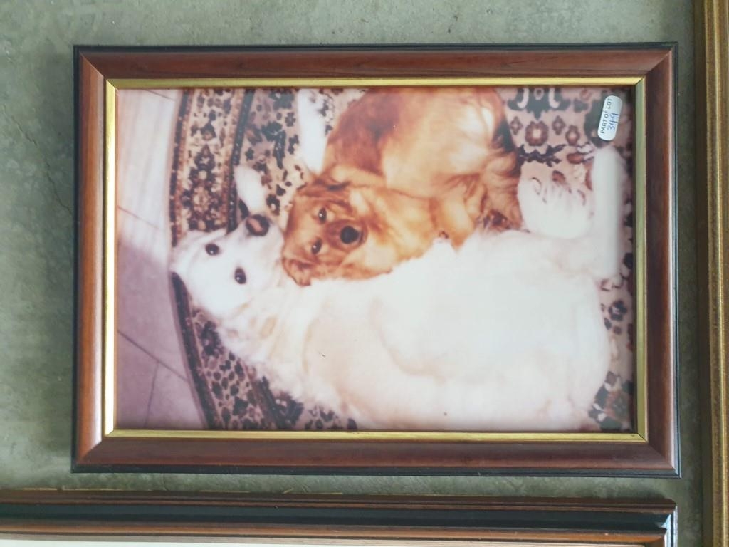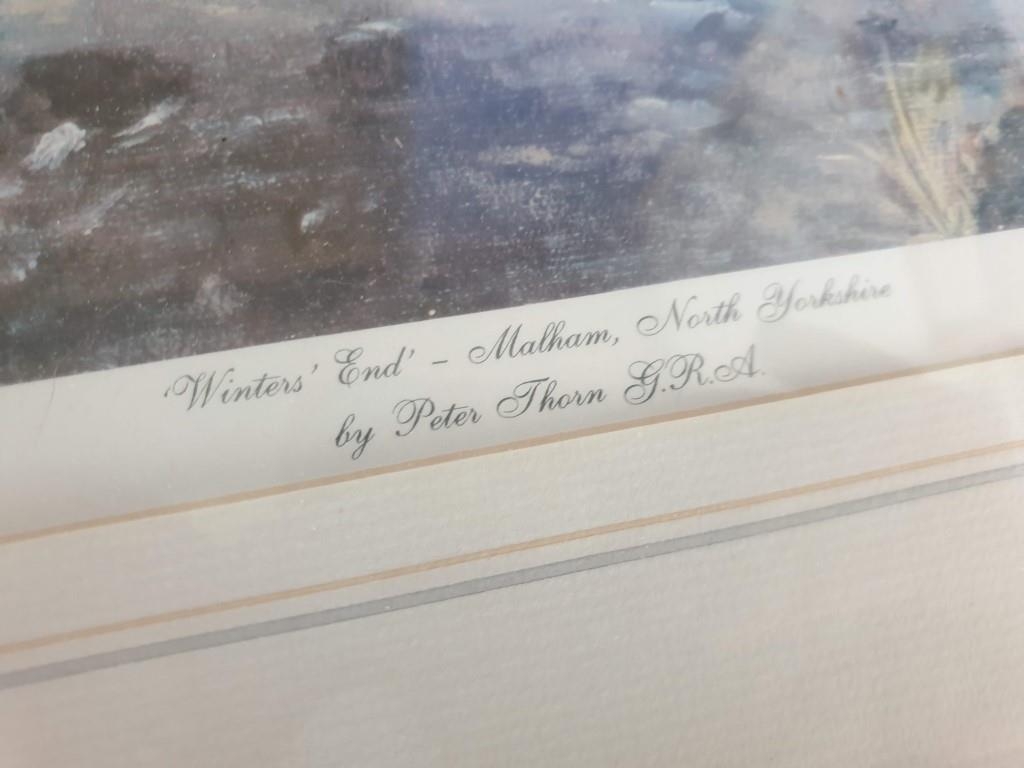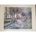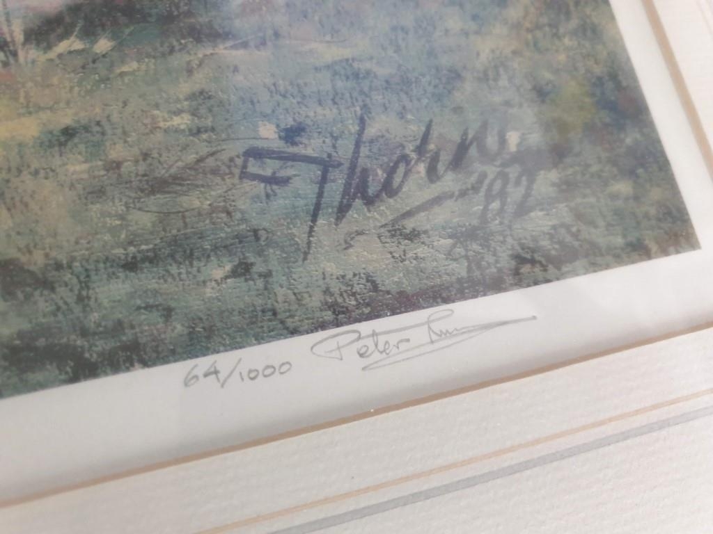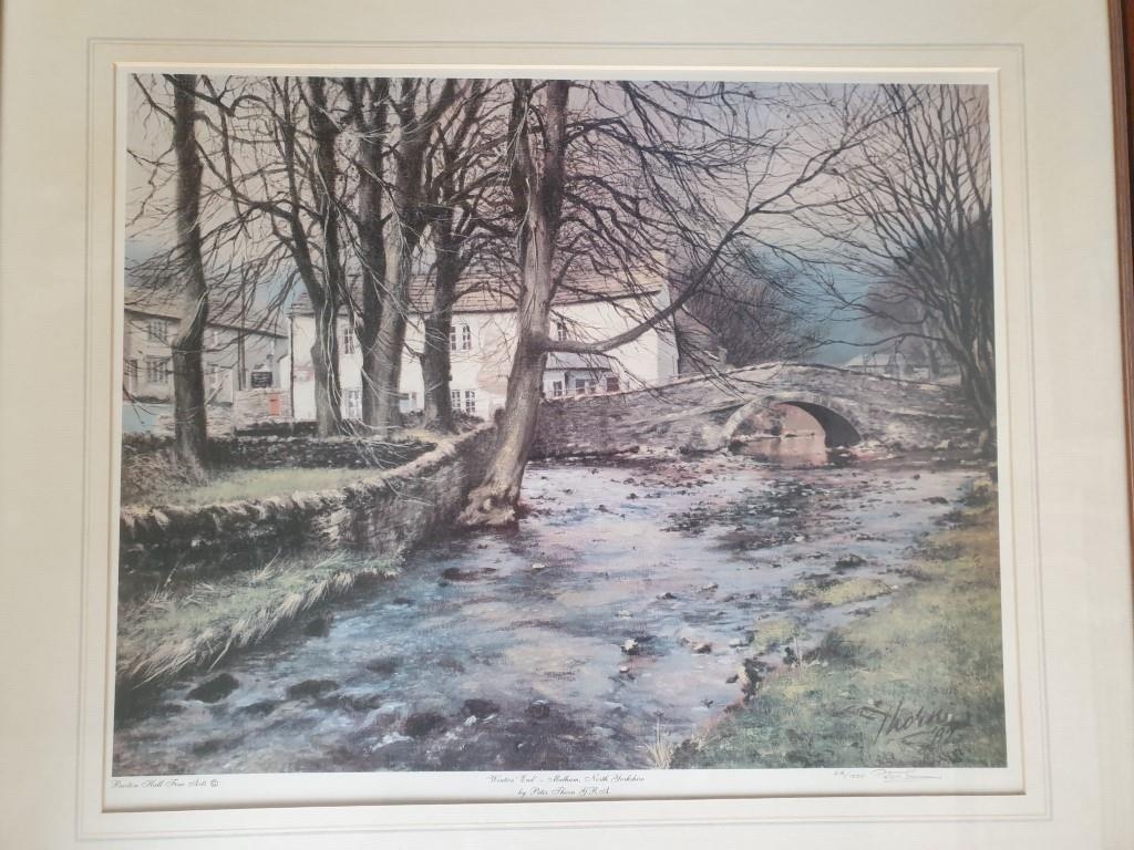 Framed Signed Limited Edition (64/1000) Print of 'Winters End' by Peter Thorn (Cottage and Bridge Over Stream), Approx. 60 x 70cm), Together with Framed Print of Pond, Photo of Trees and Dogs (4)