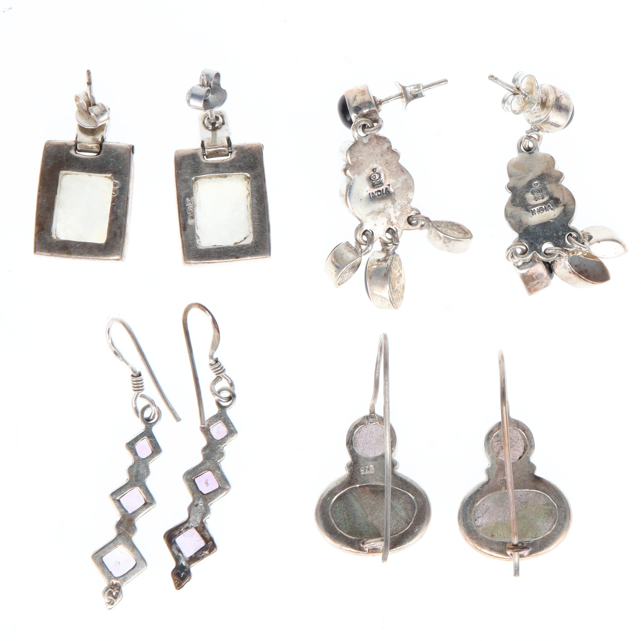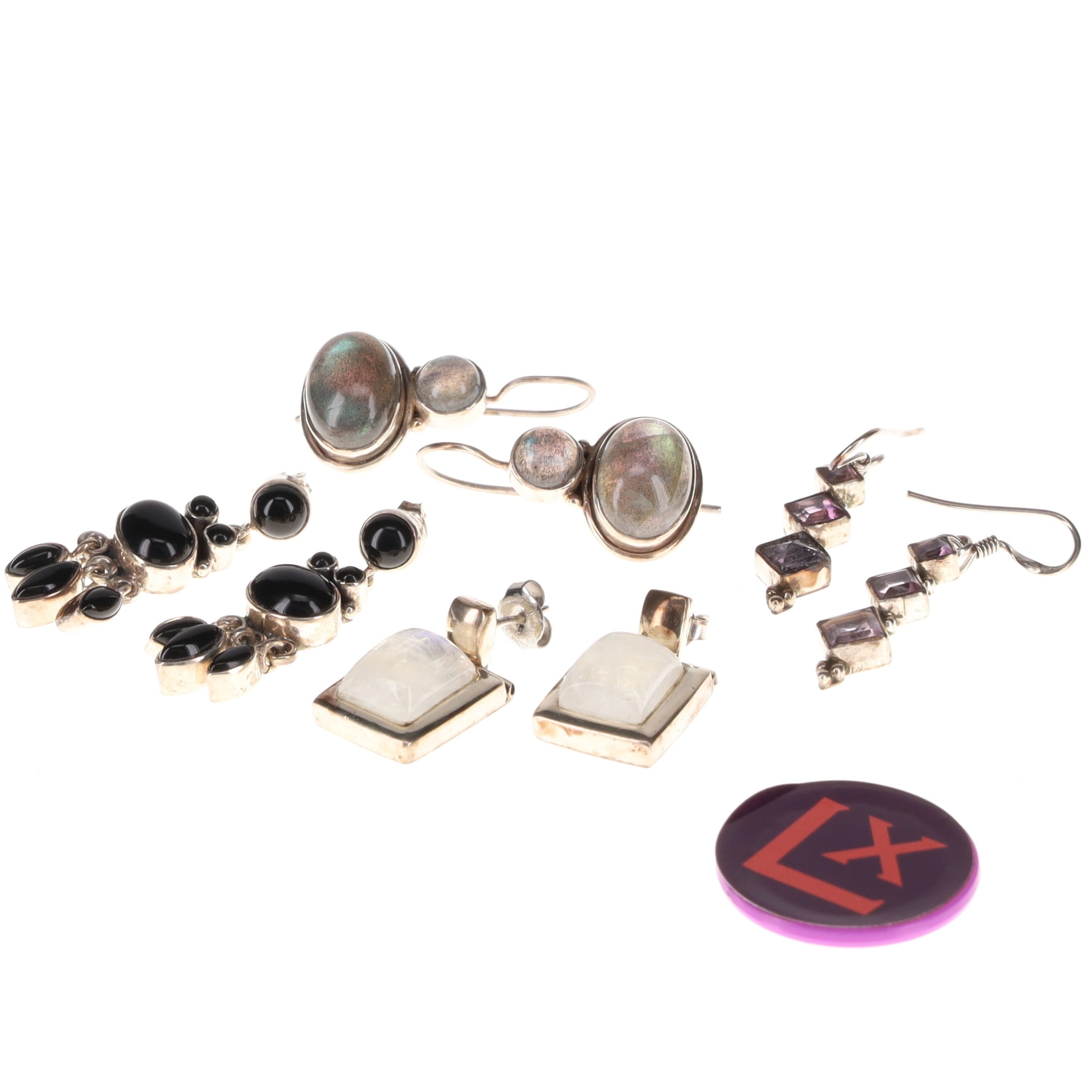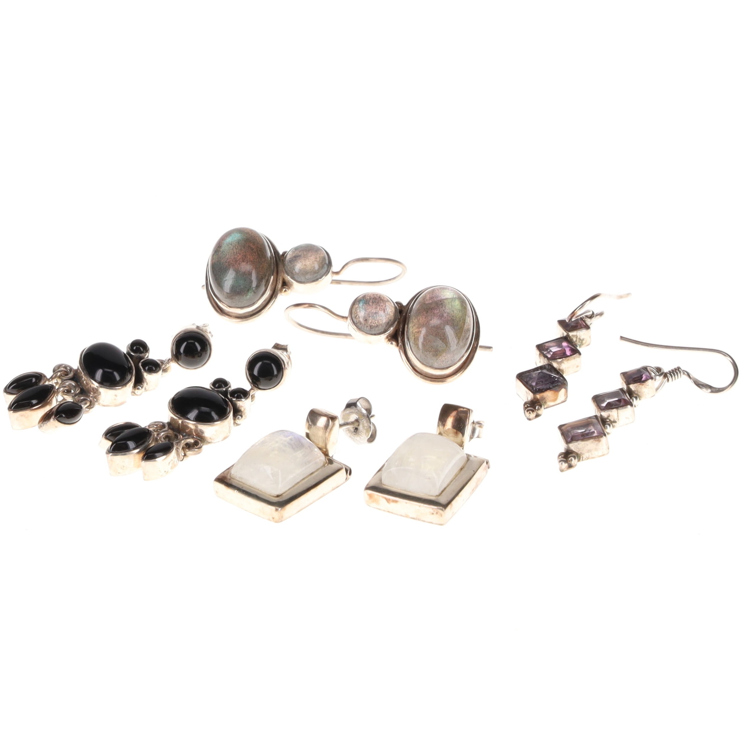 Sterling Silver Gemstone Earrings Collection incl. Moonstone, Labradorite, Amethyst, Onyx. These earrings have been stamped as silver. All earrings are in good condition with minimal signs of wear. Weighs in total 35g.