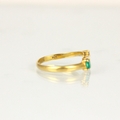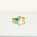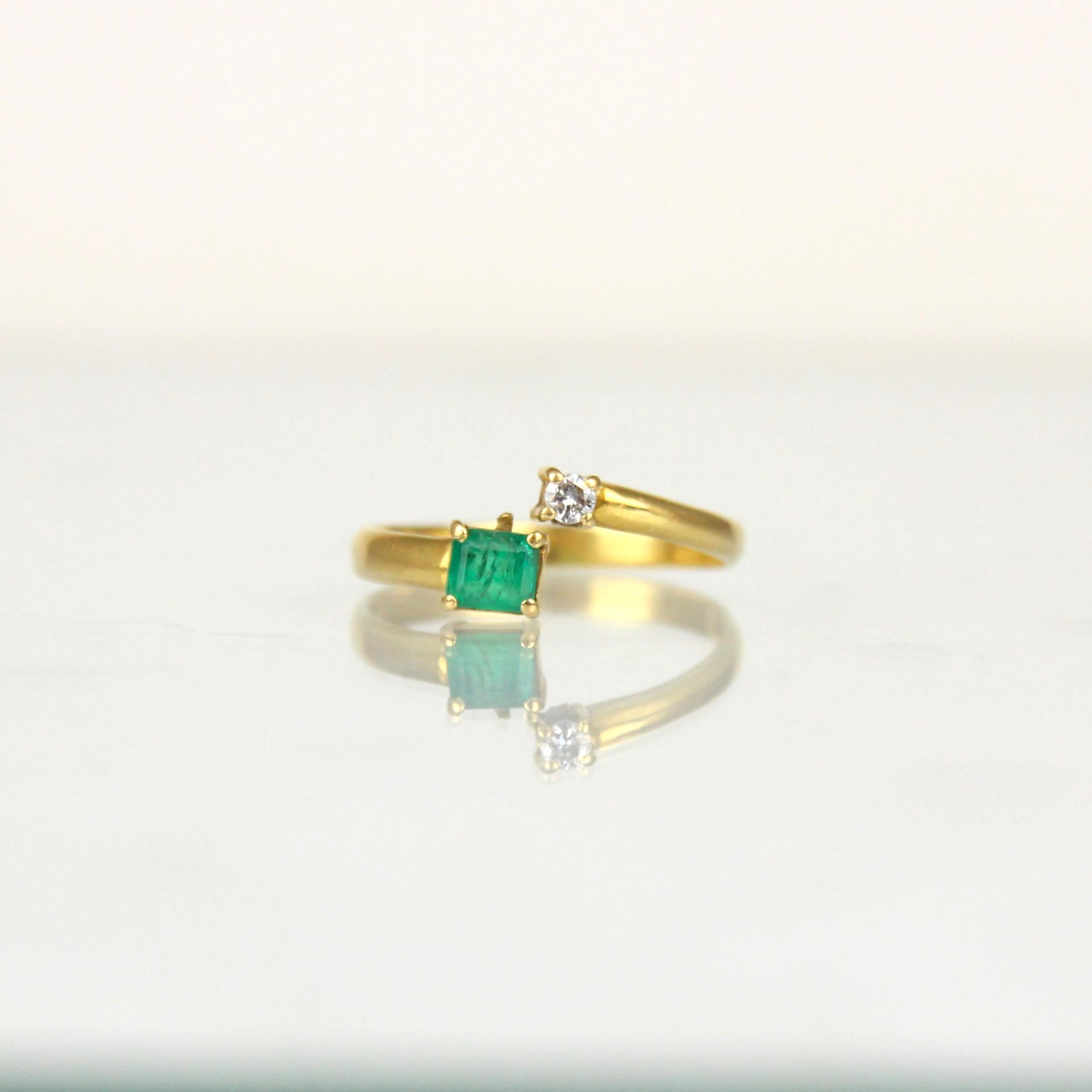 A bespoke diamond and untested emerald ‘toi et moi’ ring, the square cut emerald within yellow metal claw setting with round cut diamond to opposite side, with plain polished yellow metal shank, stamped ‘18k’ ring size P, 2gms, total emerald weight estimated 0.30ct