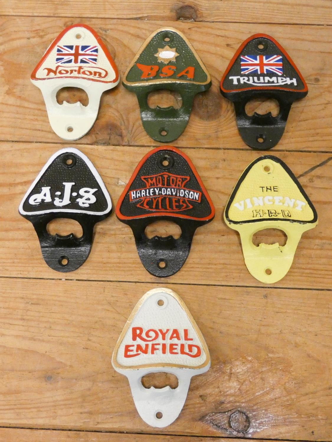 A collection of motorcycle interest cast iron bottle openers
