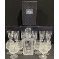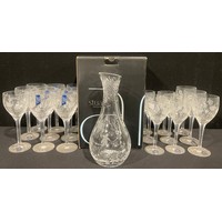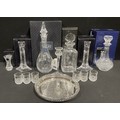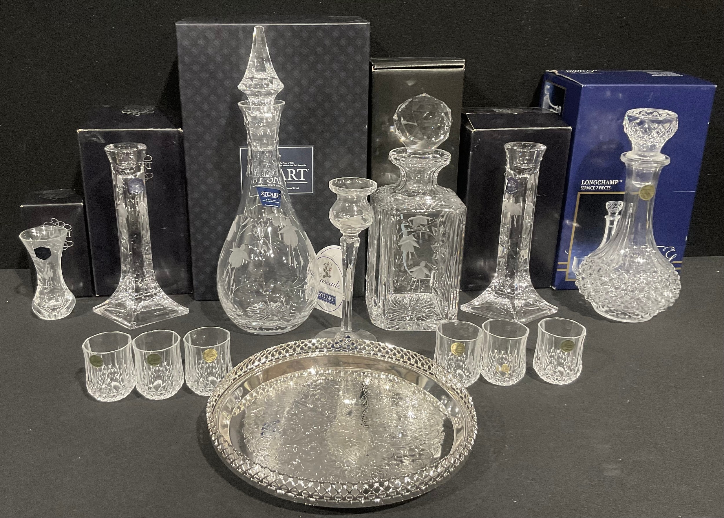 A Stuart Crystal Cascade pattern decanter and stopper, 34cm, paper label, engraved mark, boxed; another Cascade pattern square shaped decanted and stopper, 26cm, paper label, engraved mark, boxed; a pair of Cascade pattern candlesticks, 21cm, boxed; a small Cascade vase, boxed; a candlestick; a Cristal d'Arques decanter set on plated tray, boxed (7)