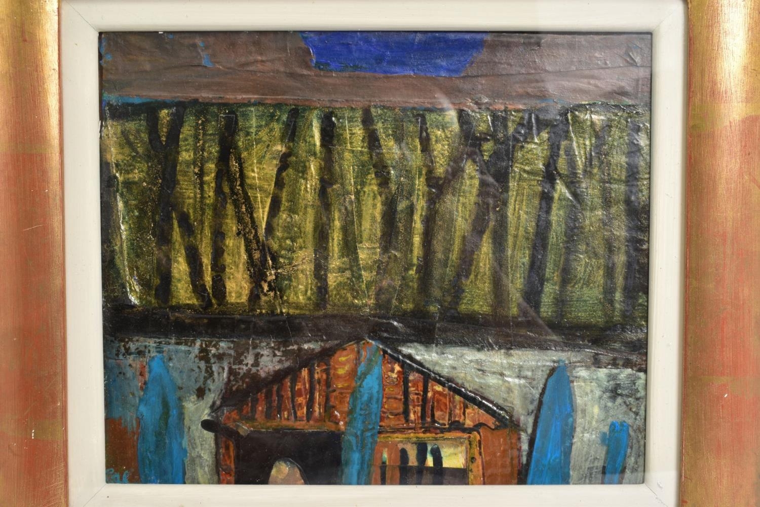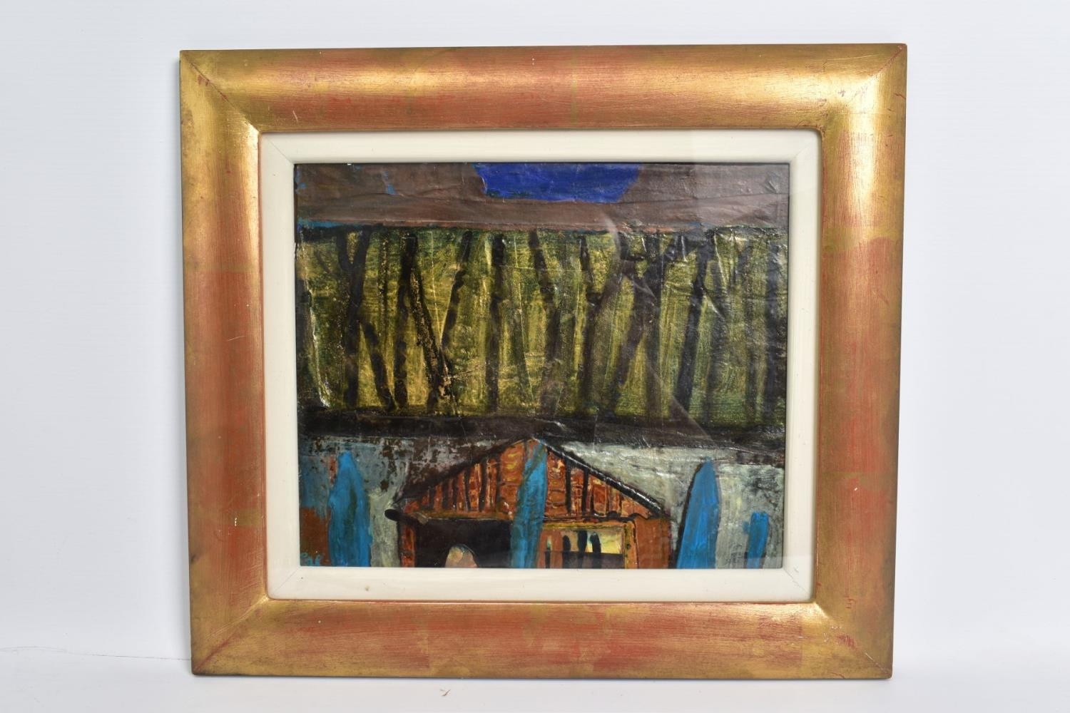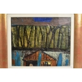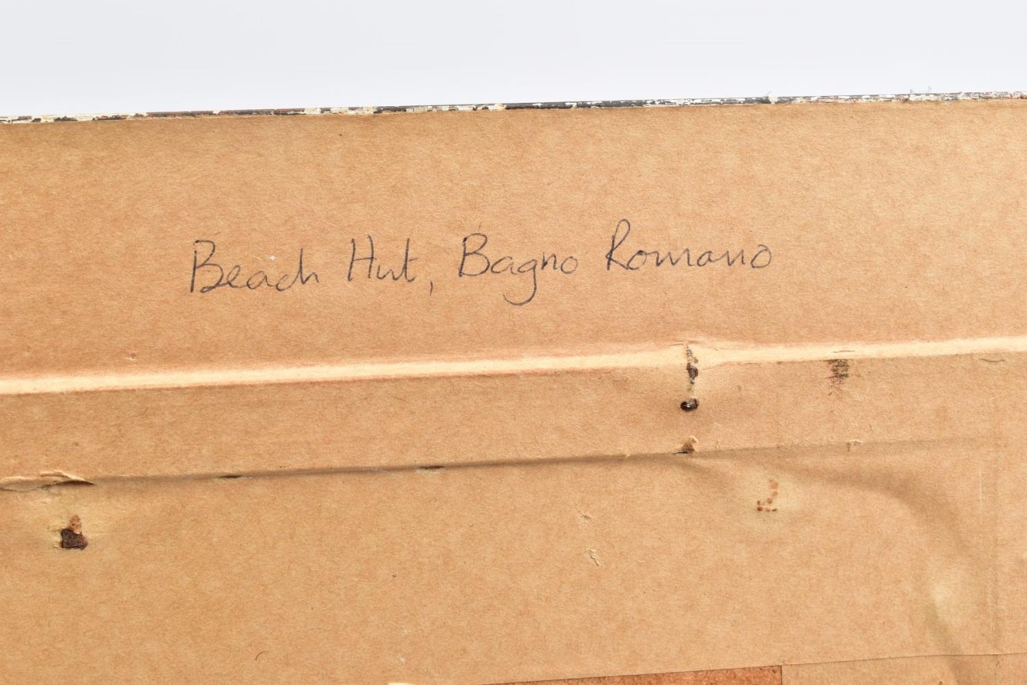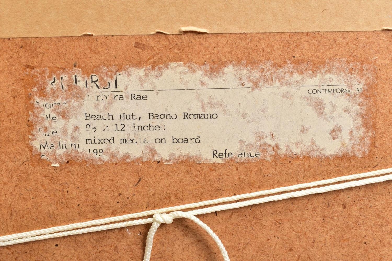 BARBARA RAE CBE R.A RSA. FRSE (SCOTTISH 1943) 'BEACH HUT, BAGNO ROMANO' a view of an Italian beach, signed bottom left, gallery labels for The Scottish Gallery and Art First verso, oil/mixed media on board, framed and glazed, approximate size 24cm x 30cm (A) (condition:- the artwork is in good condition, small amount of paint loss to the frame)