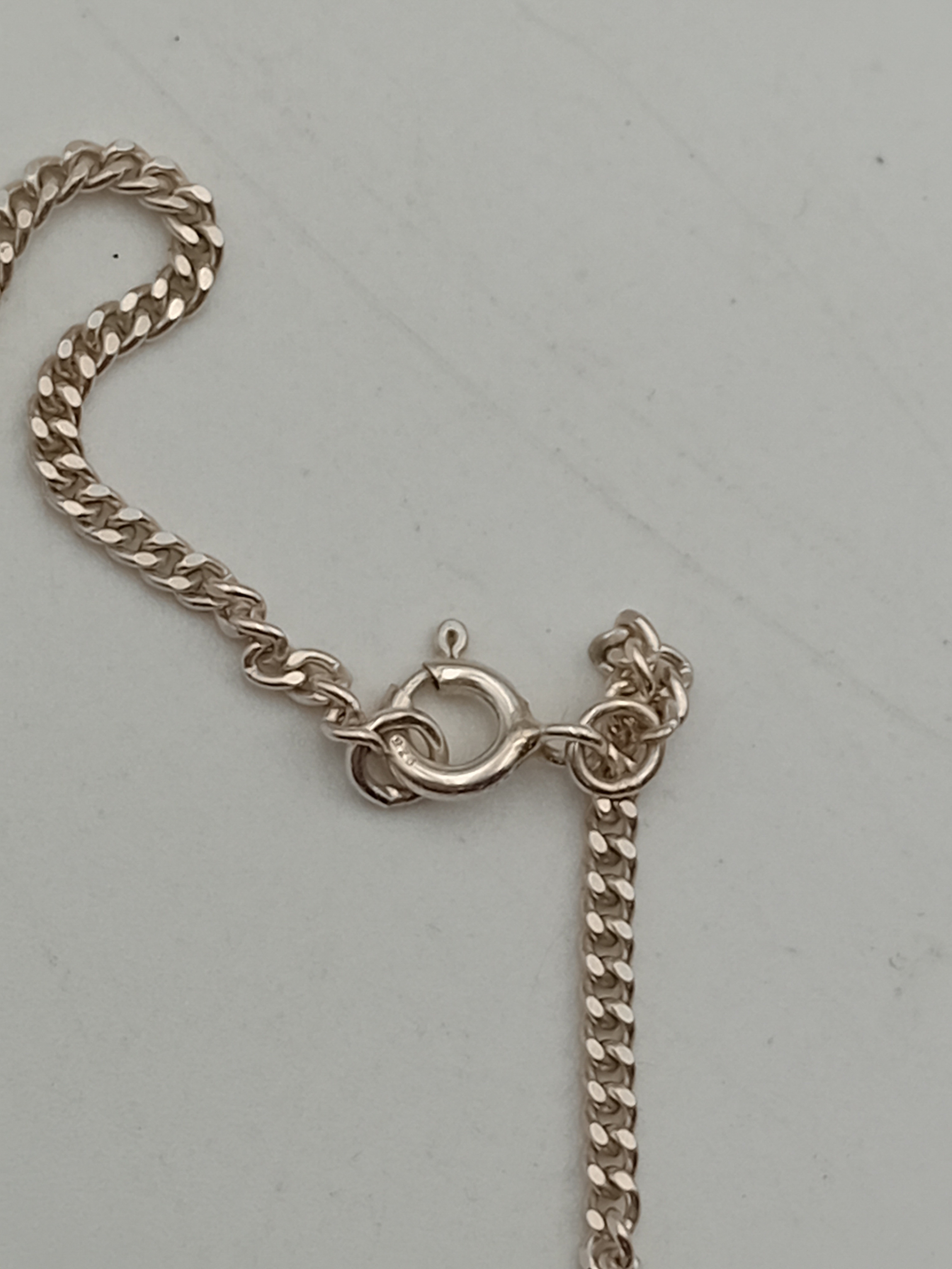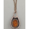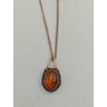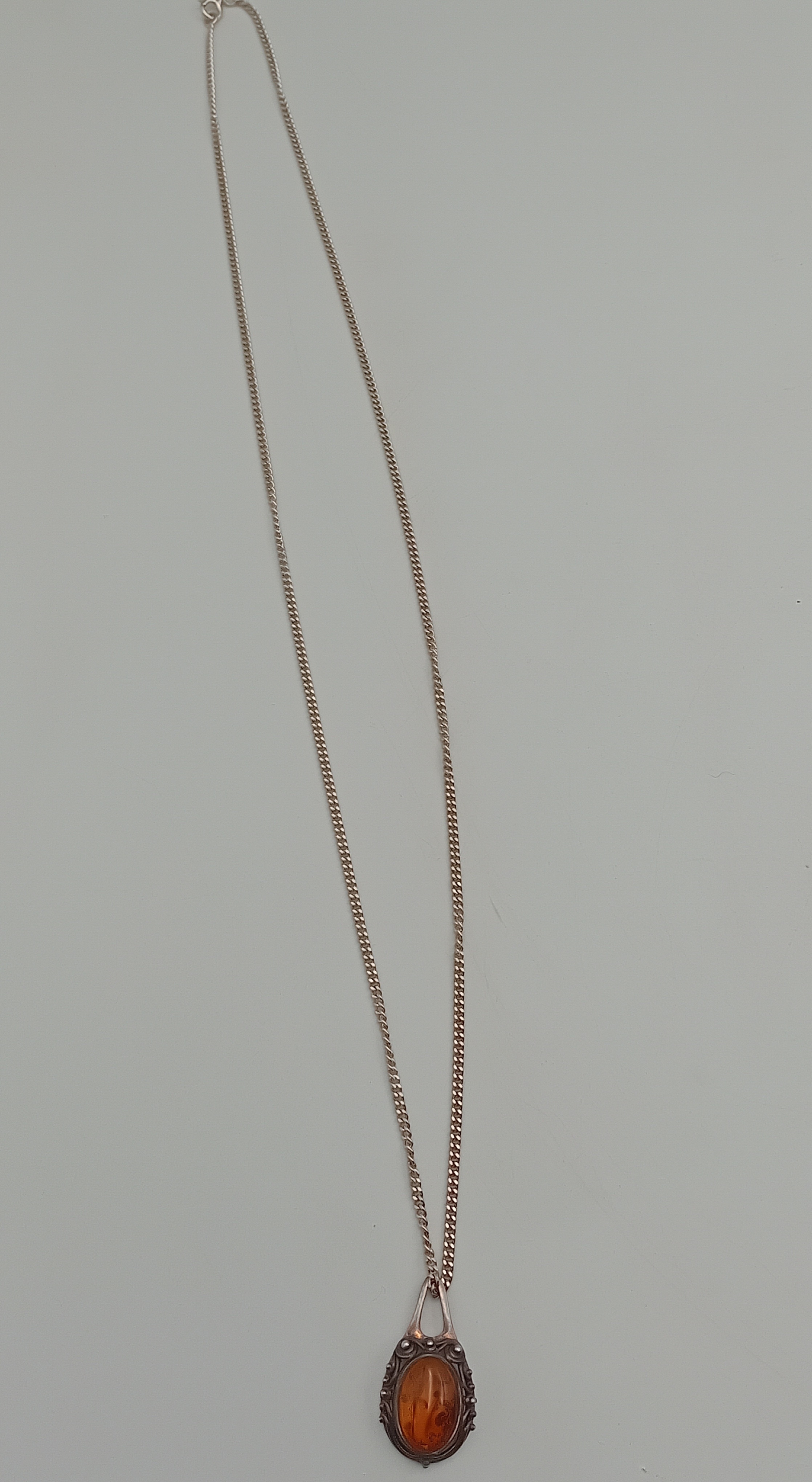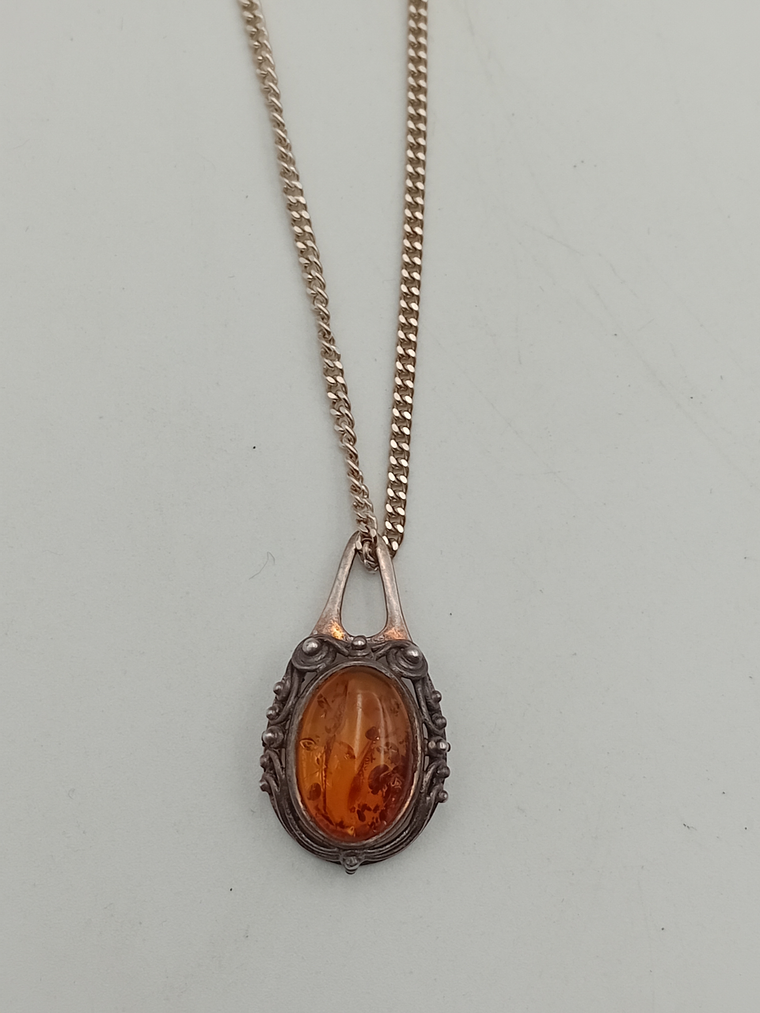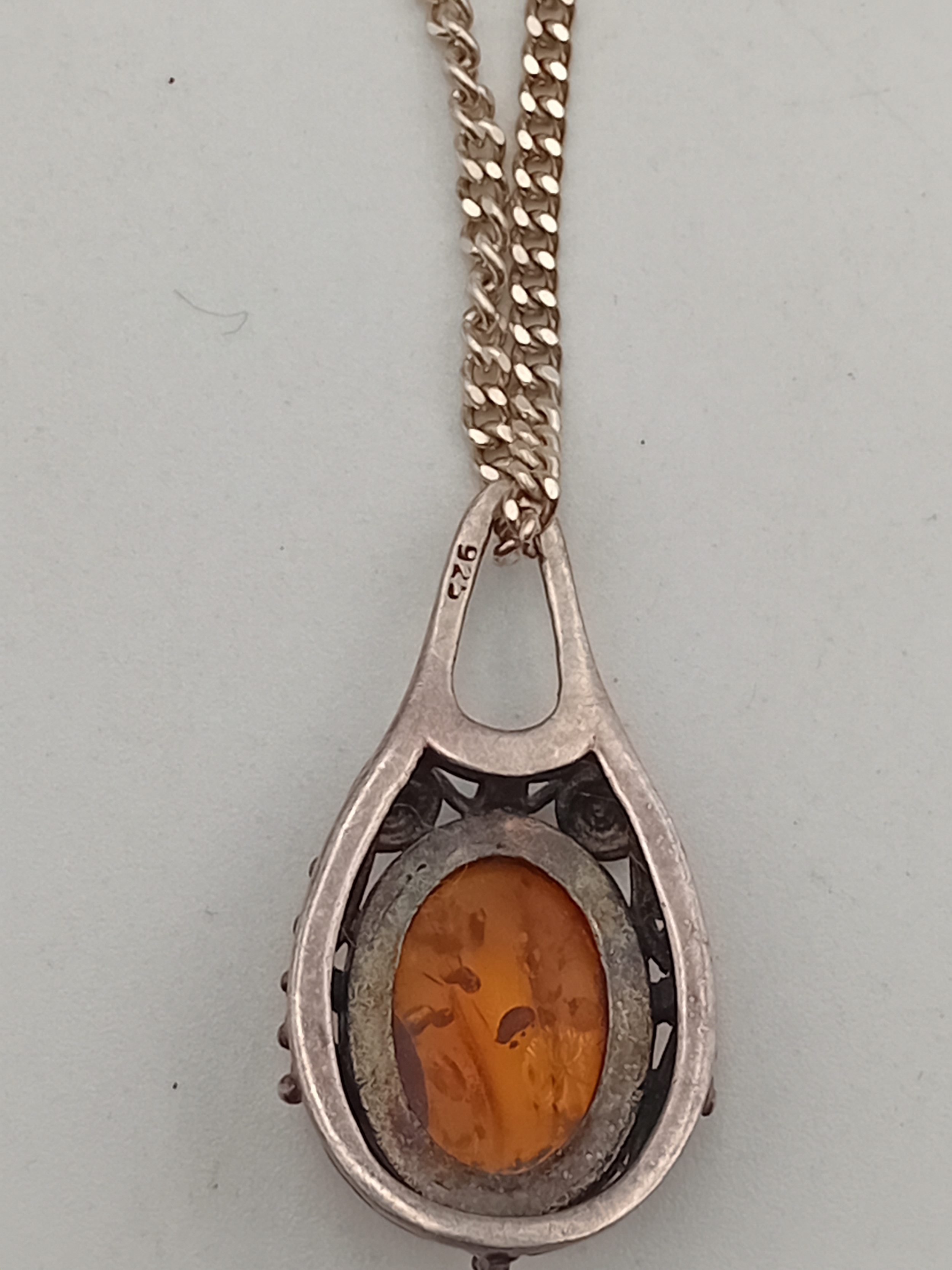A stamped 925 silver amber pendant on a stamped 925 silver necklace.