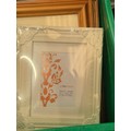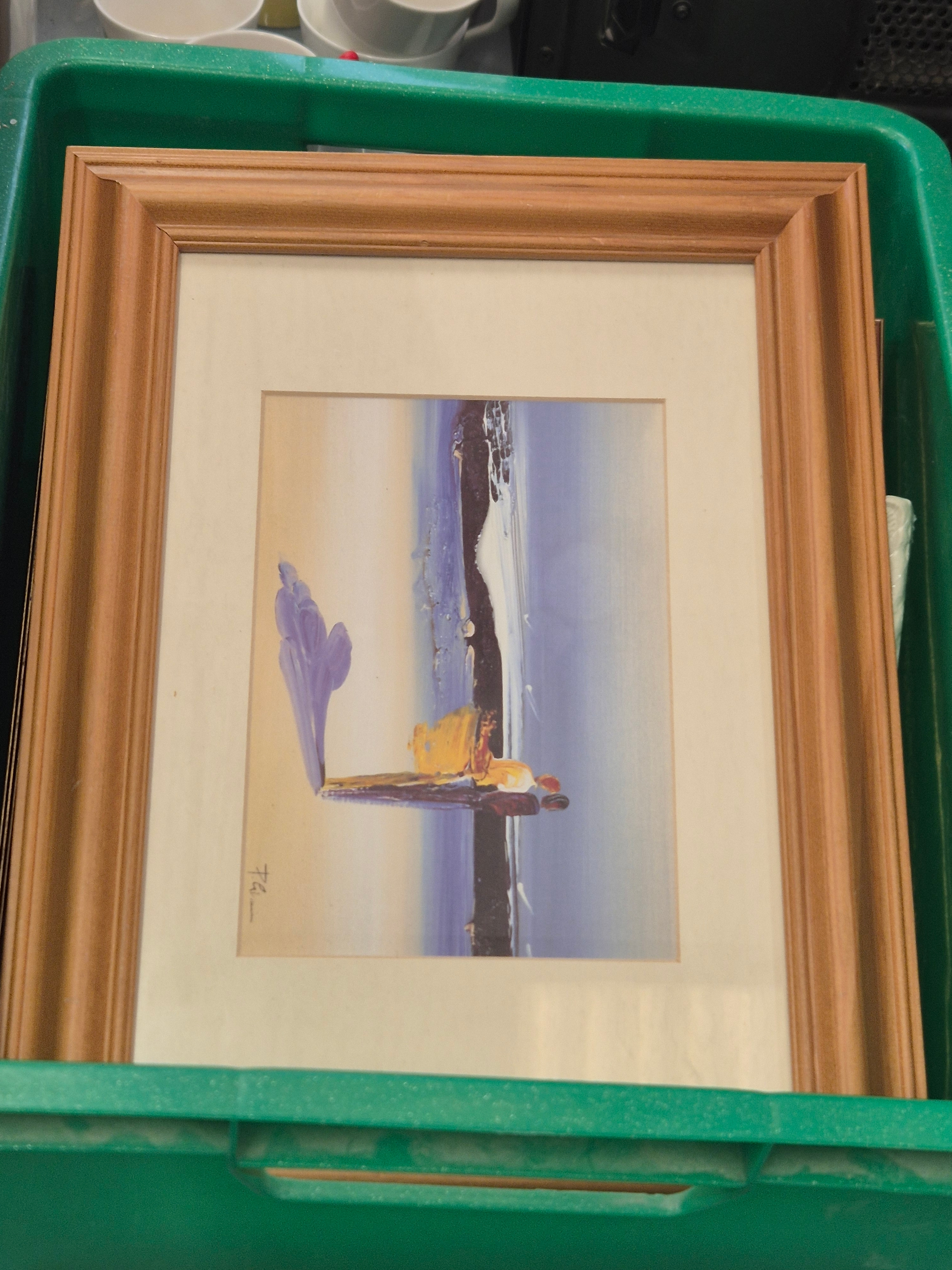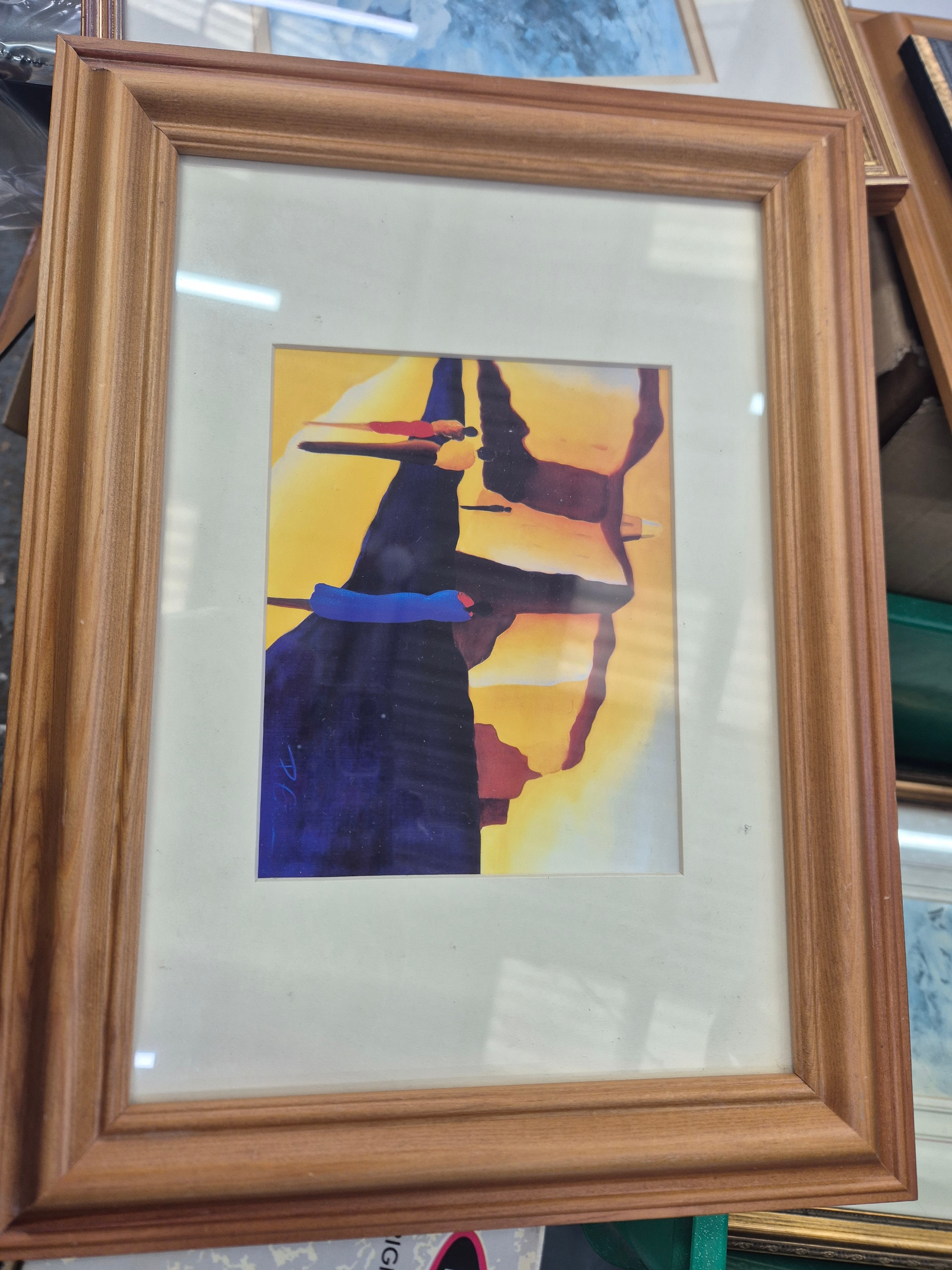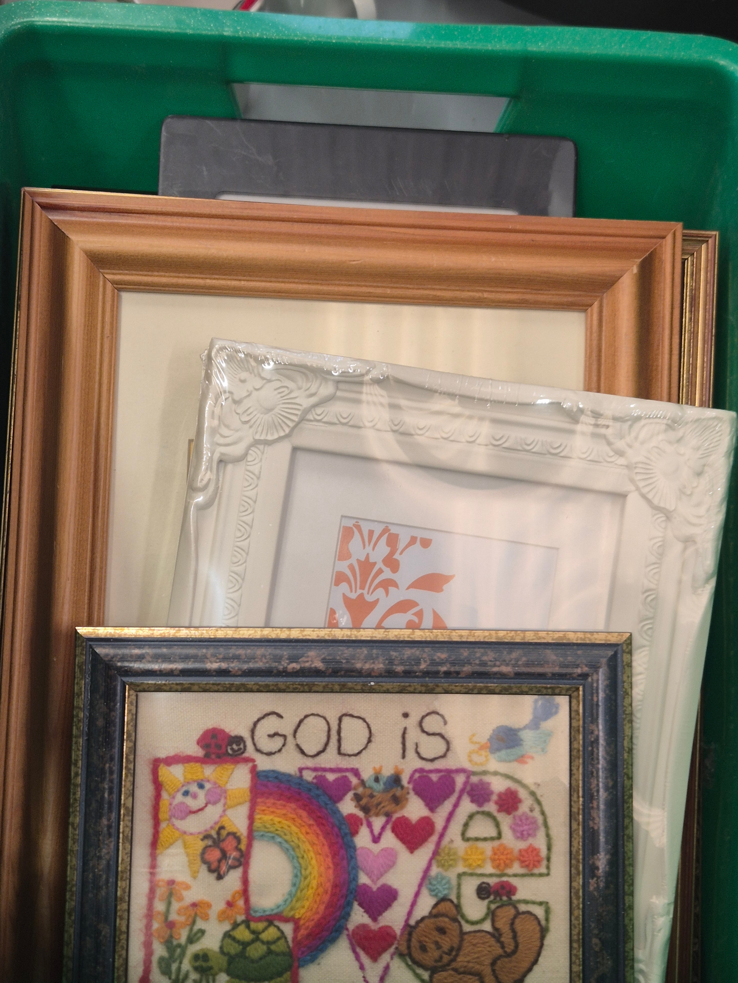 Box of framed and glazed prints plus a God is love tapestry picture and a new picture frame