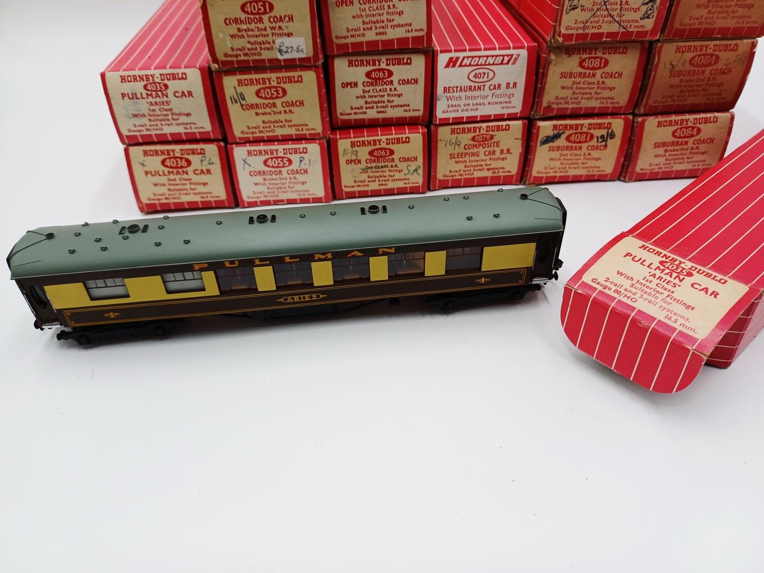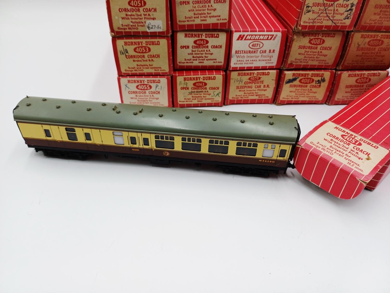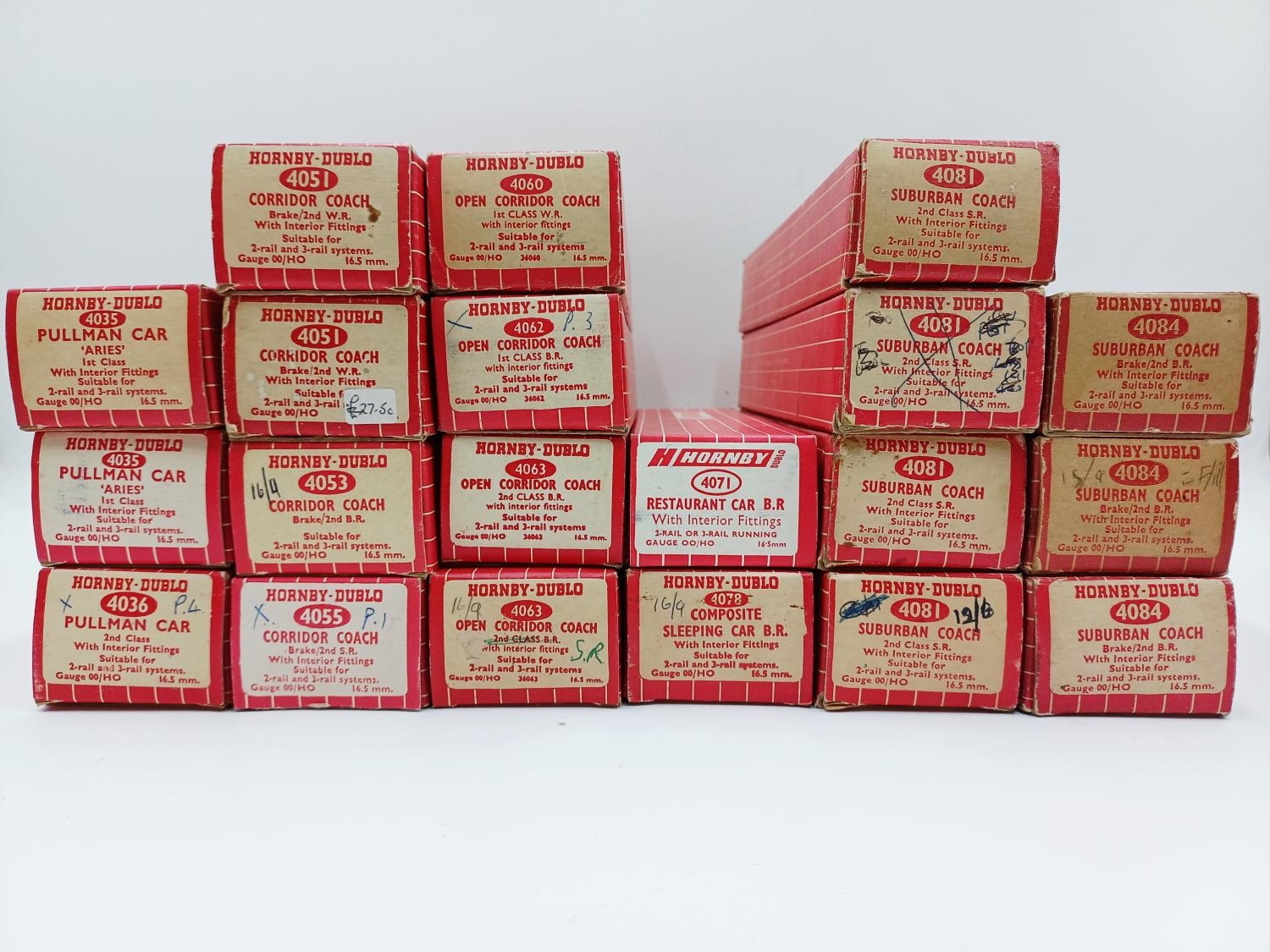 Twenty boxed Hornby Dublo 00 gauge passenger coaches to include 4063 open corridor coach, 4051 corridor coach, 4084 suburban coach, 4035 Pullman car, 4055 corridor coach etc.