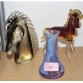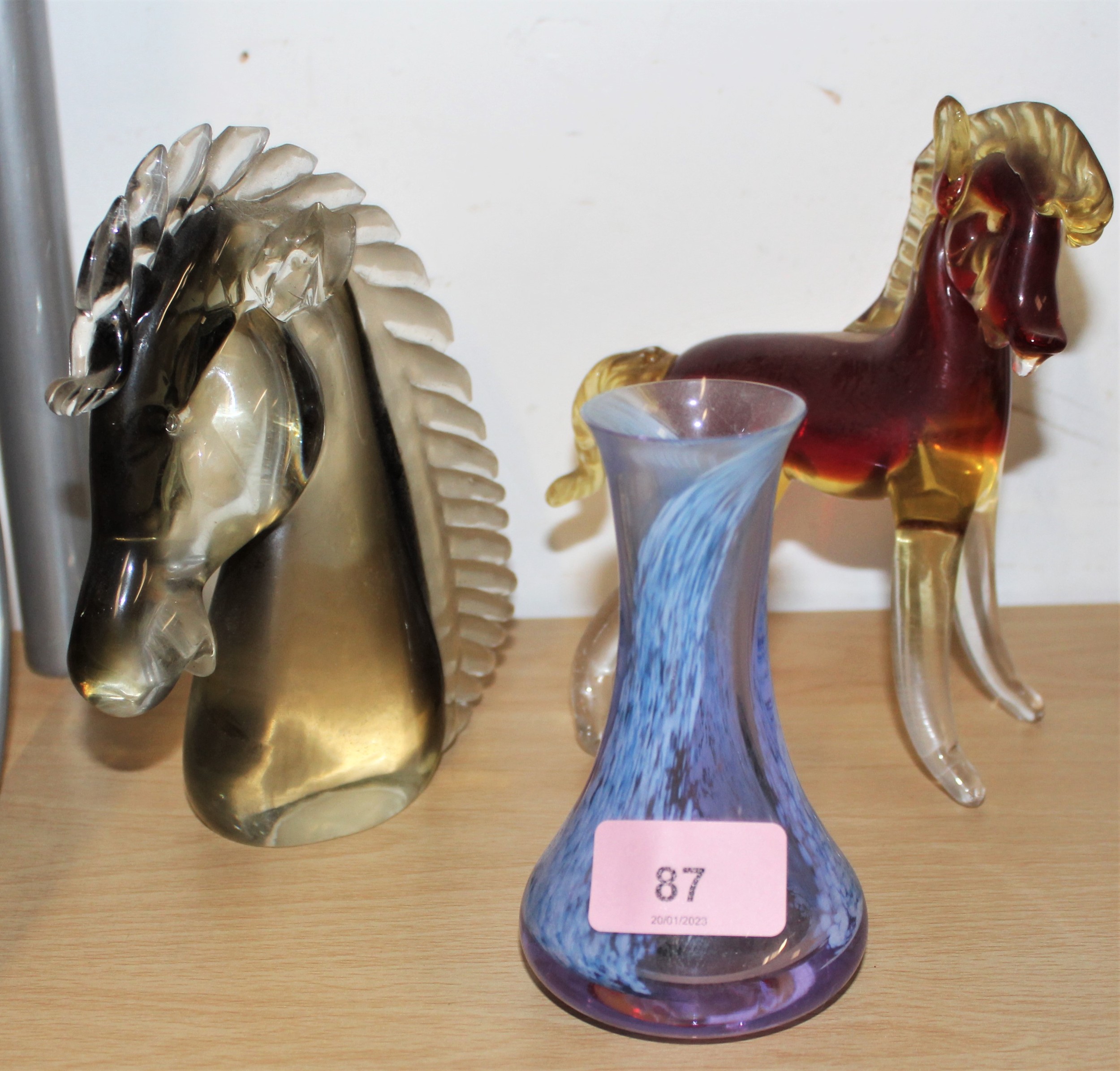 Two Glass Ornamental Equine Figures (One has breaks to Ears) Plus a Coloured Glass Vase