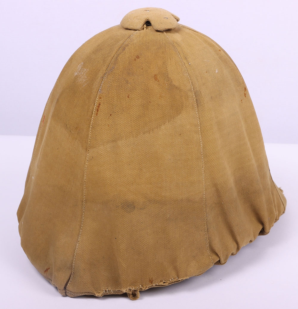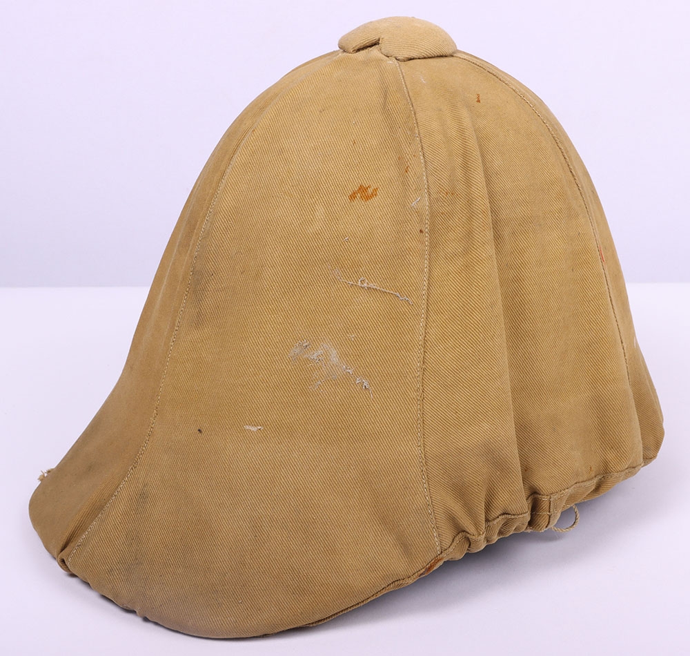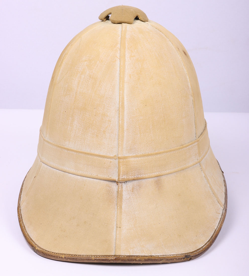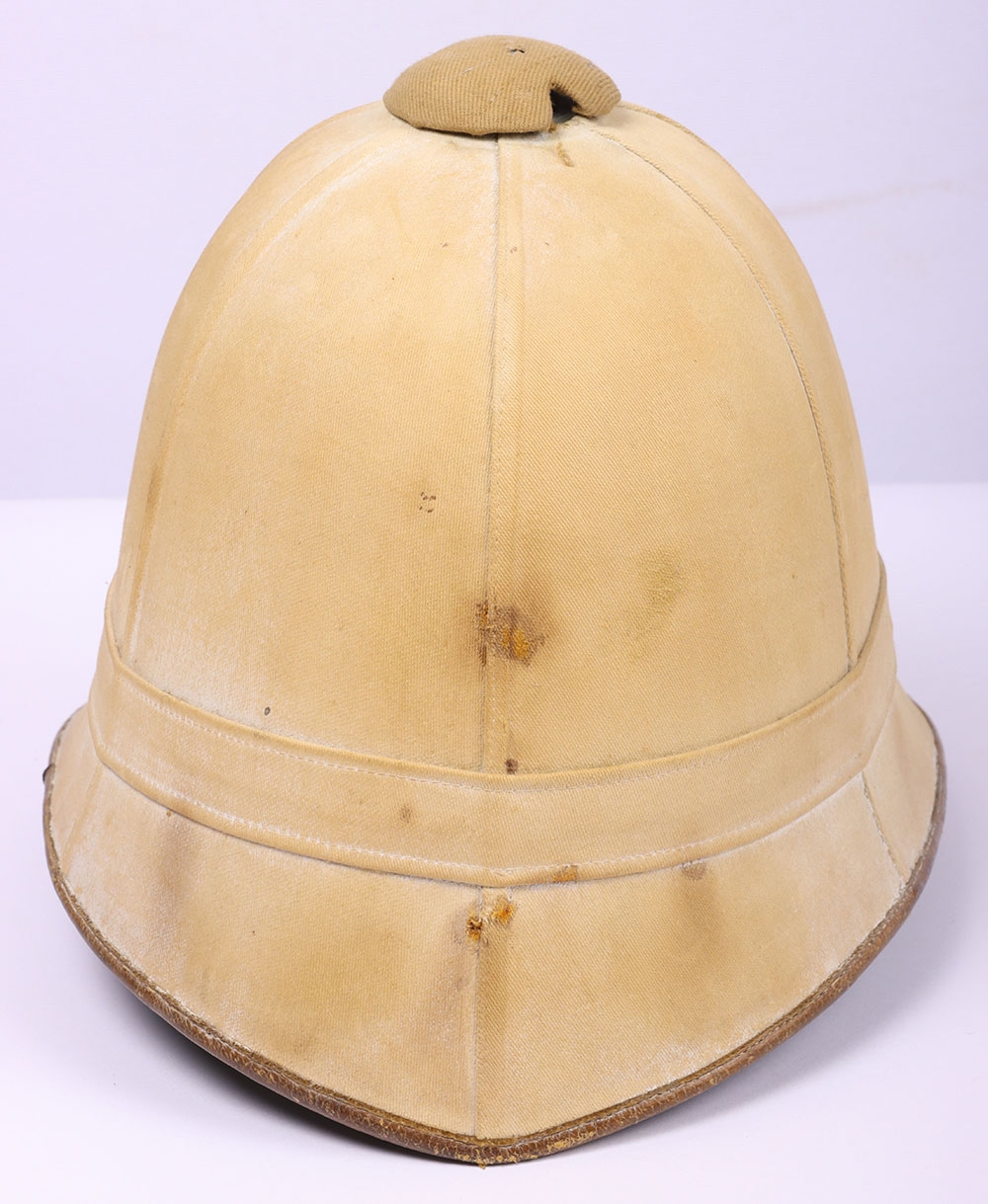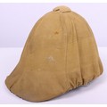 Zulu Wars Period Officers Foreign Service Helmet, good example of a officers Zulu war period officers panelled foreign service helmet which retains its original khaki cloth cover. Brown leather trim to the brim of the helmet. Green cloth covering to the interior of the helmet. Tan leather sweatband and leather tailors label to the interior crown. Thin brown leather chinstrap. Some wear but generally still a good example.