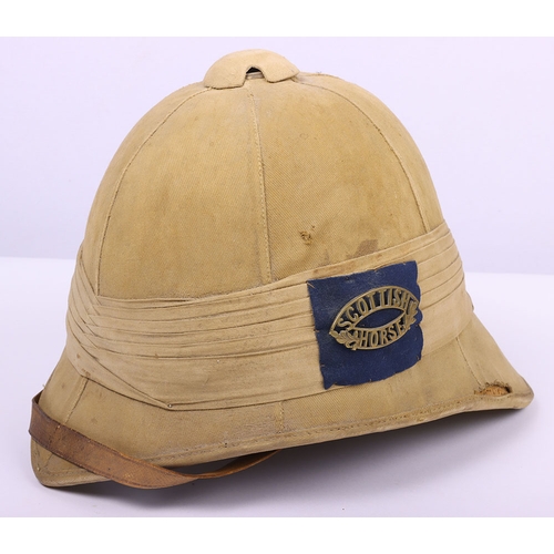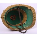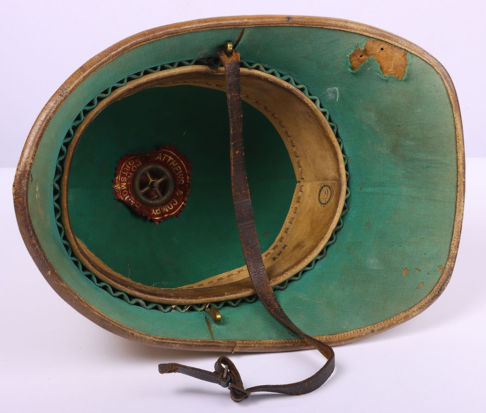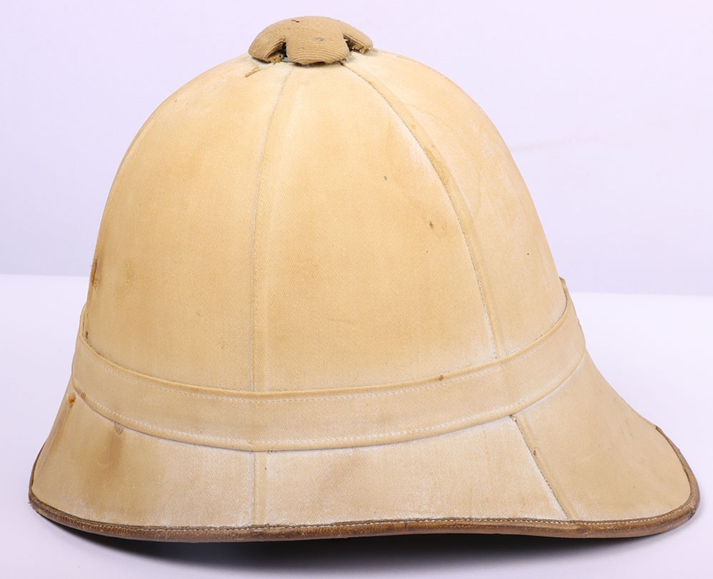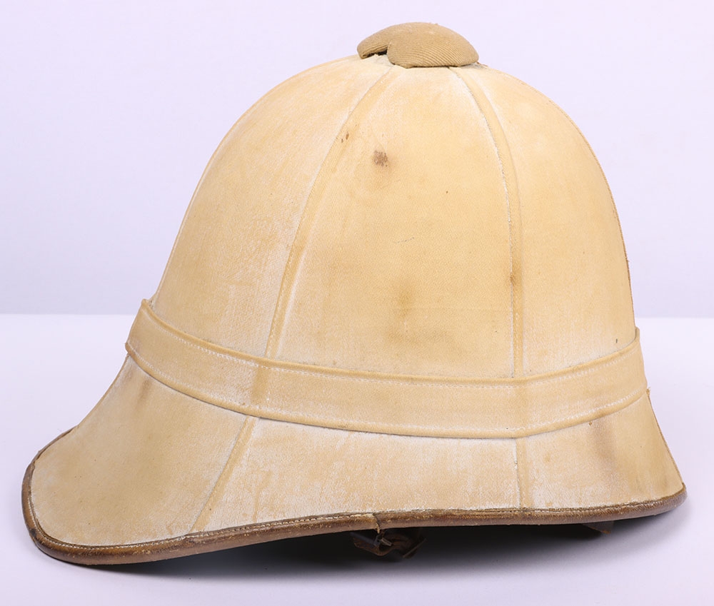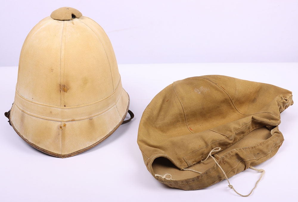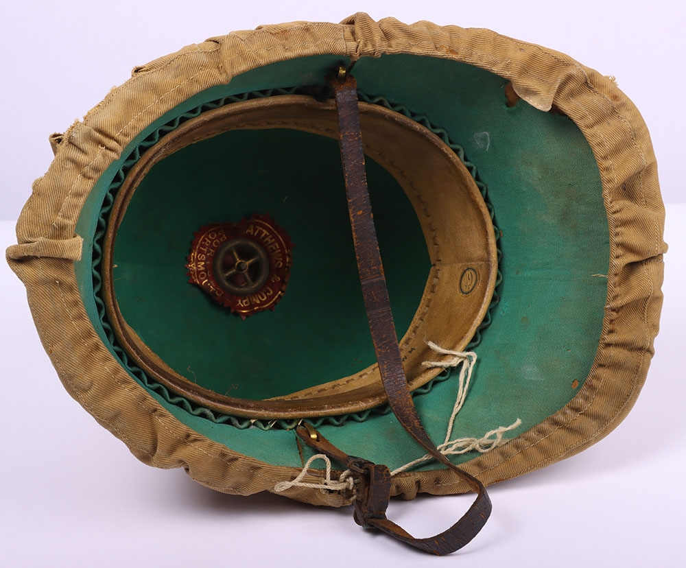 Zulu Wars Period Officers Foreign Service Helmet, good example of a officers Zulu war period officers panelled foreign service helmet which retains its original khaki cloth cover. Brown leather trim to the brim of the helmet. Green cloth covering to the interior of the helmet. Tan leather sweatband and leather tailors label to the interior crown. Thin brown leather chinstrap. Some wear but generally still a good example.