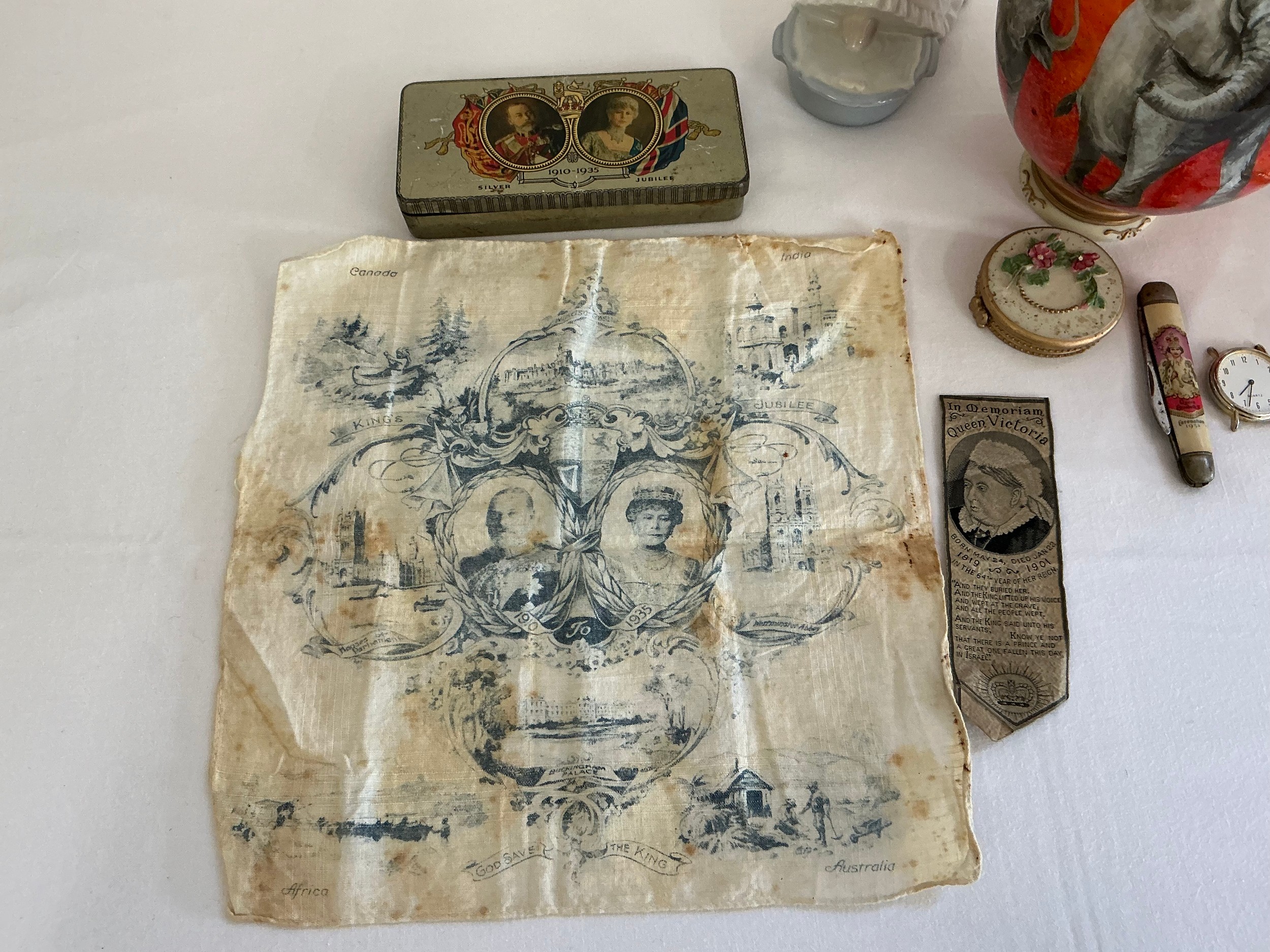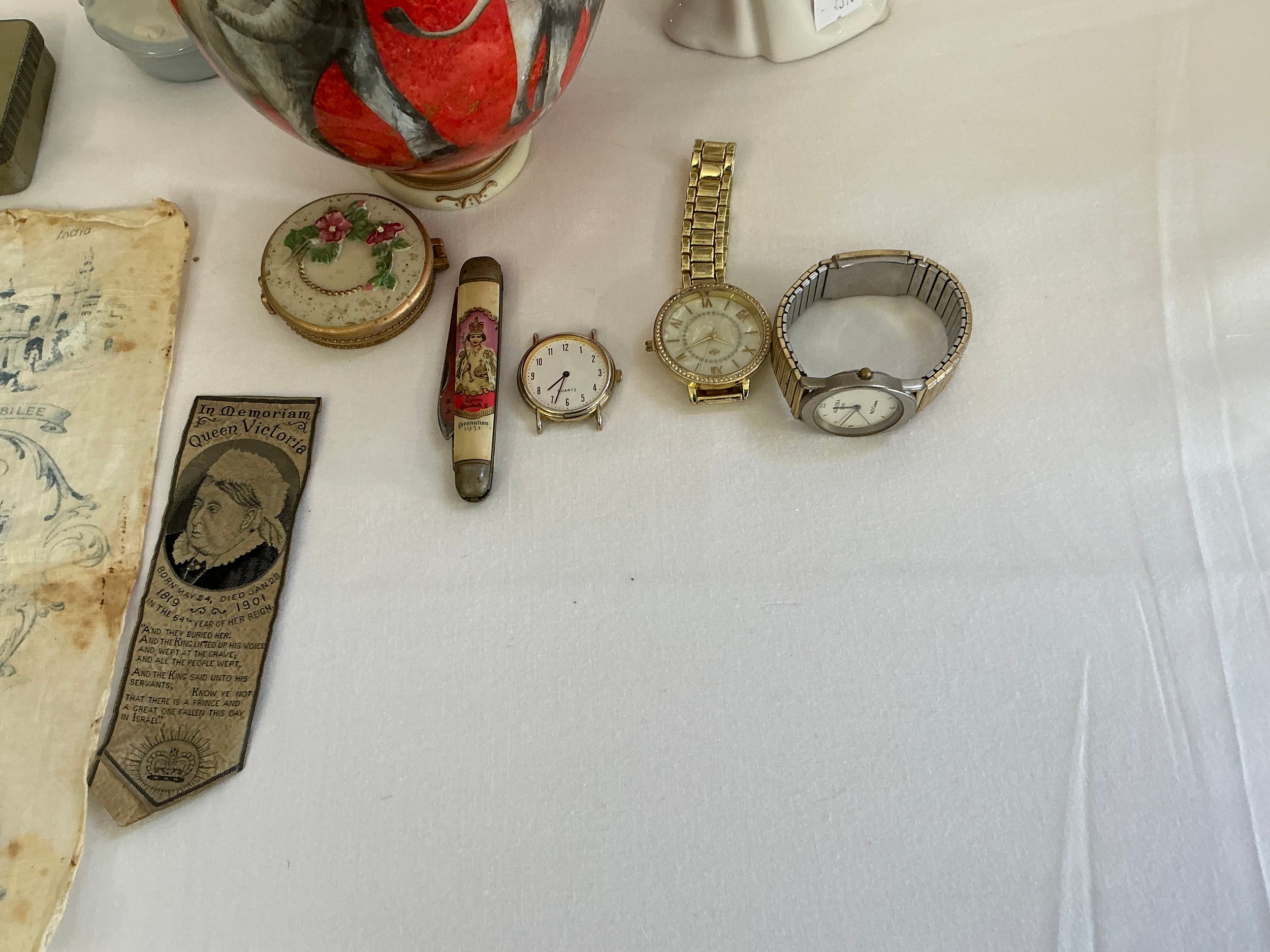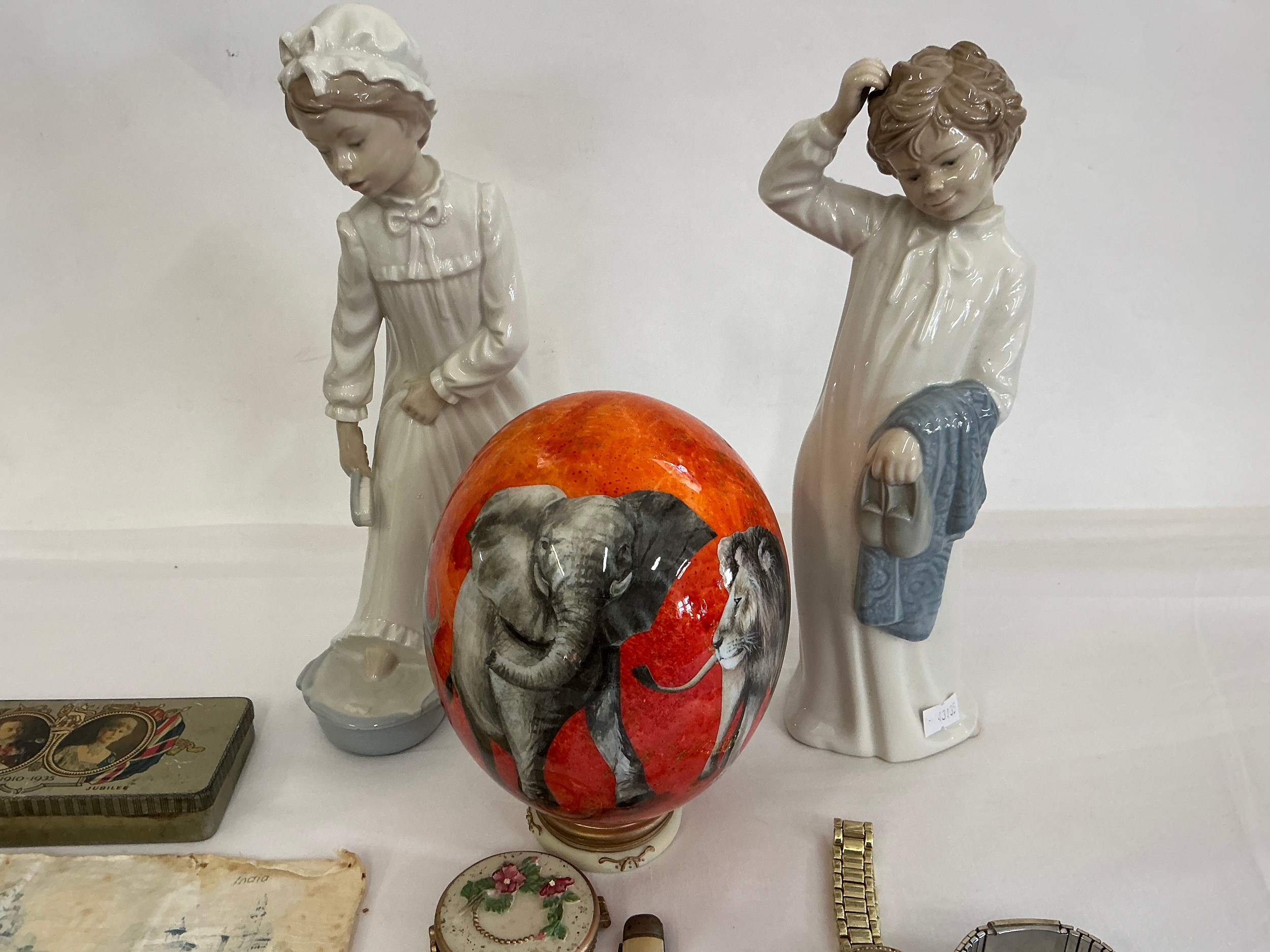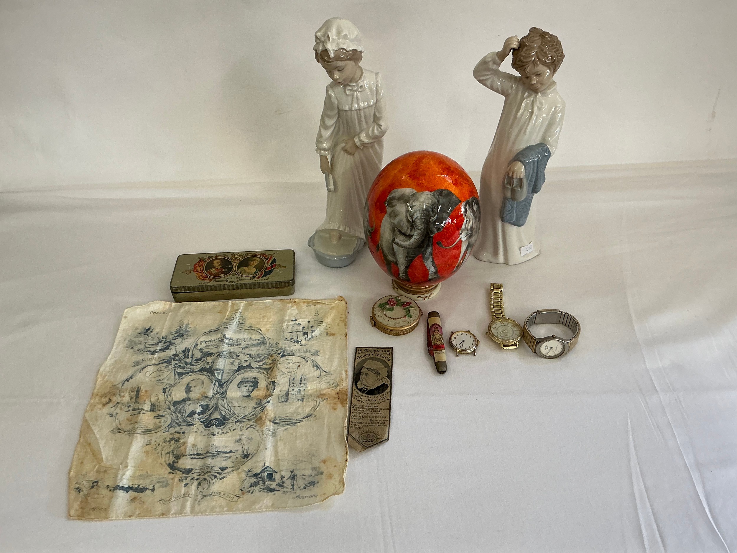 A Pair of Nao Figurines, a Painted Ostrich Egg by Stanley Rowe, three Wristwatches, Queen Victoria Book mark, etc.