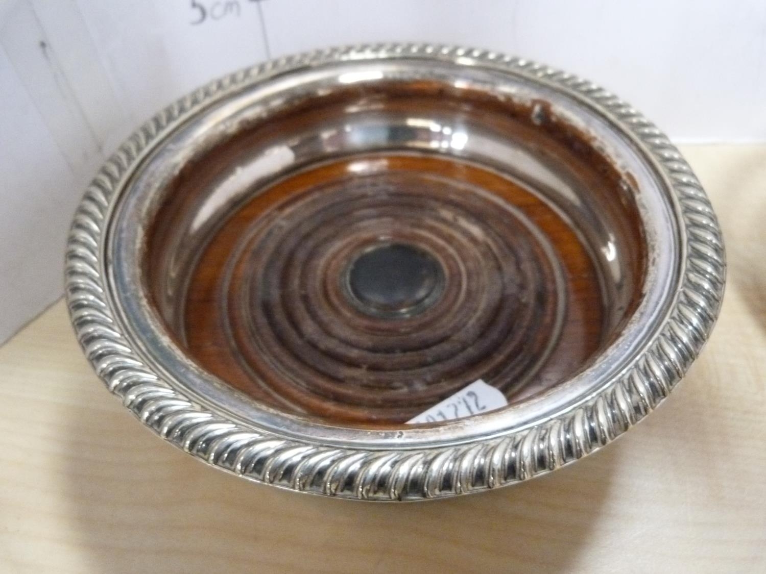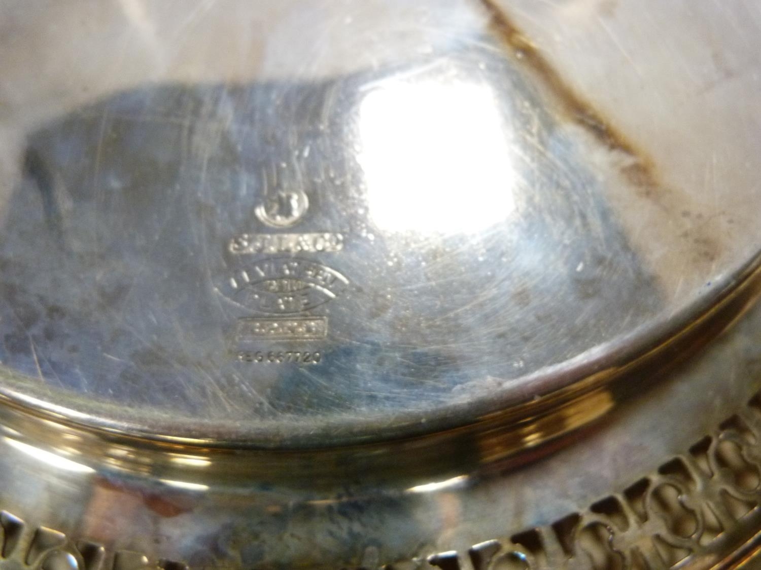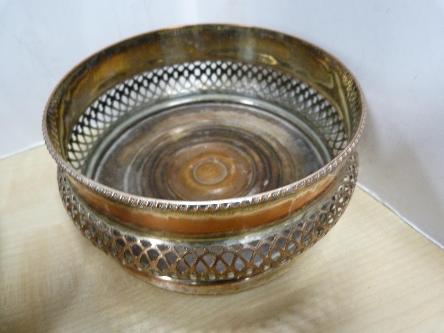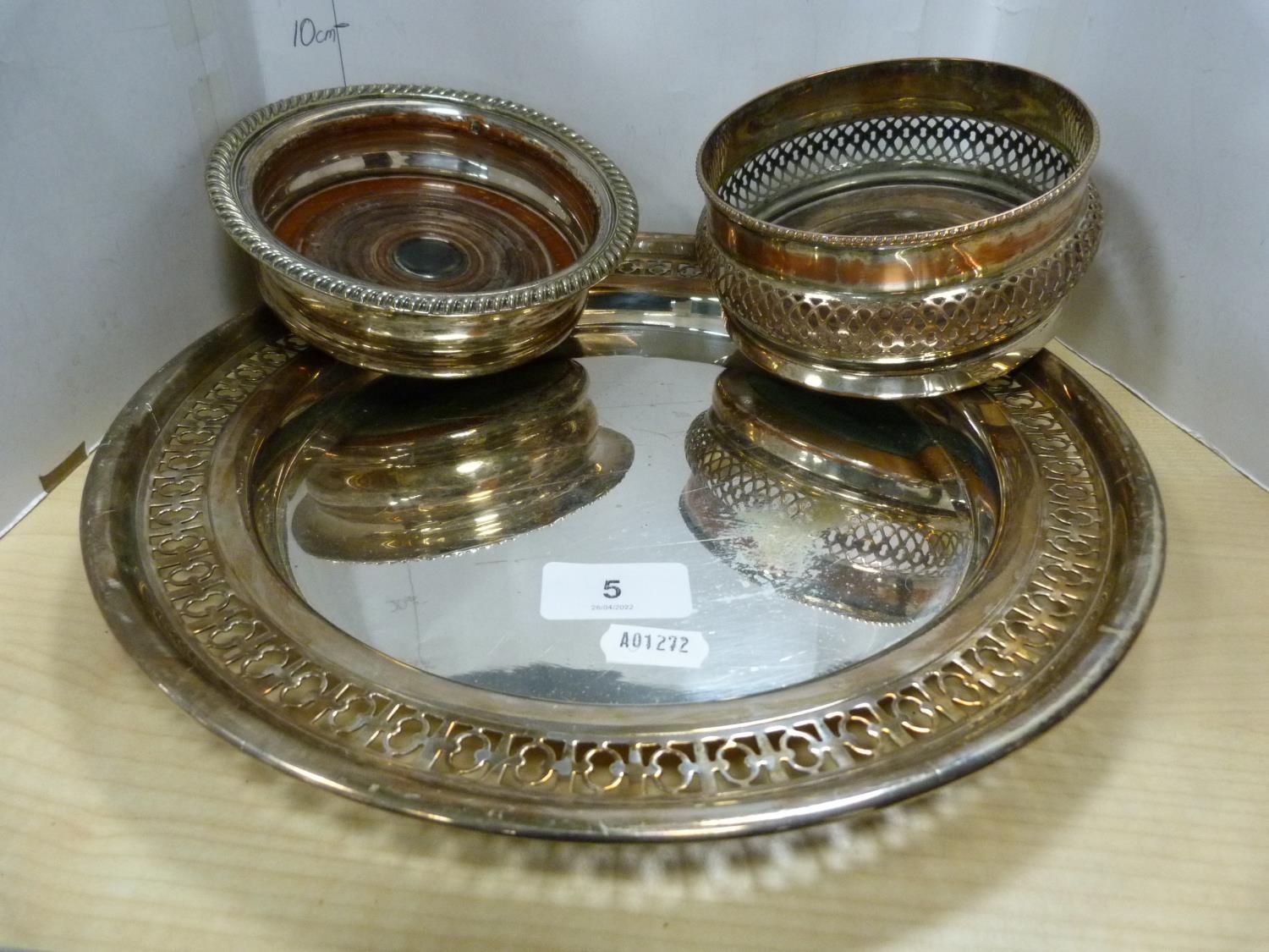 EP pierced plate and two EP wine slides with wooden interiors.