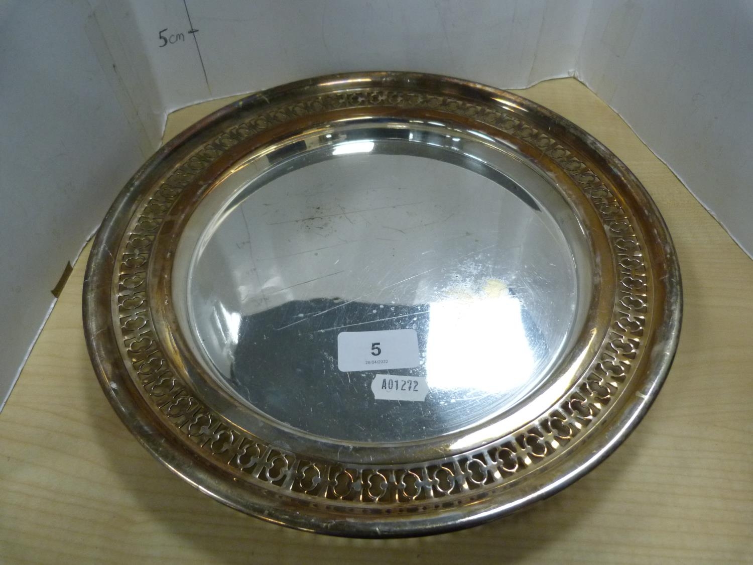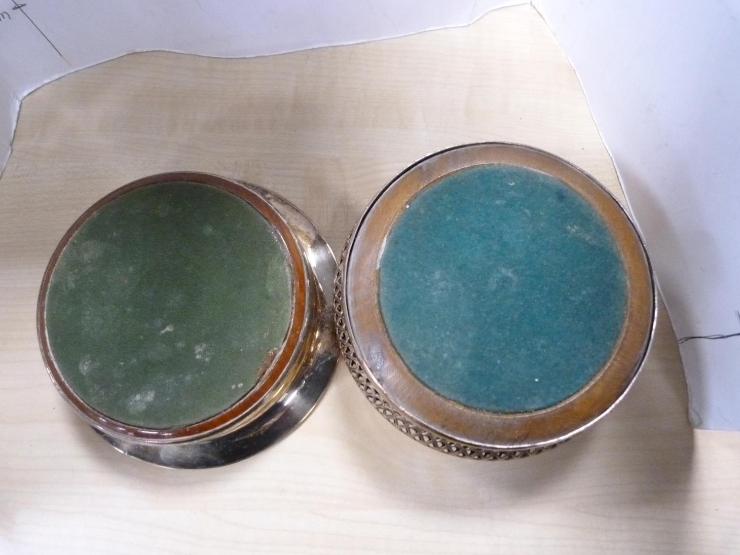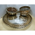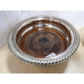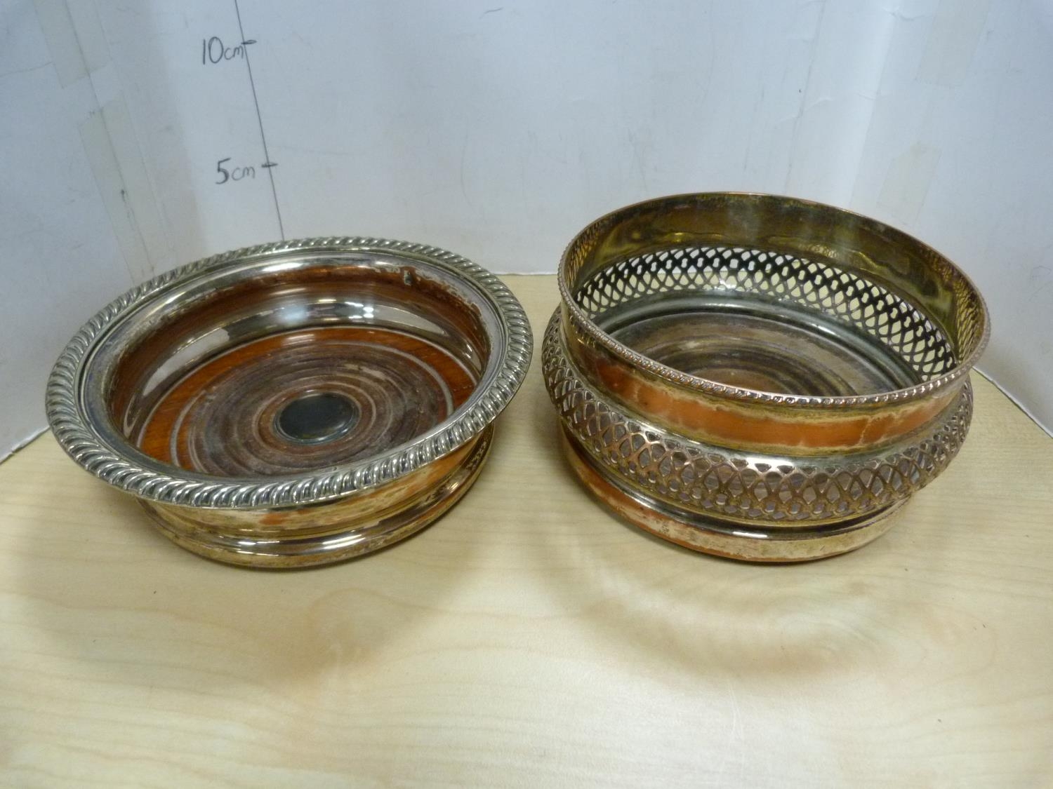 EP pierced plate and two EP wine slides with wooden interiors.