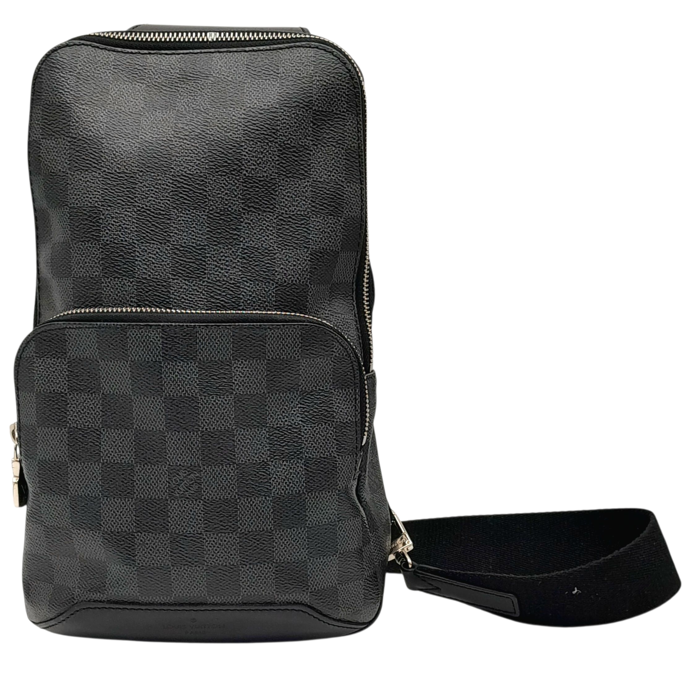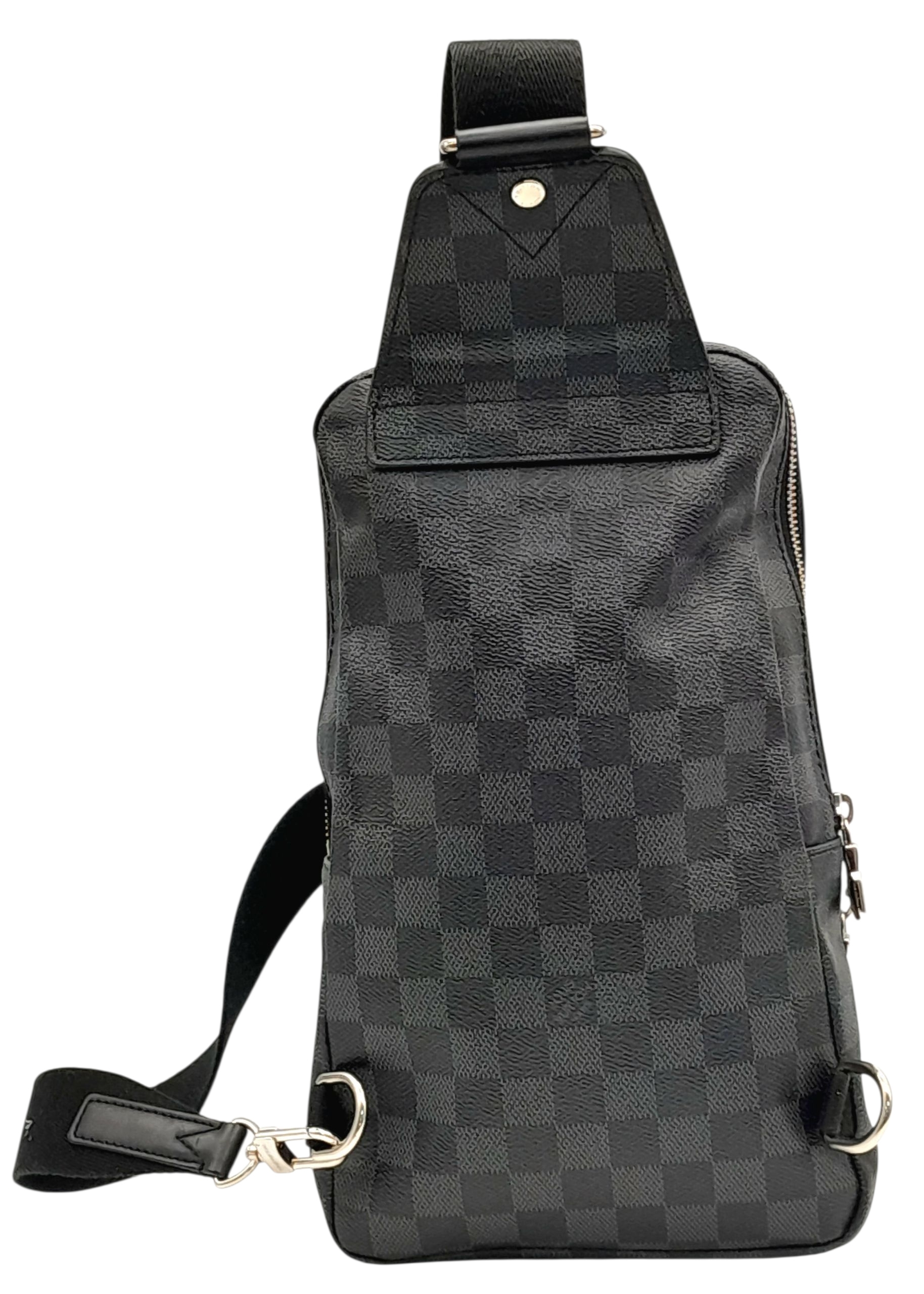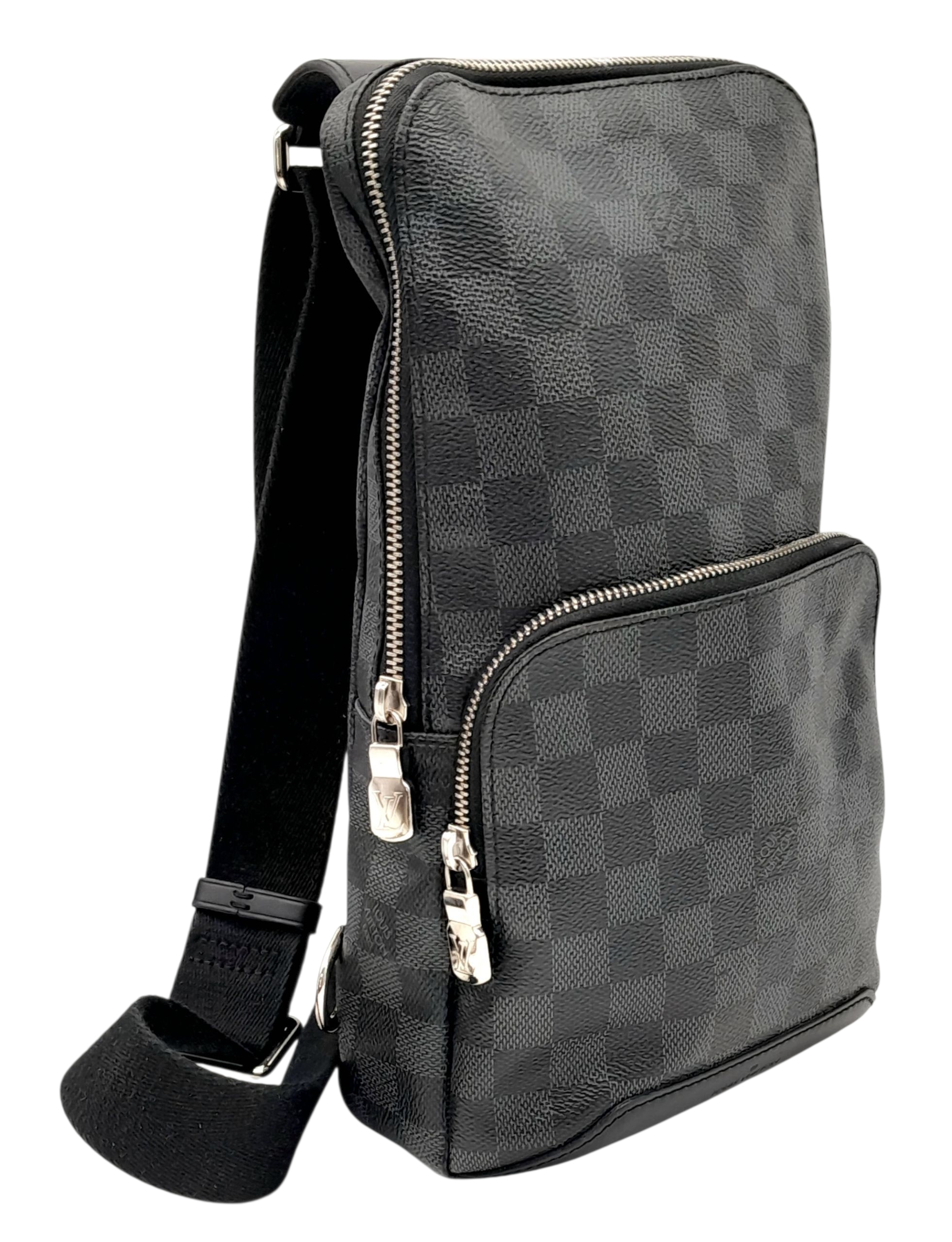 A Louis Vuitton Damier Graphite Avenue Sling Bag. Black and grey Damier Graphite coated canvas exterior with silver-toned hardware, single adjustable canvas strap, a zipped closures and a front zipped pocket. Black textile interior with a single open compartment and slip pocket. Some scratches exterior and some stains interior. Approx 20cm length x 32cm height x 5cm depth. Please see photos or request a condition report. REF: STK024490