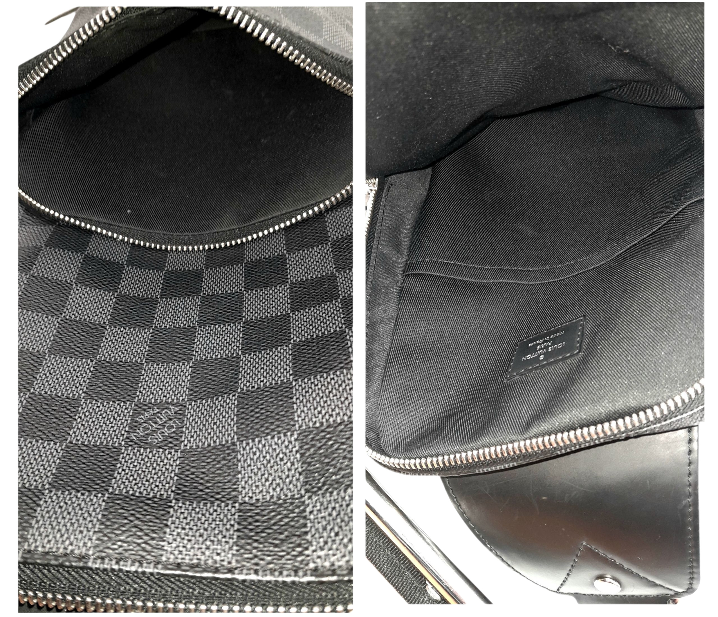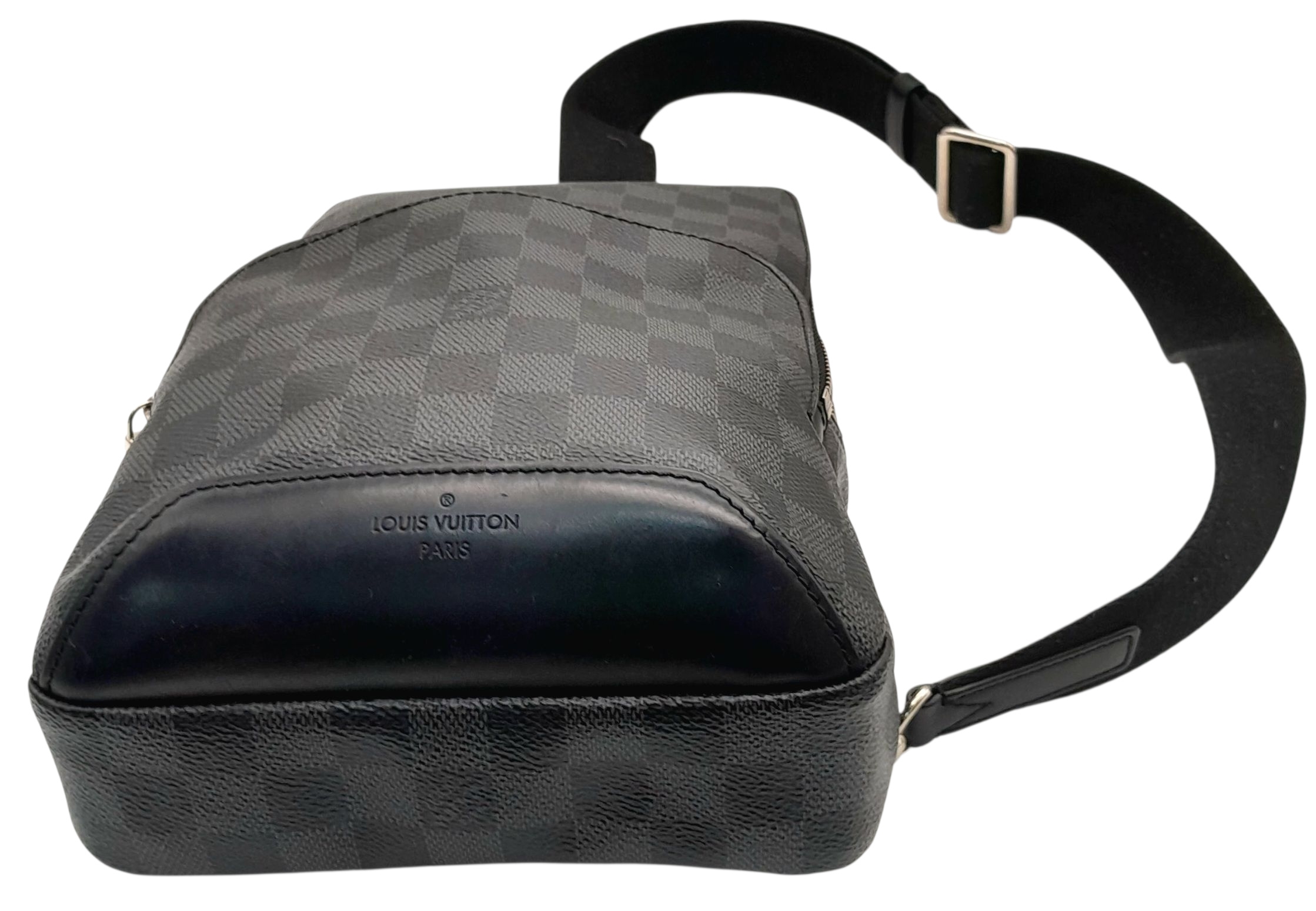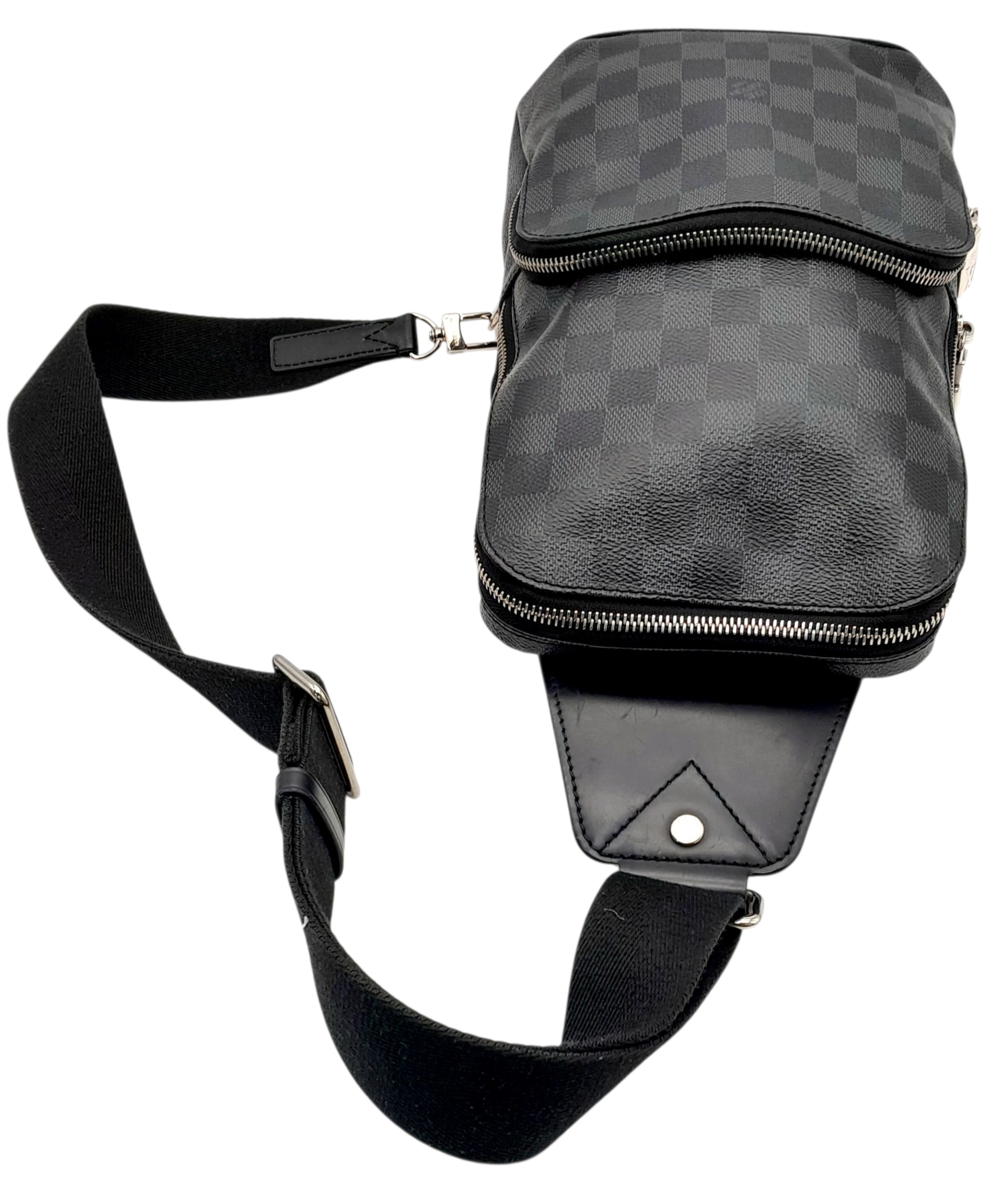 A Louis Vuitton Damier Graphite Avenue Sling Bag. Black and grey Damier Graphite coated canvas exterior with silver-toned hardware, single adjustable canvas strap, a zipped closures and a front zipped pocket. Black textile interior with a single open compartment and slip pocket. Some scratches exterior and some stains interior. Approx 20cm length x 32cm height x 5cm depth. Please see photos or request a condition report. REF: STK024490