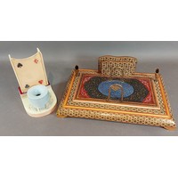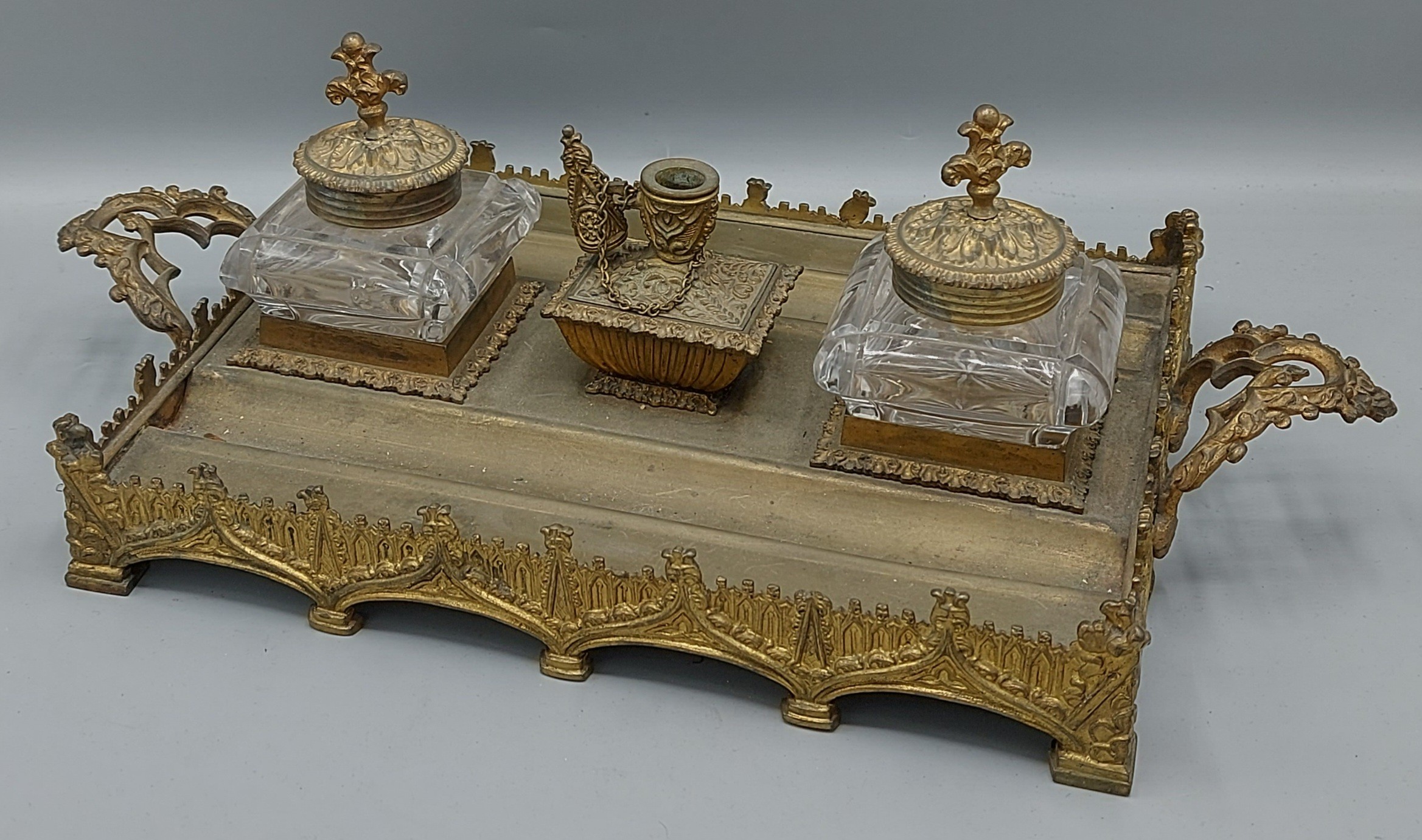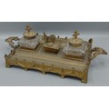A 19th Century gilt metal inkstand with two glass inkwells and central candlestick and with shaped end handles, 41cms wide
