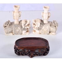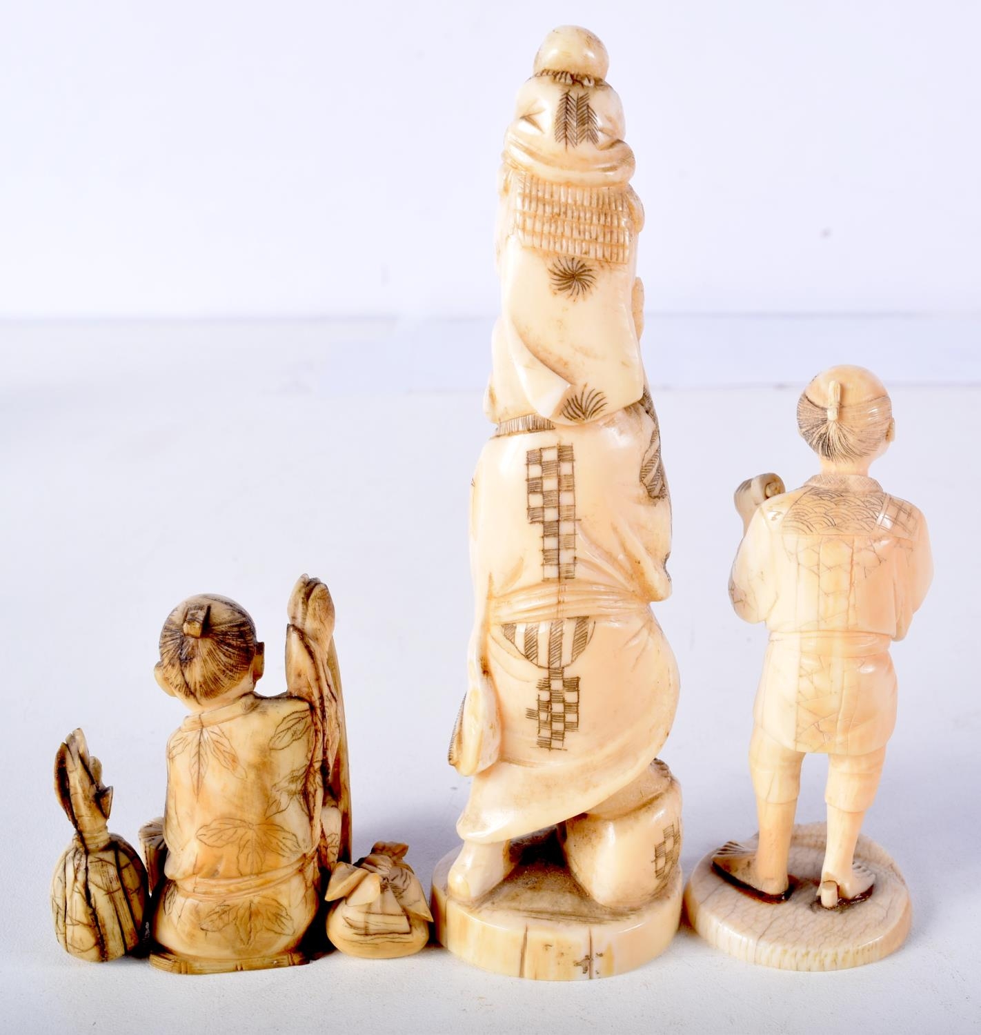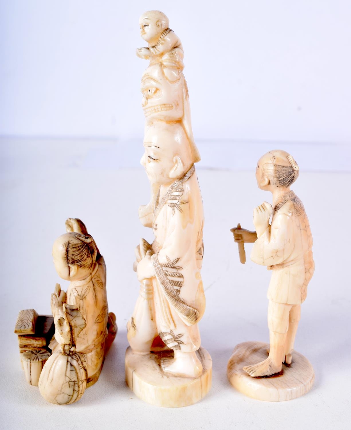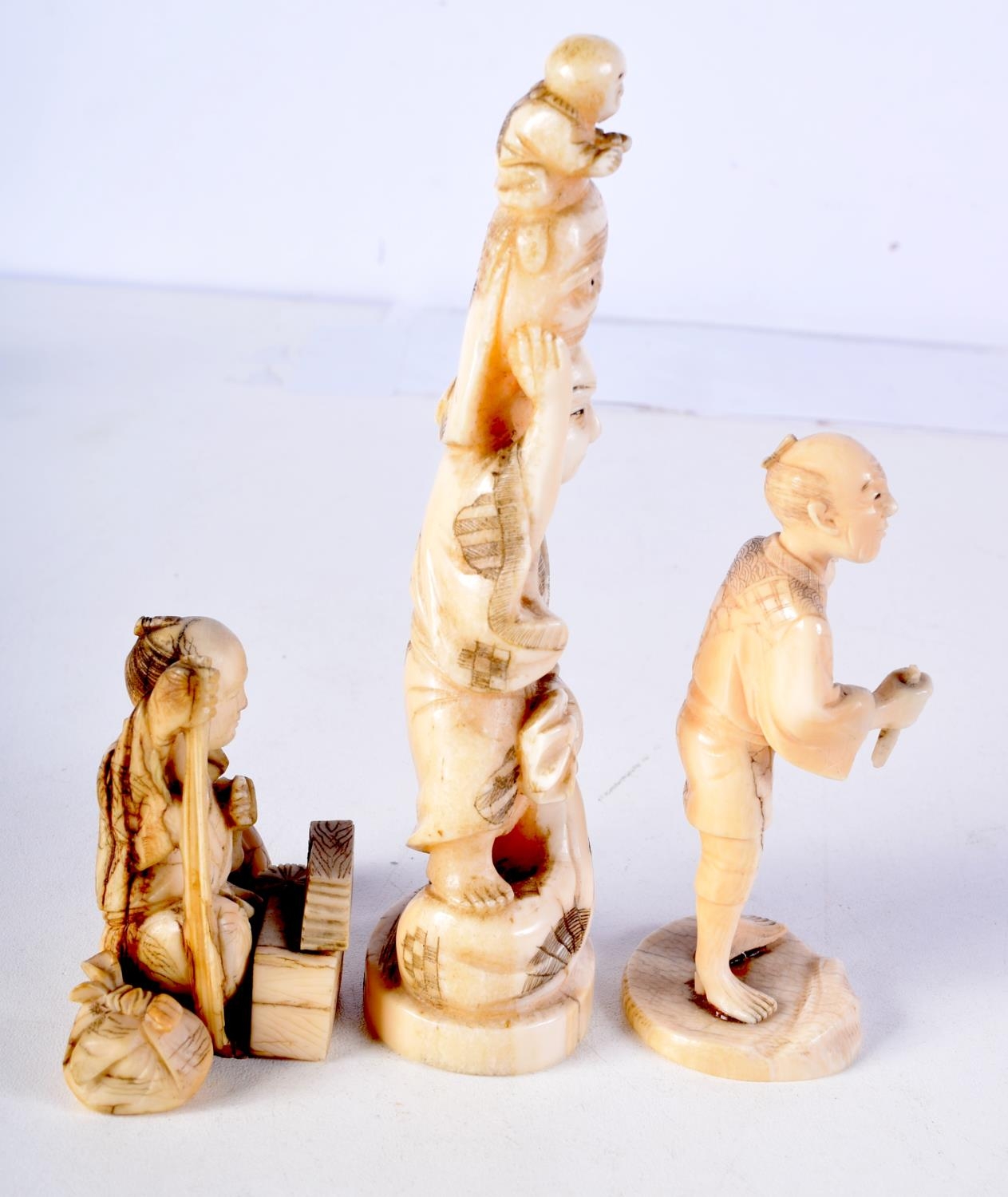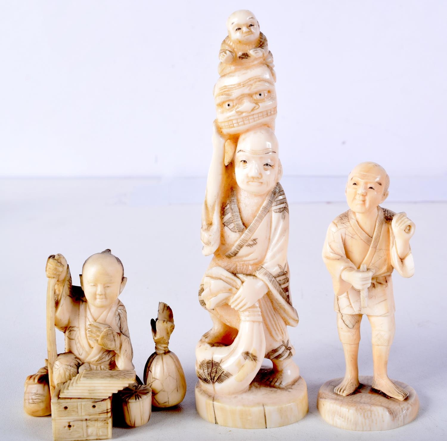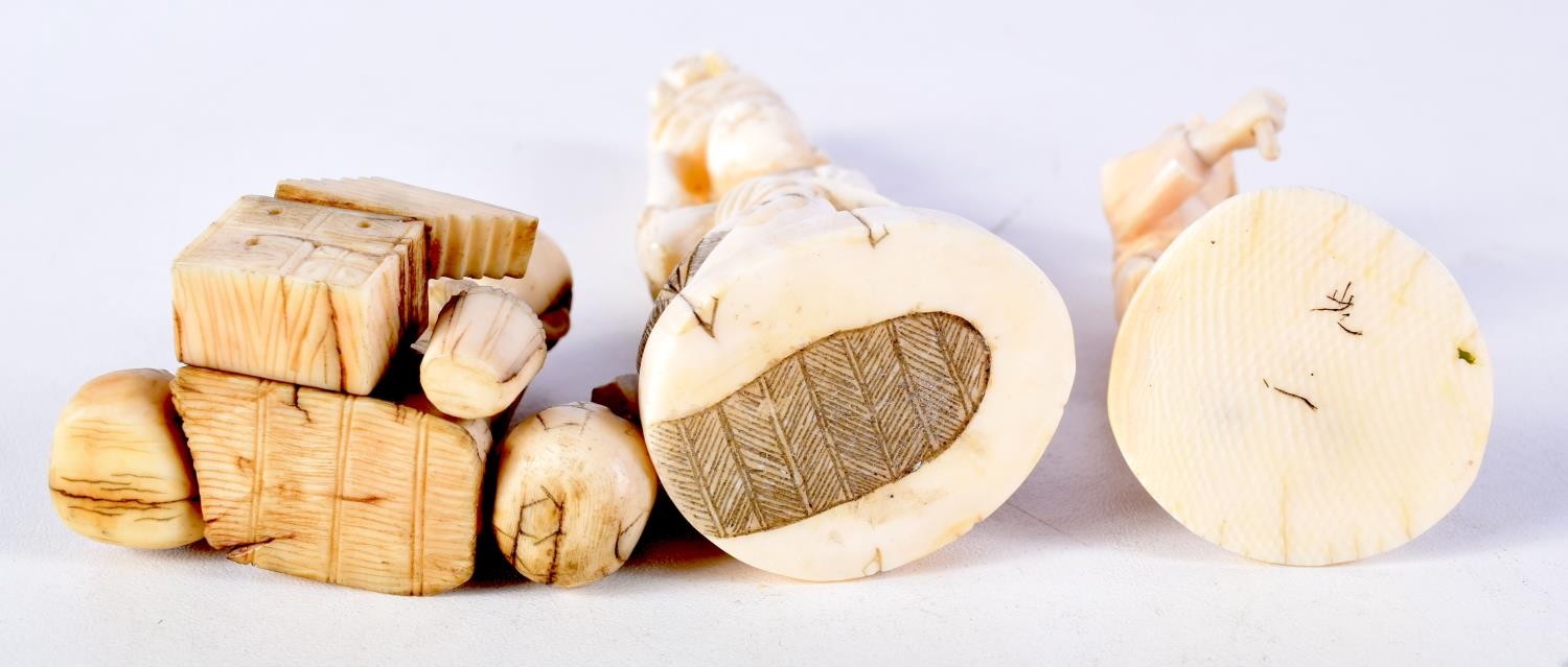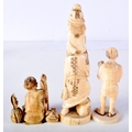 THREE 19TH CENTURY JAPANESE MEIJI PERIOD CARVED IVORY OKIMONO in various forms. Largest 10 cm high. (3)