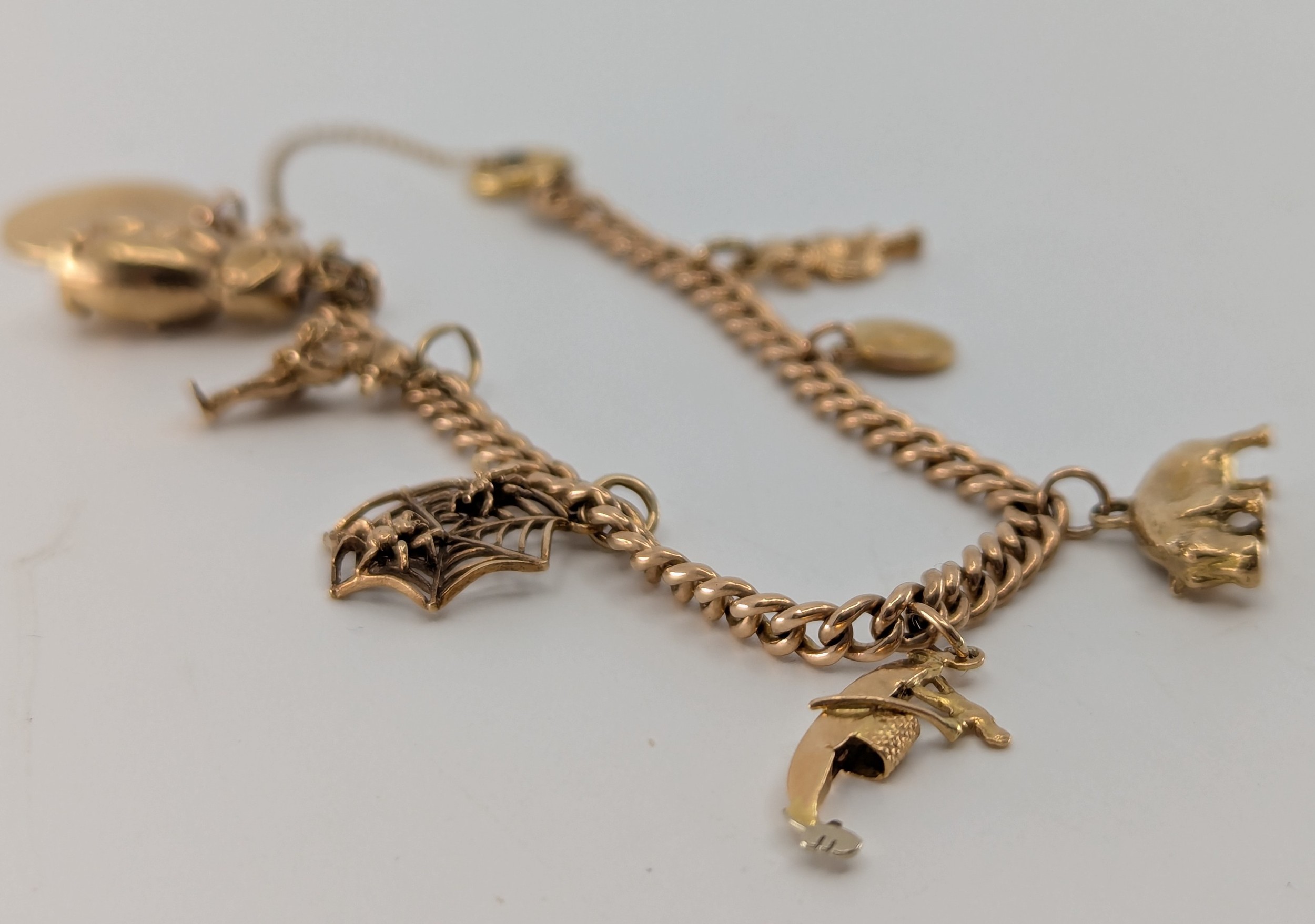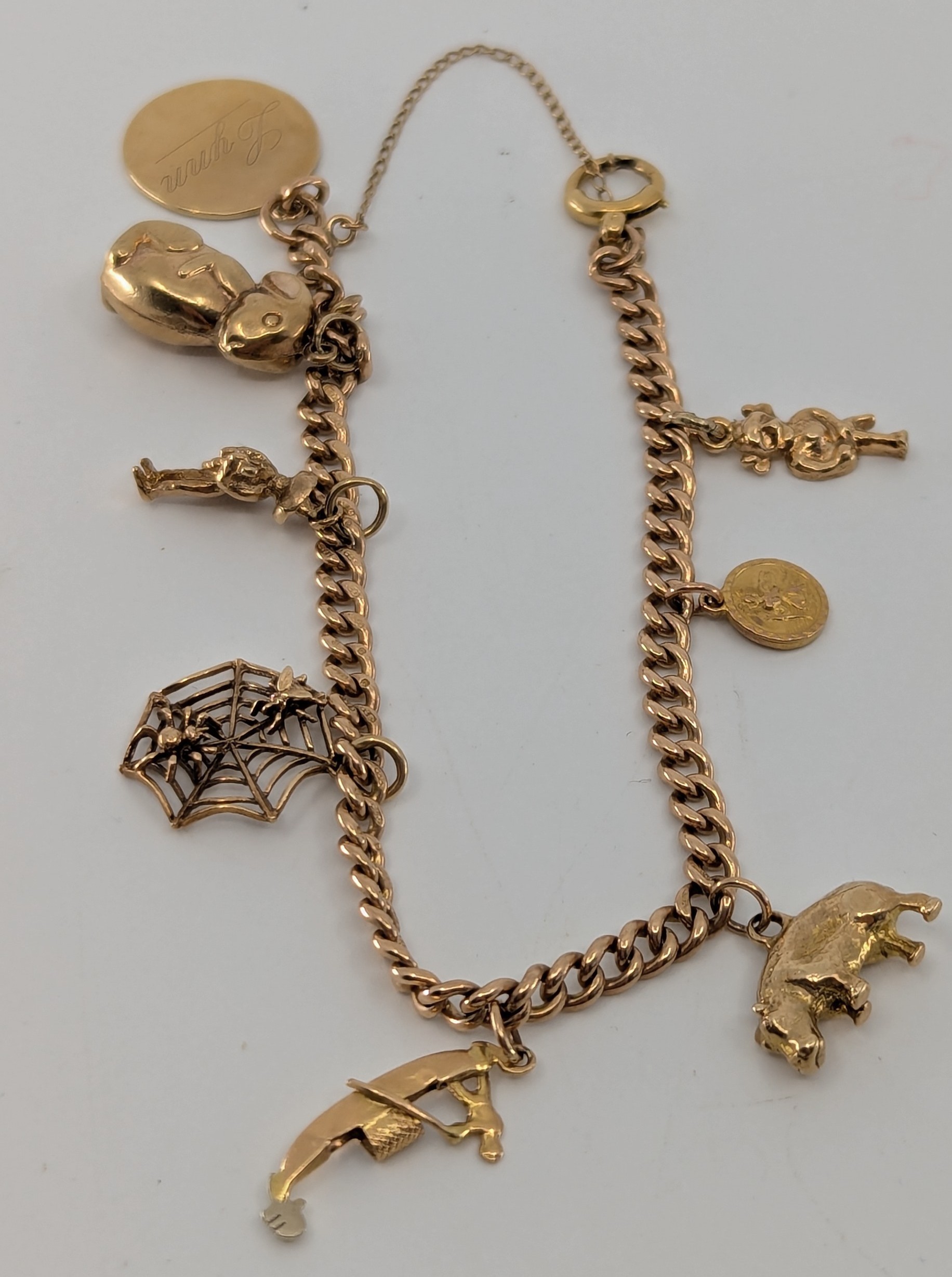 the curb link charm bracelet stamped "9 375" on every link, the charms include a "9 375" stamped rabbit, a "9 375" stamped spider and fly in a spider's web and a "9CT"stamped hippopotamus charm, safety chain, approx. 21.5g gross