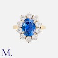 A Burma Sapphire & Diamond Cluster Ring in 18K gold. Oval cut sapphire weighing 3.84ct accompanied by a gemological report from GEM Paris stating the sapphire is of Myanmar (Burma) origin and no indications of heat treatment.
