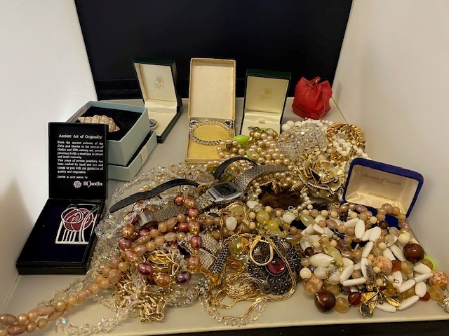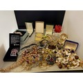 A selection of costume jewellery including Ciro pearls, Royal Horticultural Society brooch and matching earrings, boxed, necklaces, brooches etc..