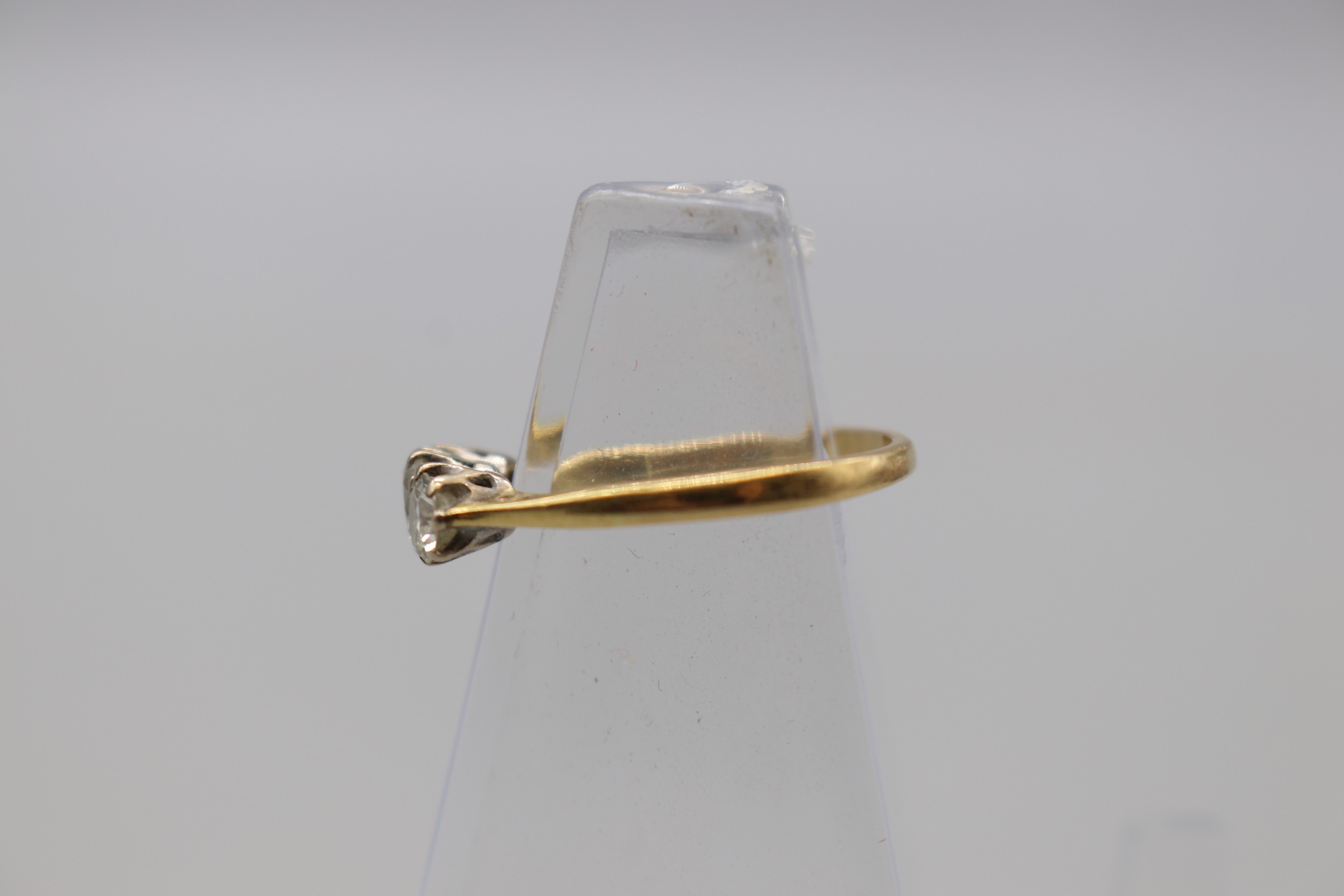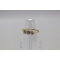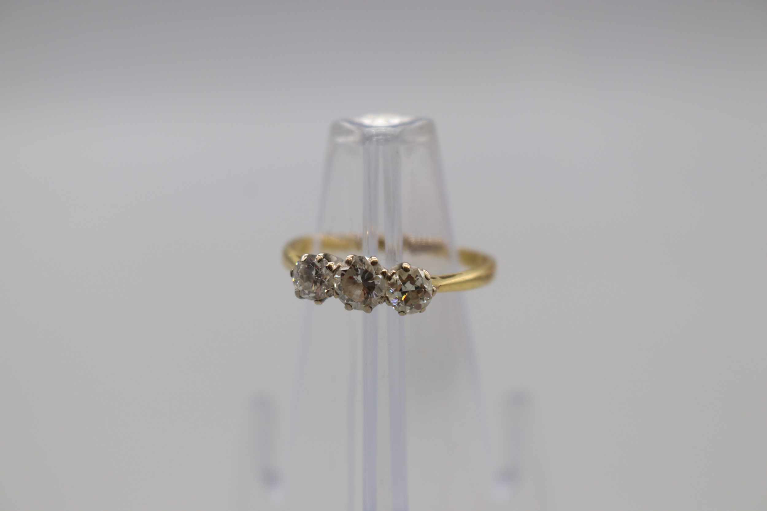 Stamped 18ct yellow gold diamond trilogy ring, set with an approximately 0.30ct round brilliant cut centre diamond, flanked by two approximately 0.20ct round brilliant cut diamonds, size O, weight 2.07g