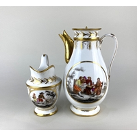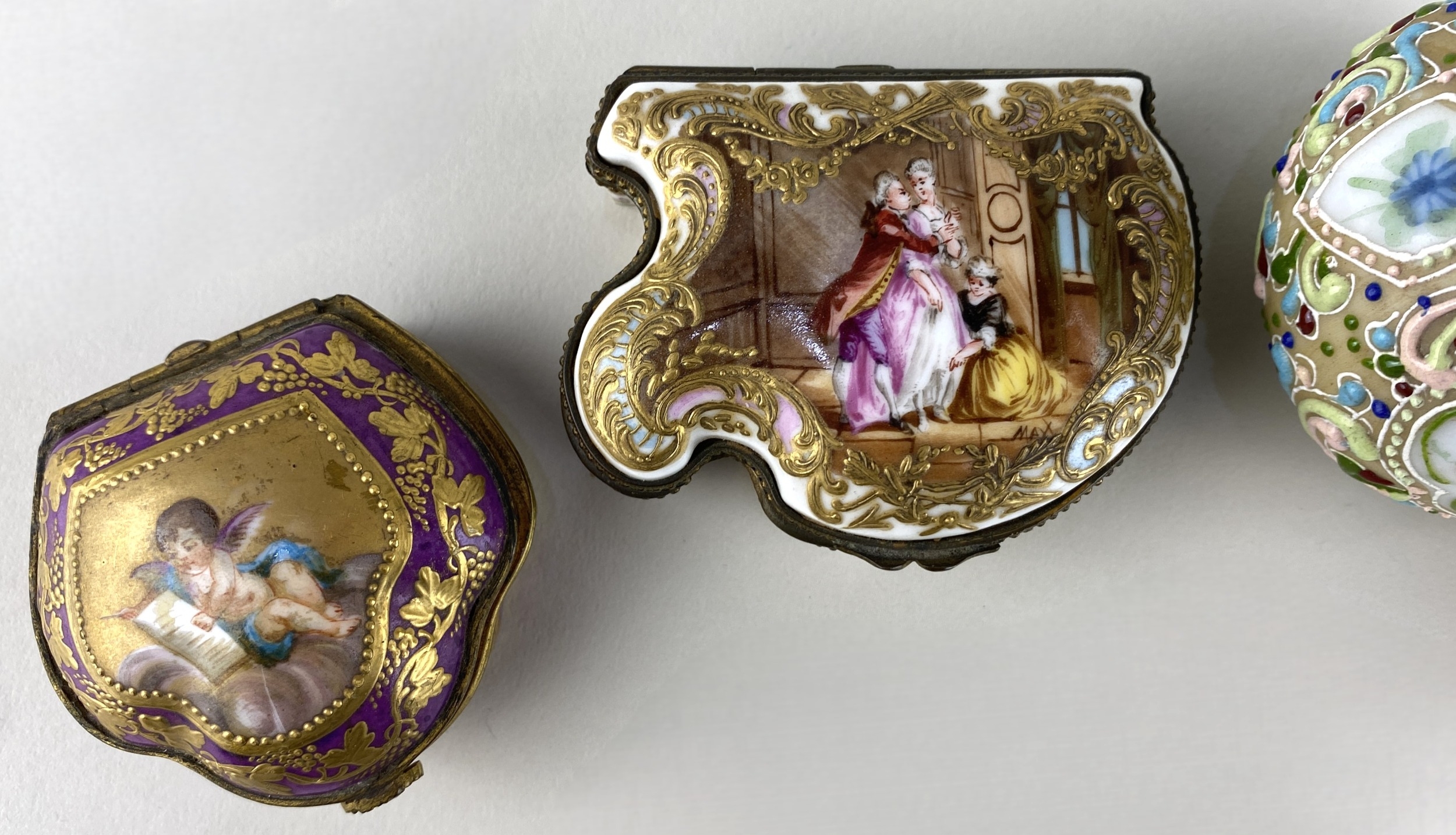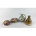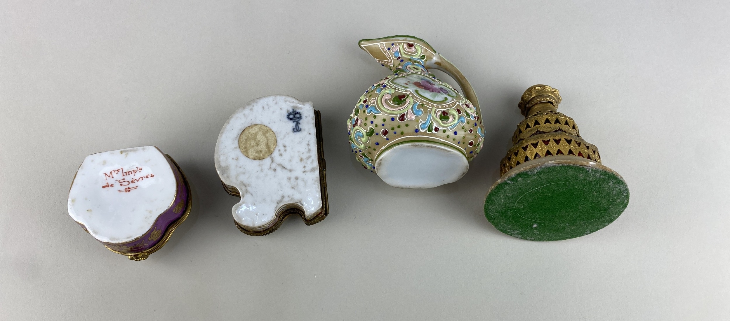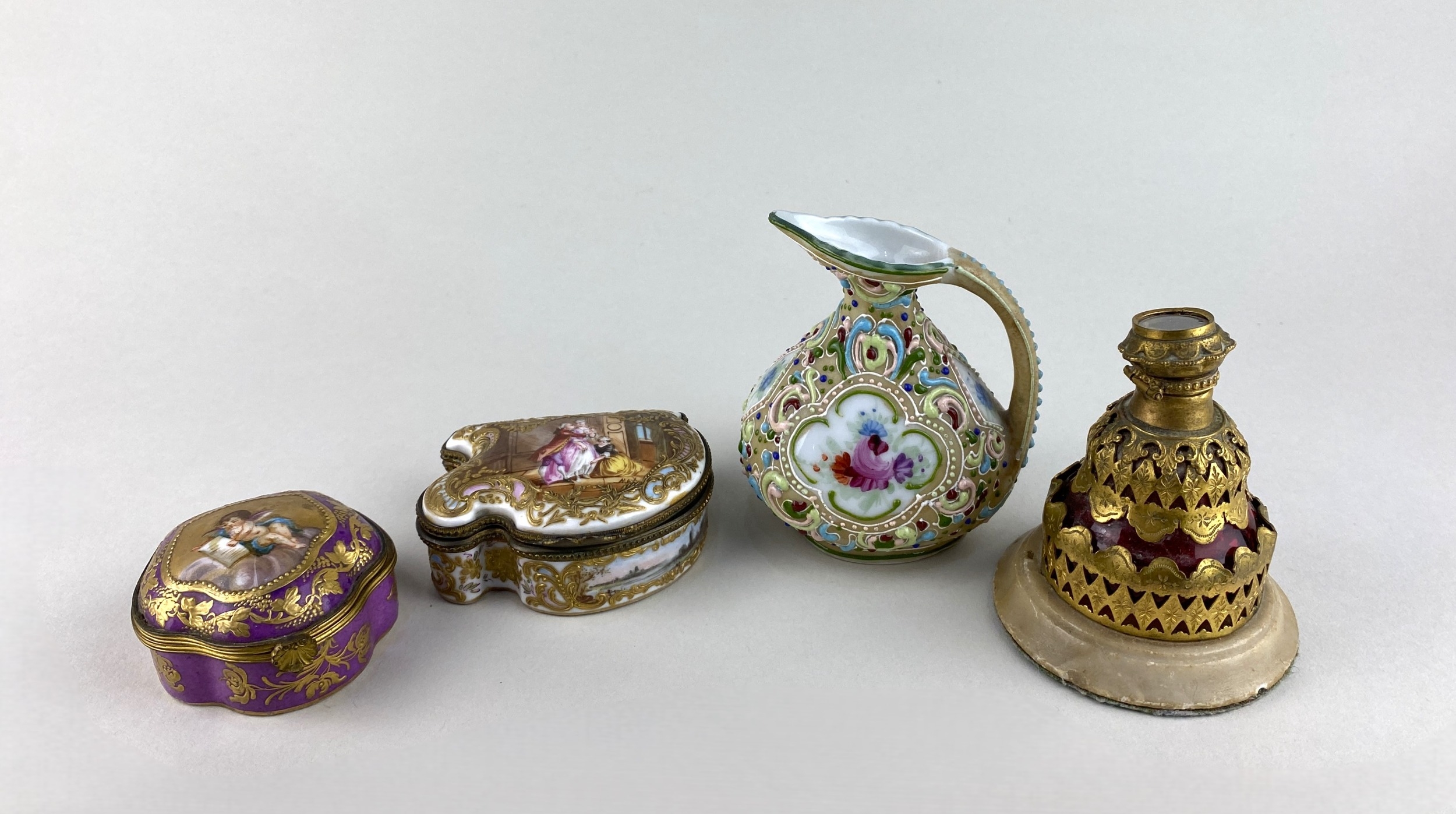 A Continental gilt and enamelled snuff box, Frankenthal style mark to base, 7cm wide, a Sevres style gilt mounted box and cover 5.5cm wide, a gilt metal mounted cranberry glass perfume bottle and a small porcelain jug (a/f)