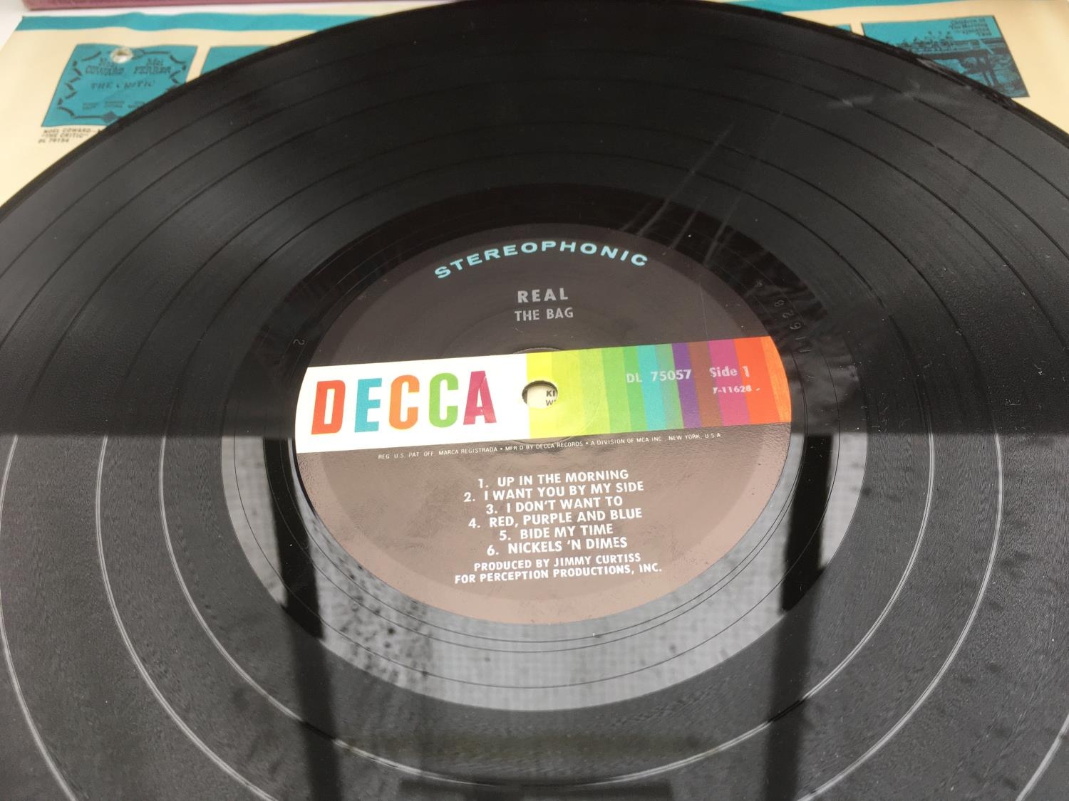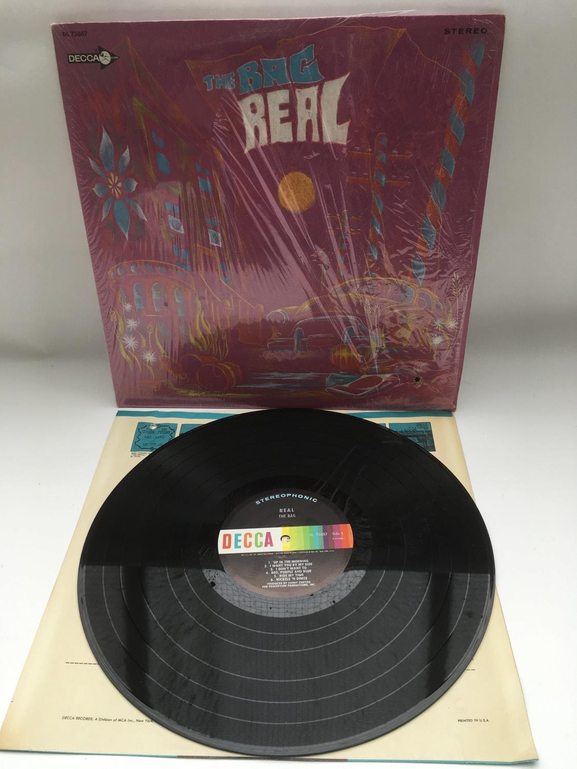 A stereo issue of 'Real' by The Bag, 1968 psychedelic rock. Vinyl Ex, sleeve has a small hole on the front.