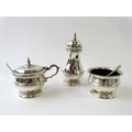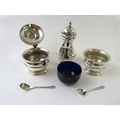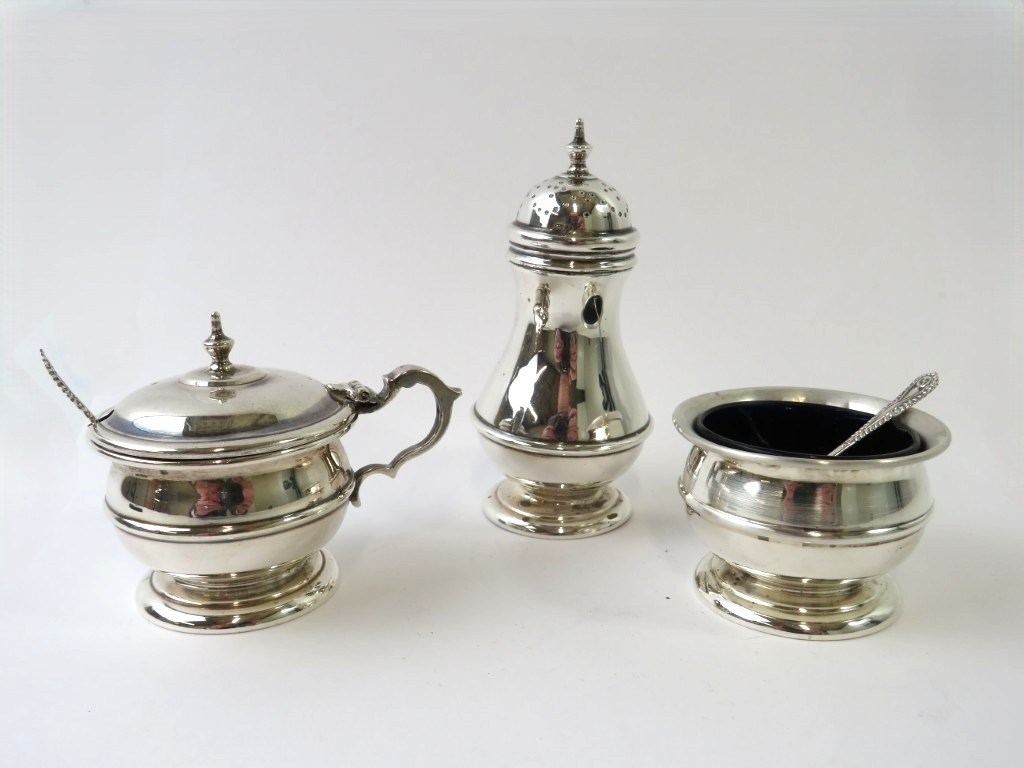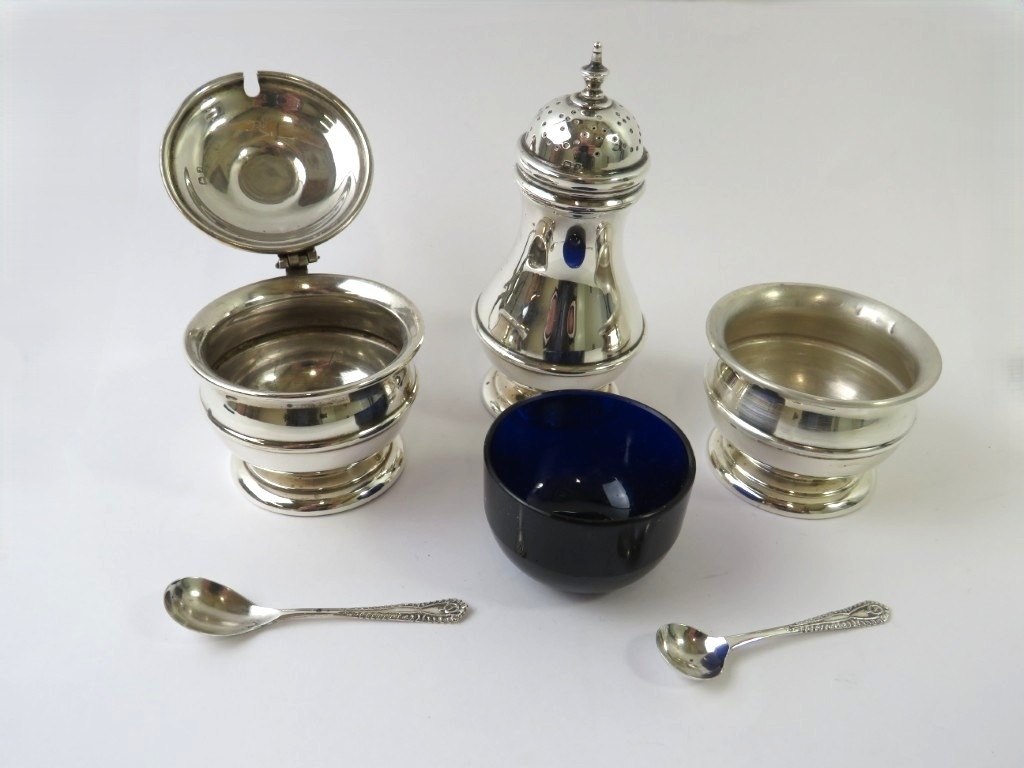 A good quality silver three piece cruet set consisting of salt, mustard and pepper with unassociated spoons. Hallmarked for Birmingham 1933, maker Blackmore & Fletcher Ltd. Approx gross silver weight 193 grams. (3)