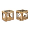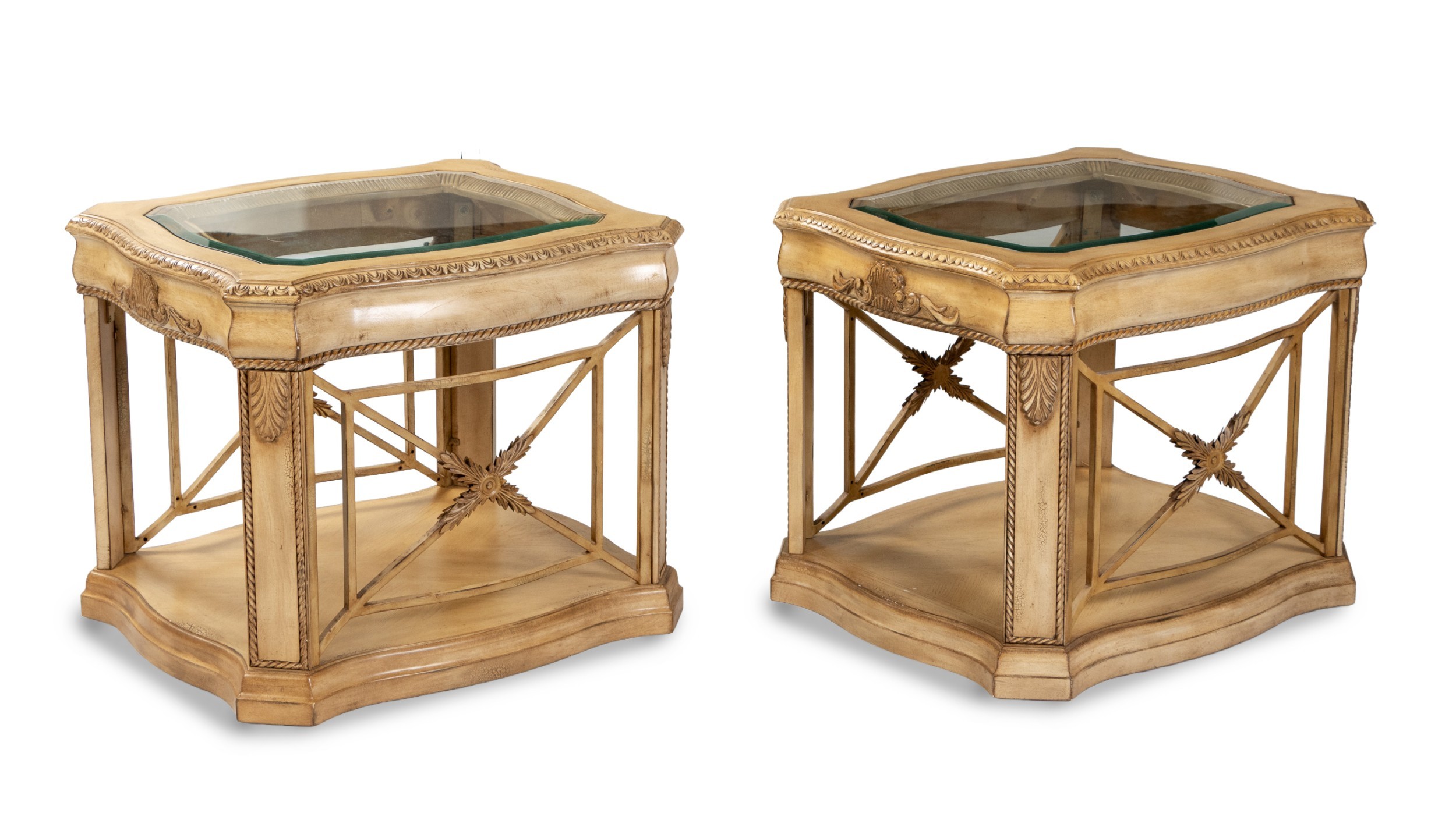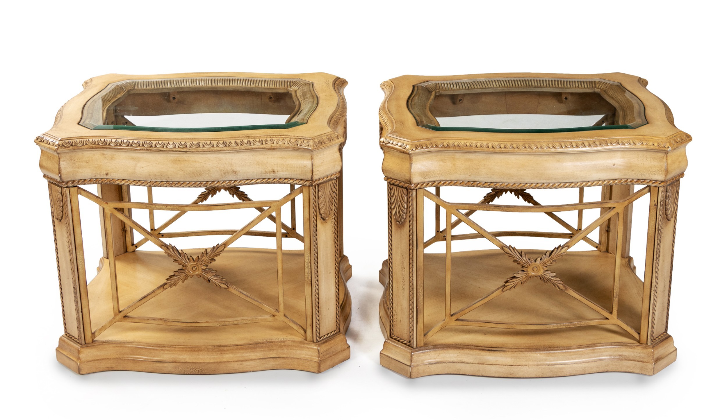 Each rectangular inset glass top within a composite serpentine frame, on a plinth base