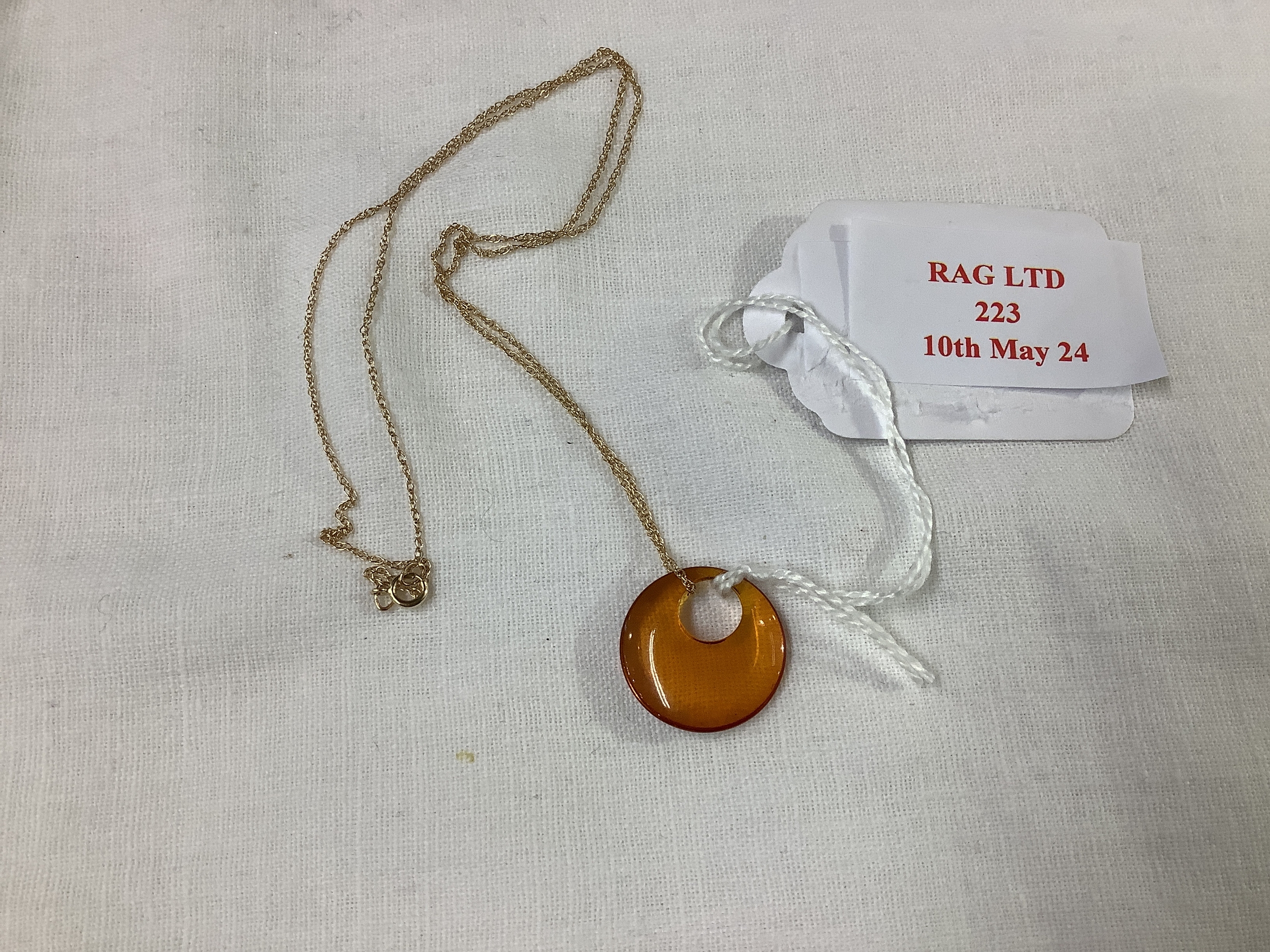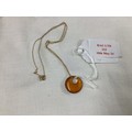 A 14k gold necklace with an amber pendant