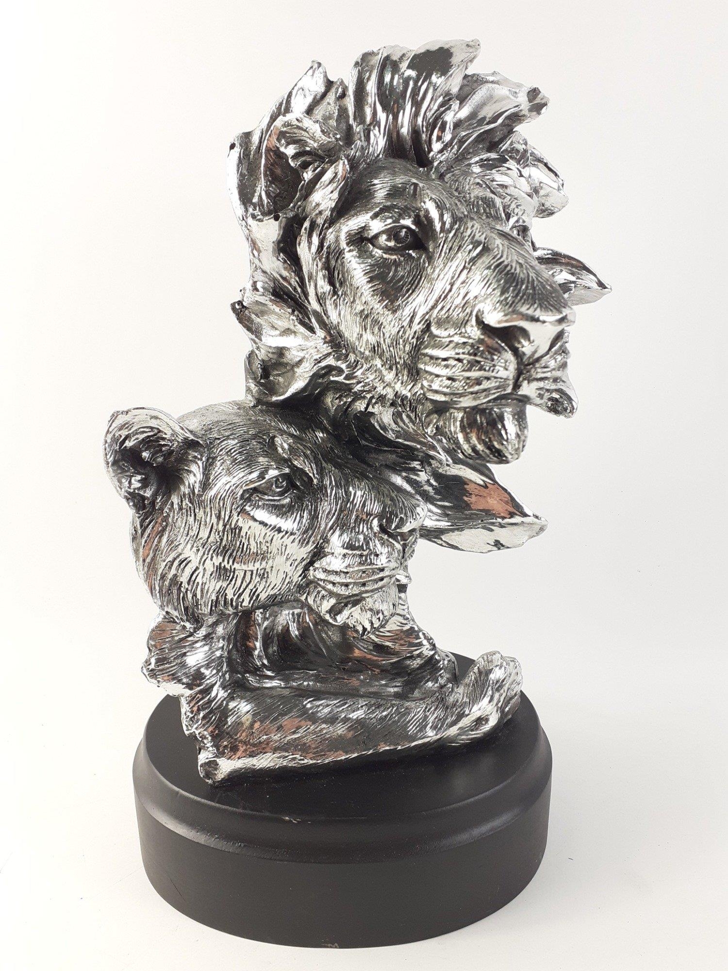 A very stunning resin silvered bust of a lion couple. Modern sculpture standing approx 30cm tall. Displays superbly.