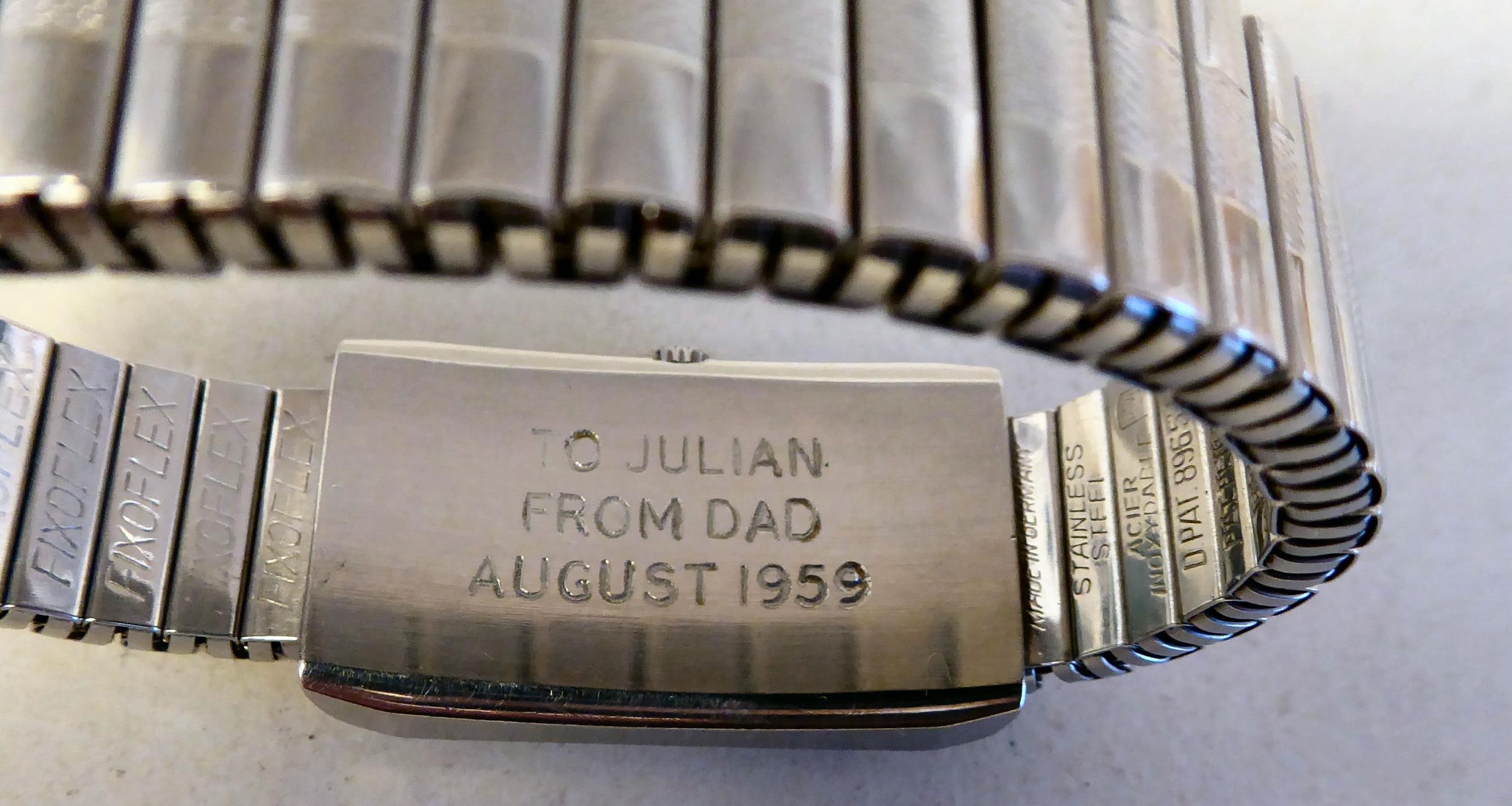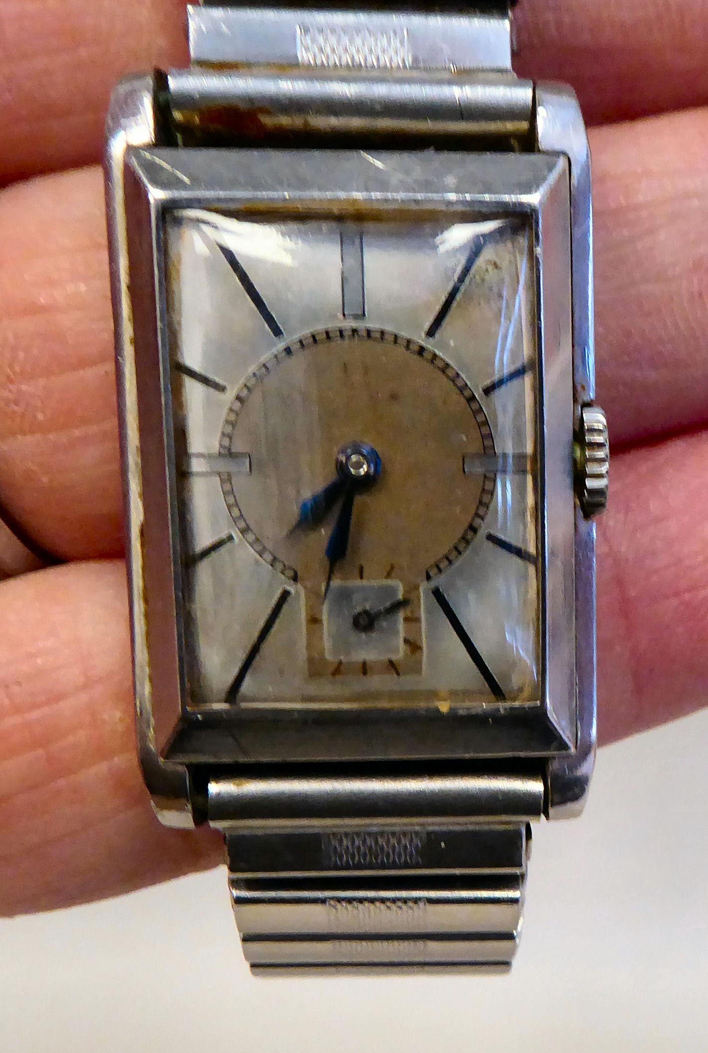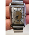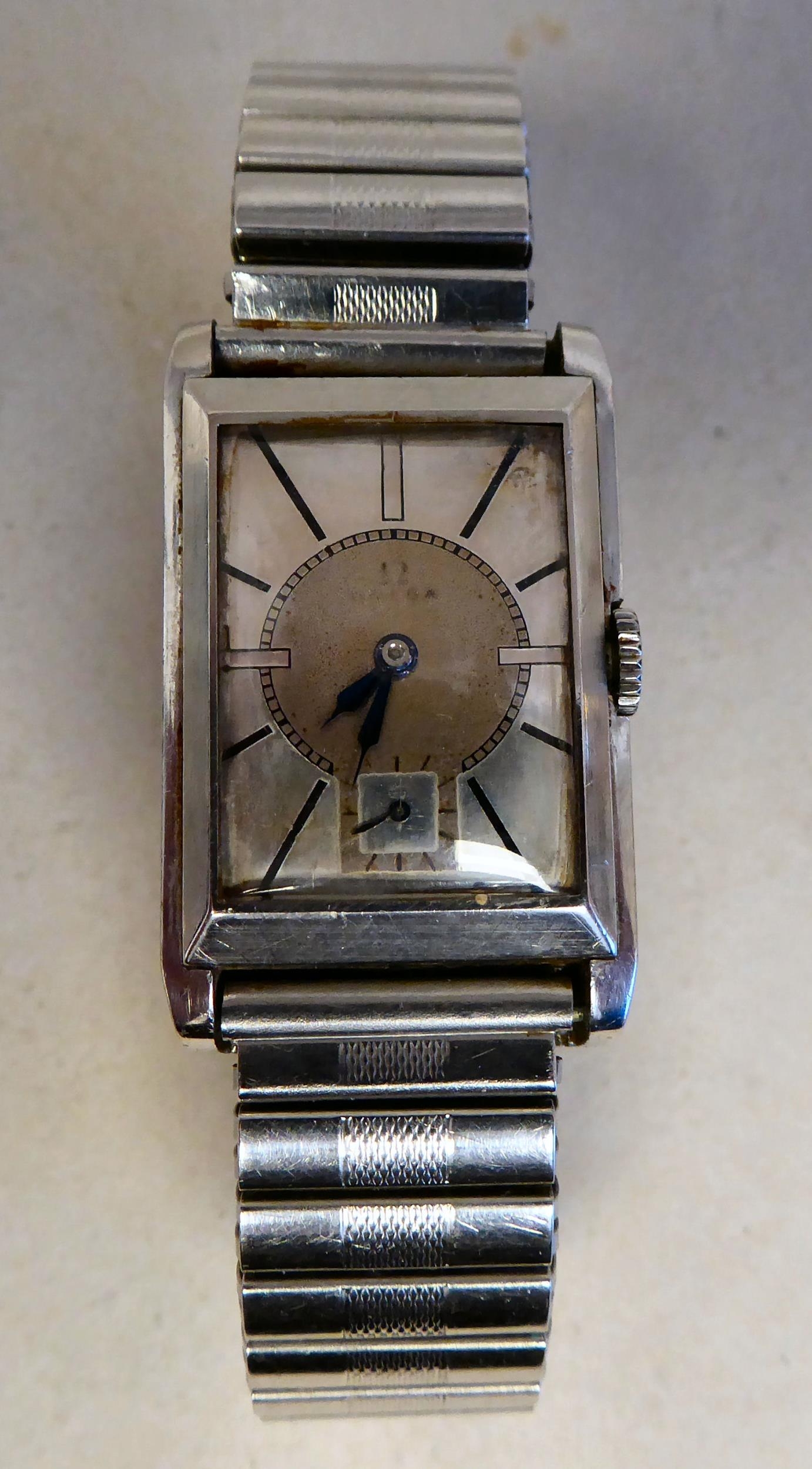 An Omega stainless steel cased manual, bracelet Tank watch, faced by a baton dial and subsidiary seconds