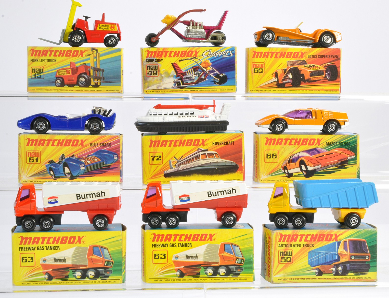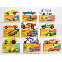 Matchbox Superfast comprising nine boxed issues as shown. Mazda RX, Chop Suey, Freeway Tanker etc. Mostly very good or excellent in mostly very good/excellent boxes. Generally Ex-Shop Stock.