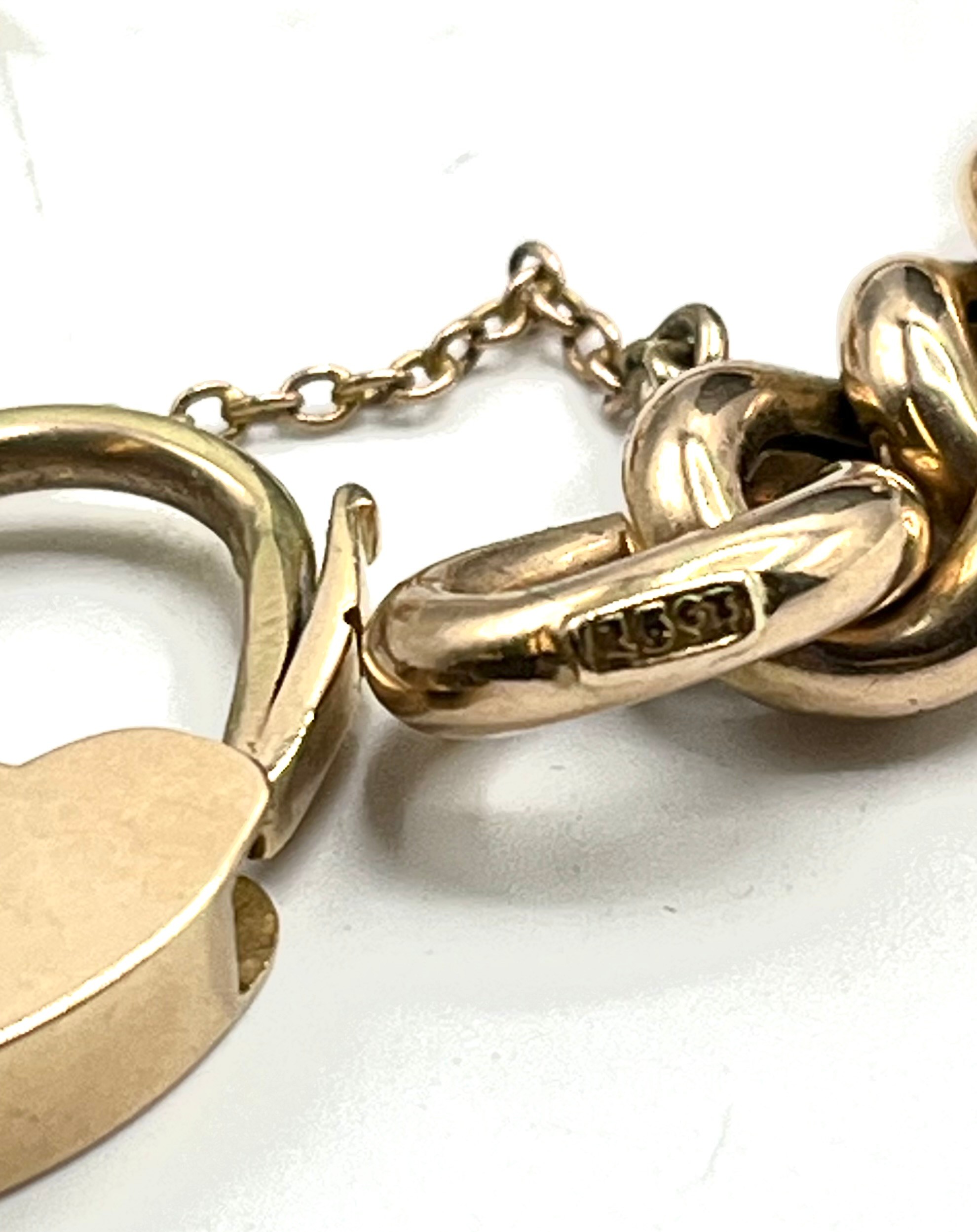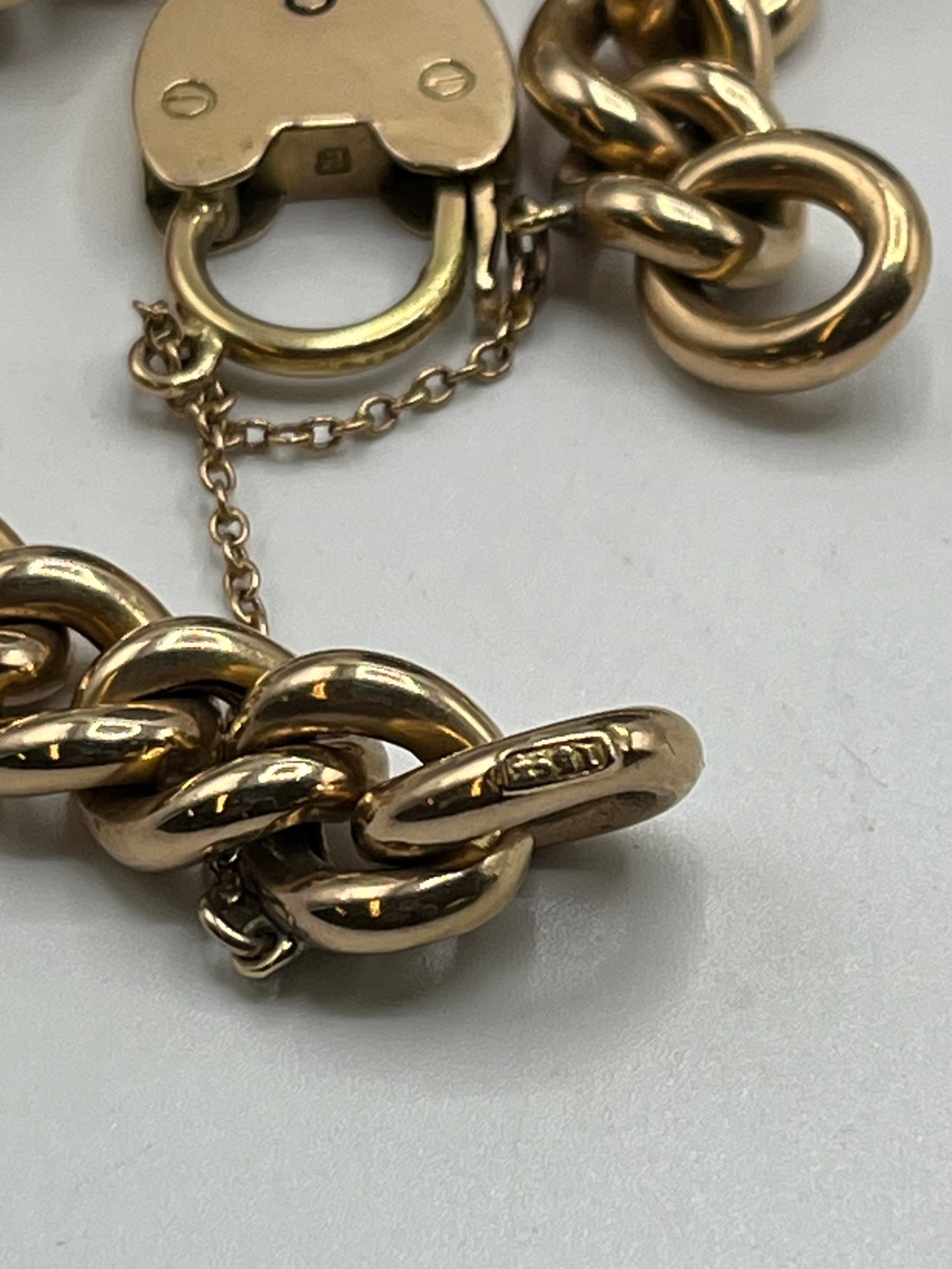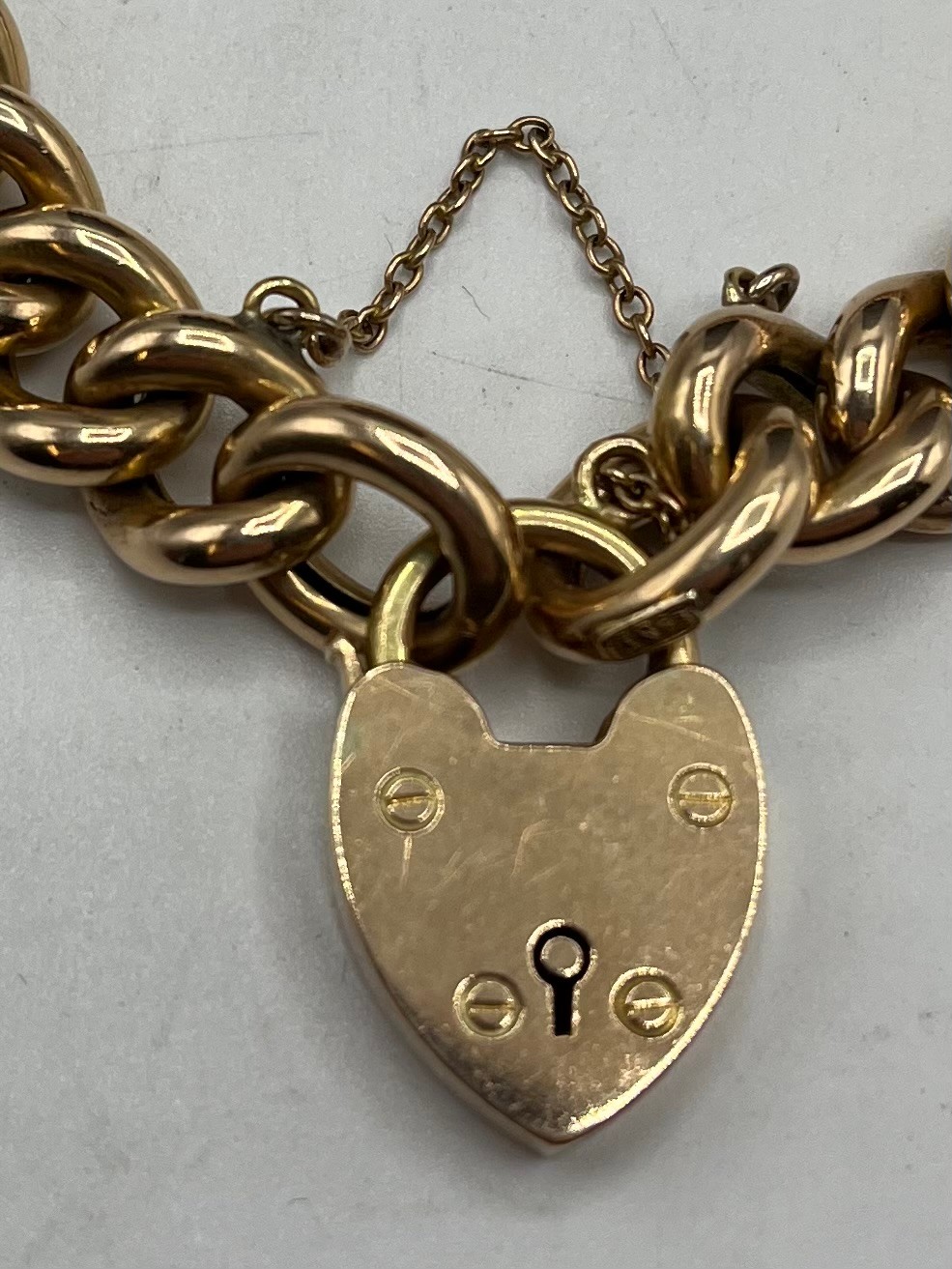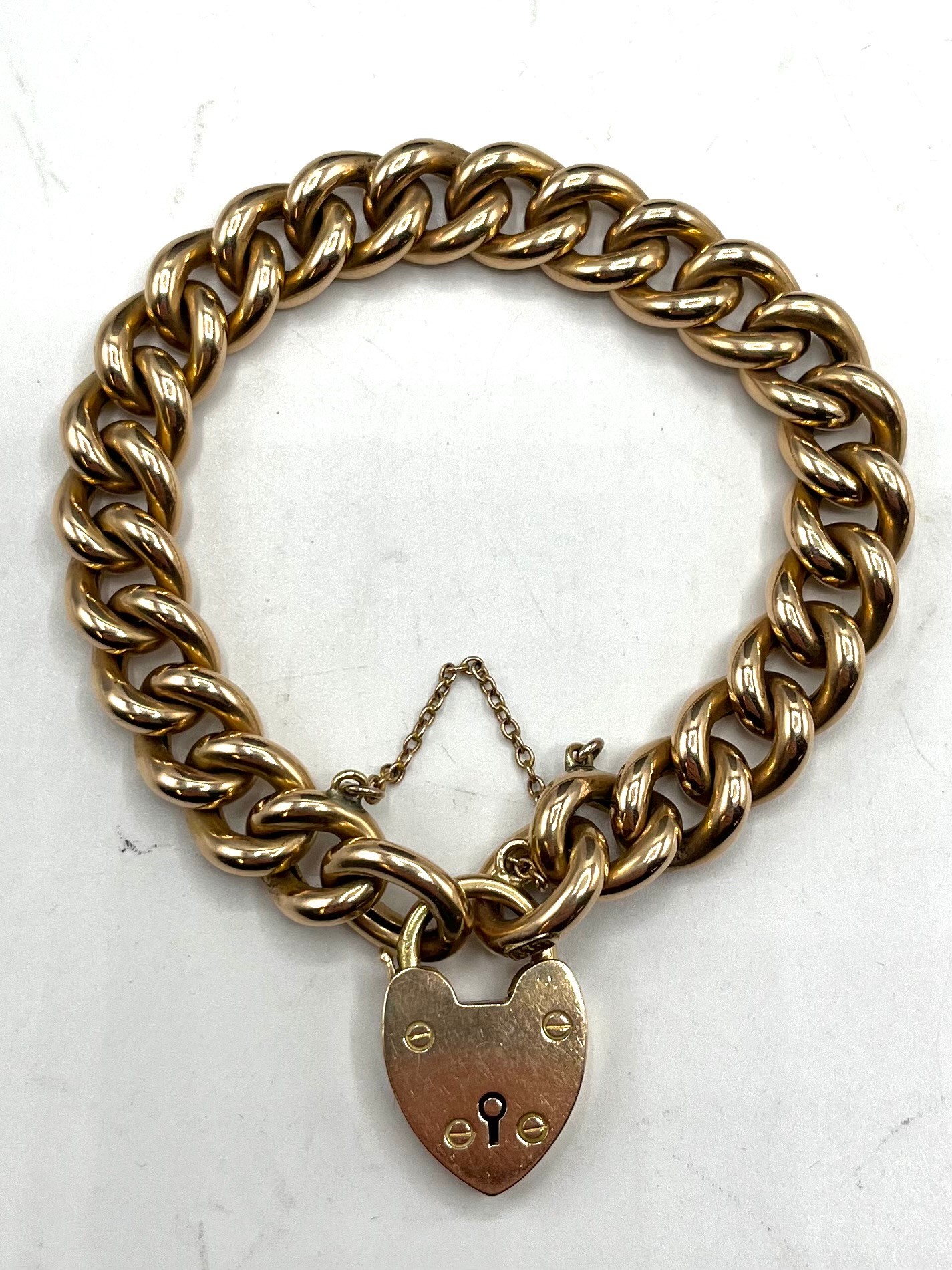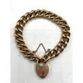 A 15ct rose gold curb link bracelet with 15ct gold heart locket approximately 22.5cm. 26g.