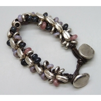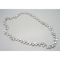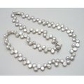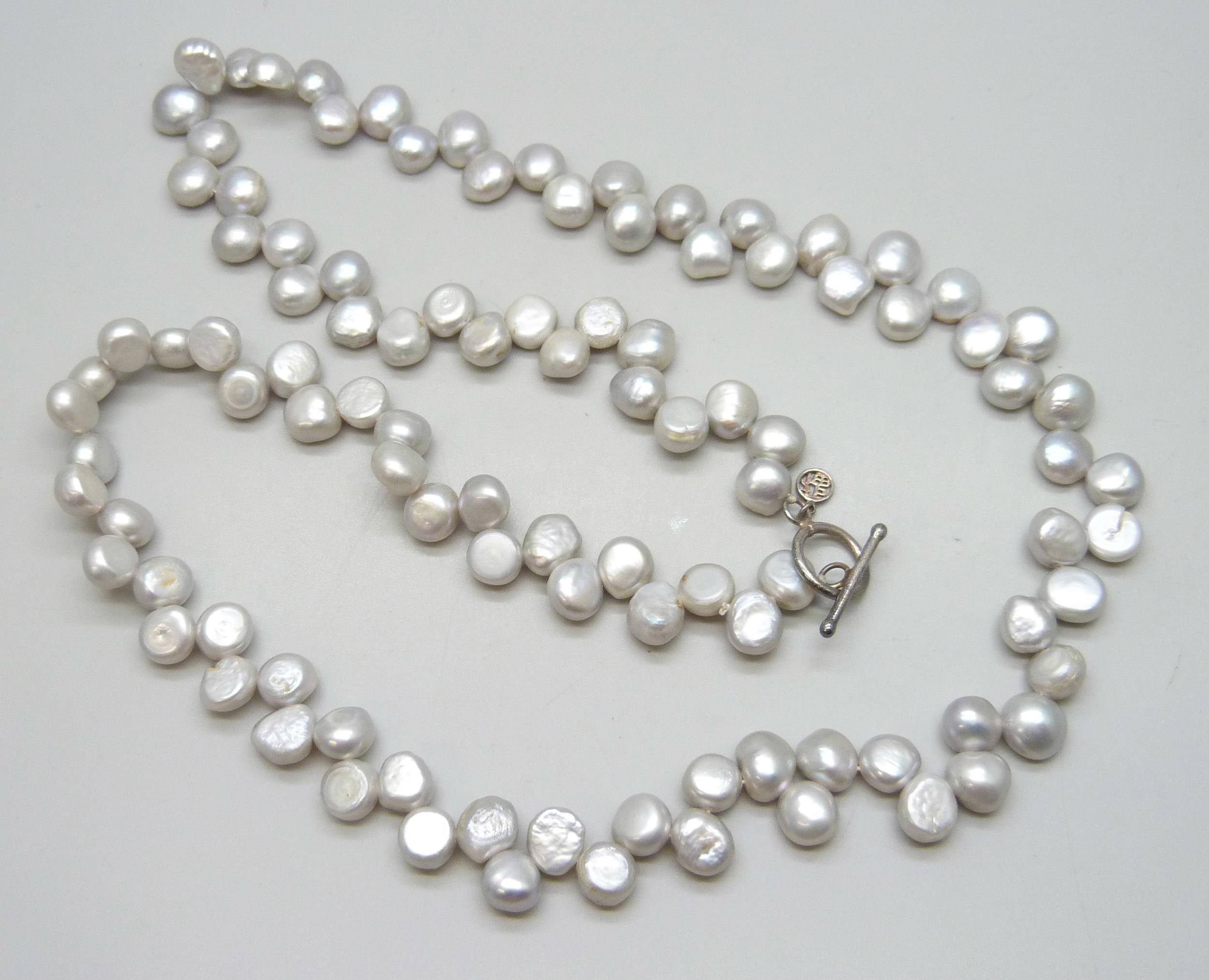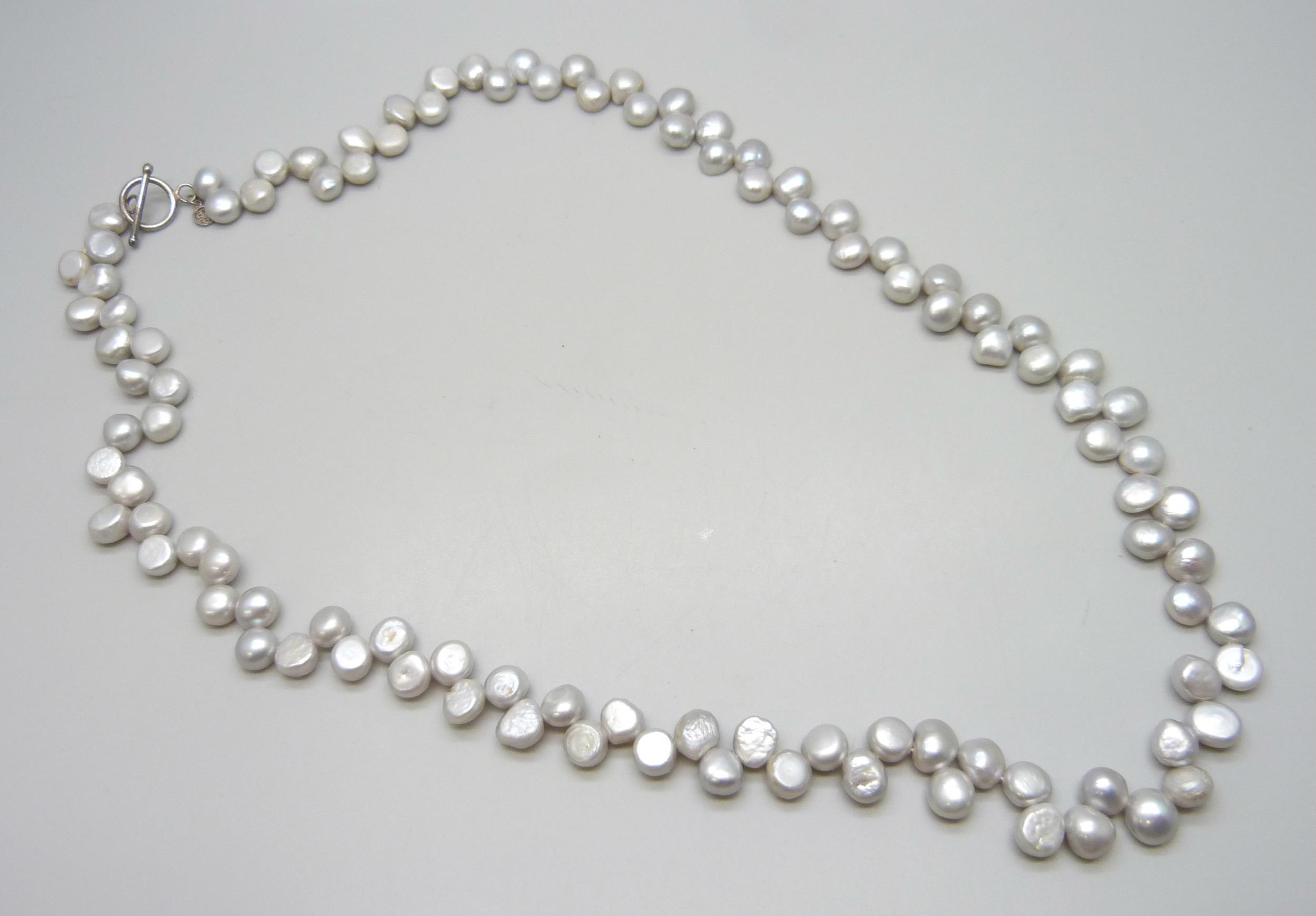 A long Chinese export grey pearl necklace with a silver T bar clasp, 84g, 69.5cm