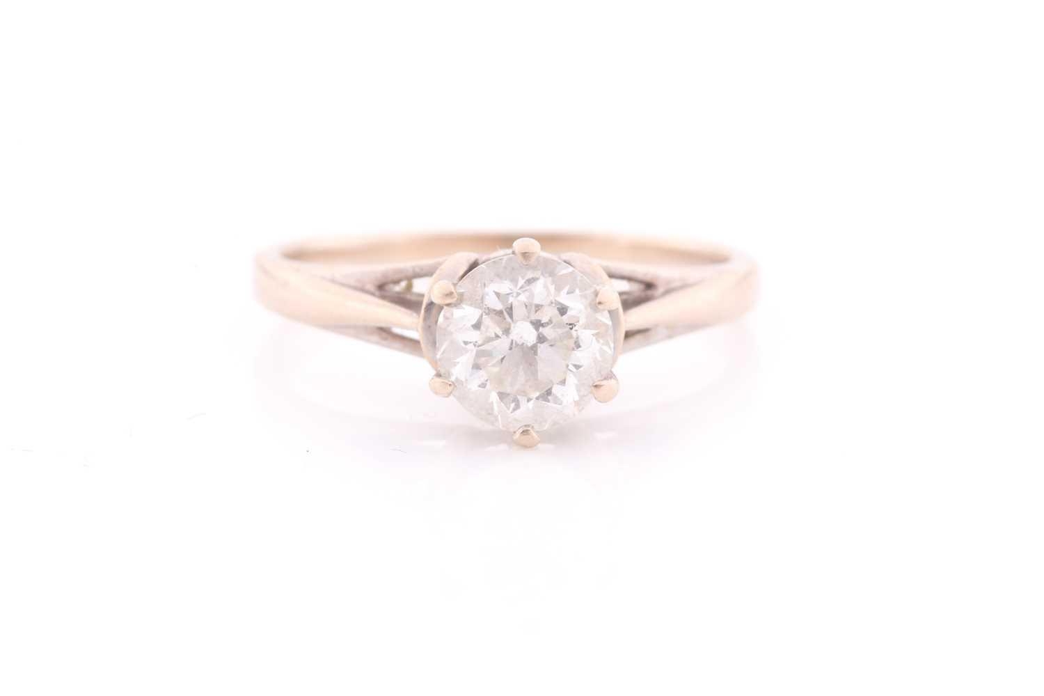 A solitaire diamond ring, set with a round brilliant-cut diamond, of approximately 0.90- 1.00 carats, approximate colour / clarity H/I, SI2, six-claw set in unmarked white gold (tests as 18ct), size J. Together with a copy of insurance valuation dated July 2016, stating insurance replacement value to be £8500