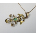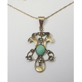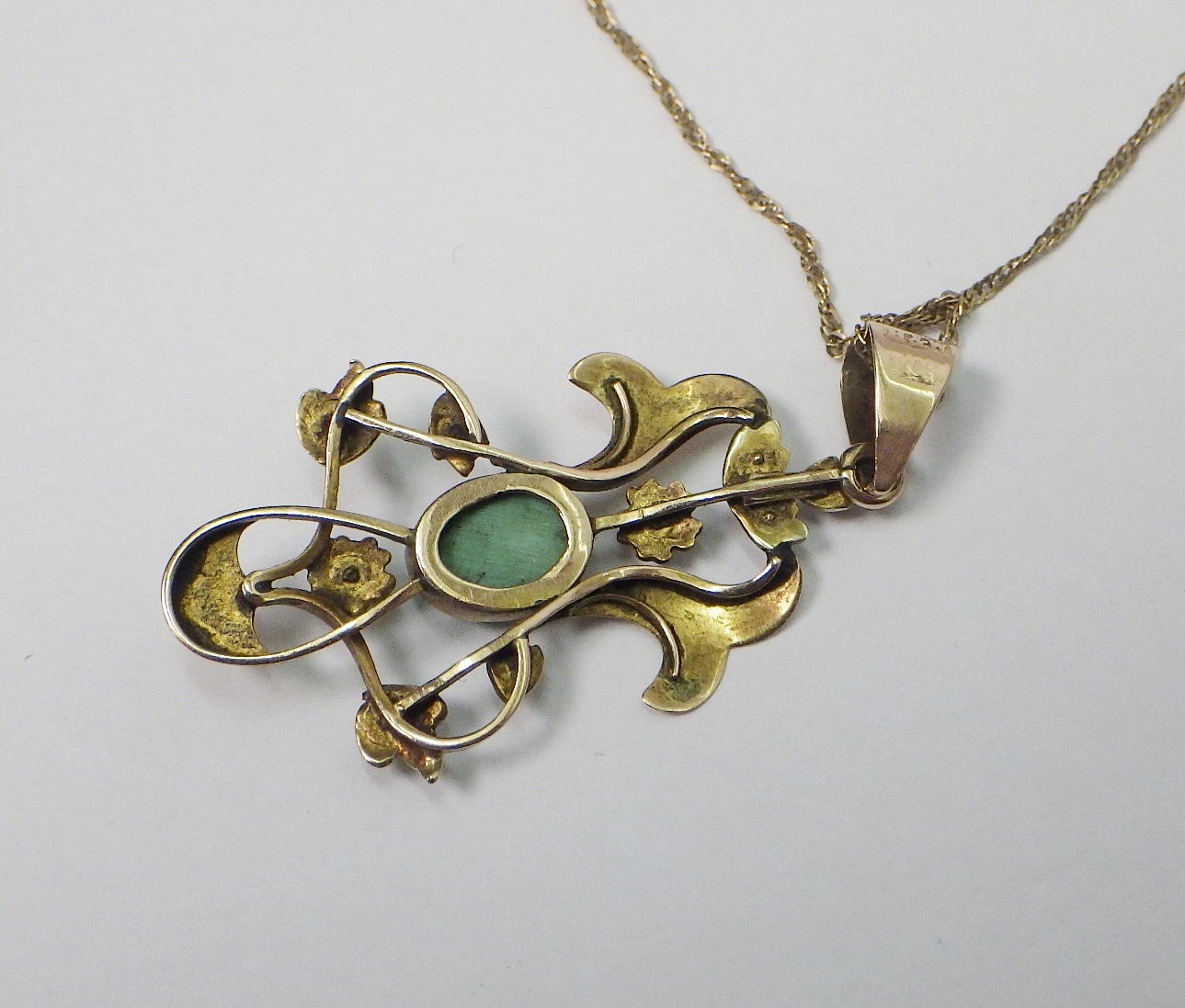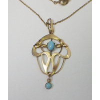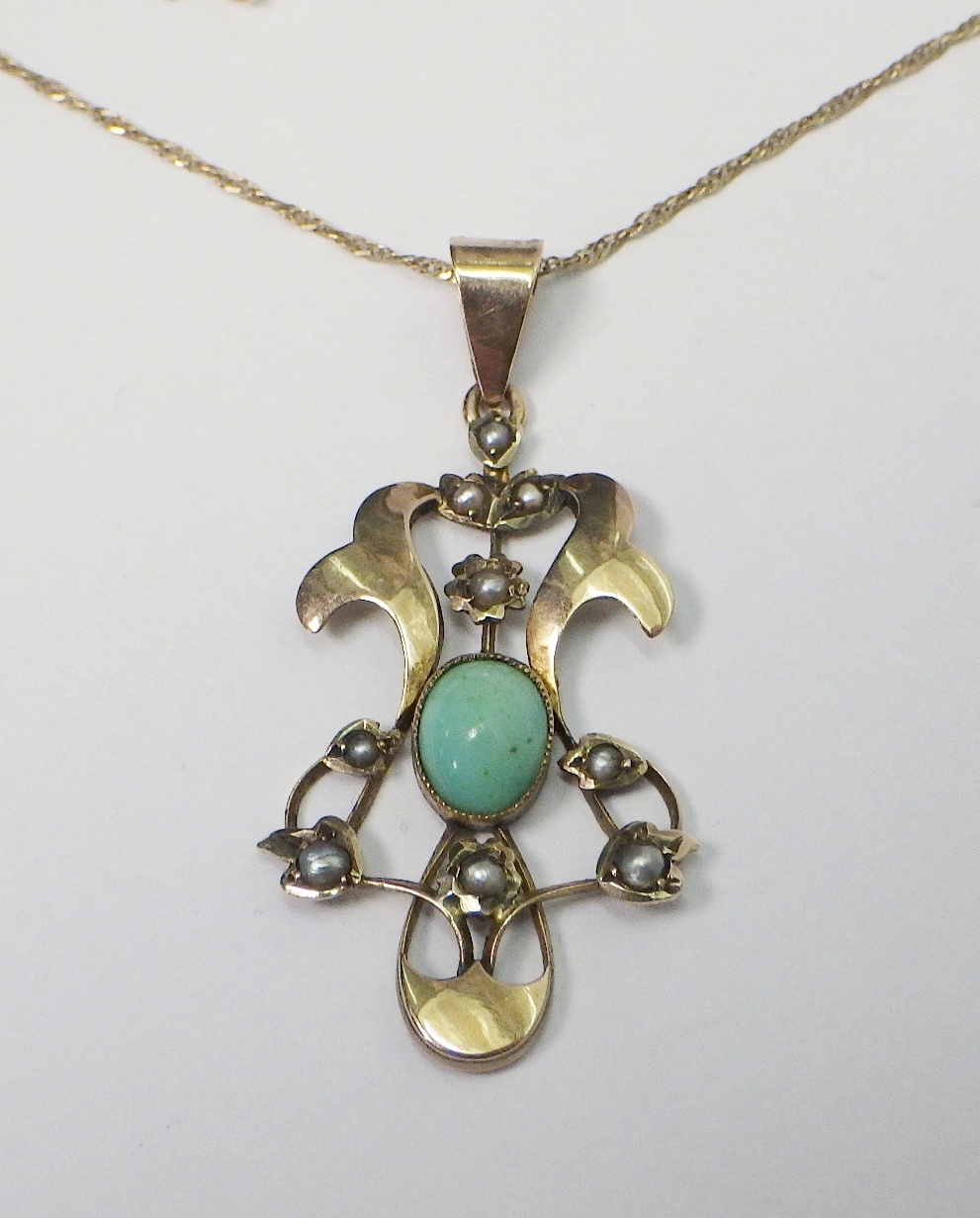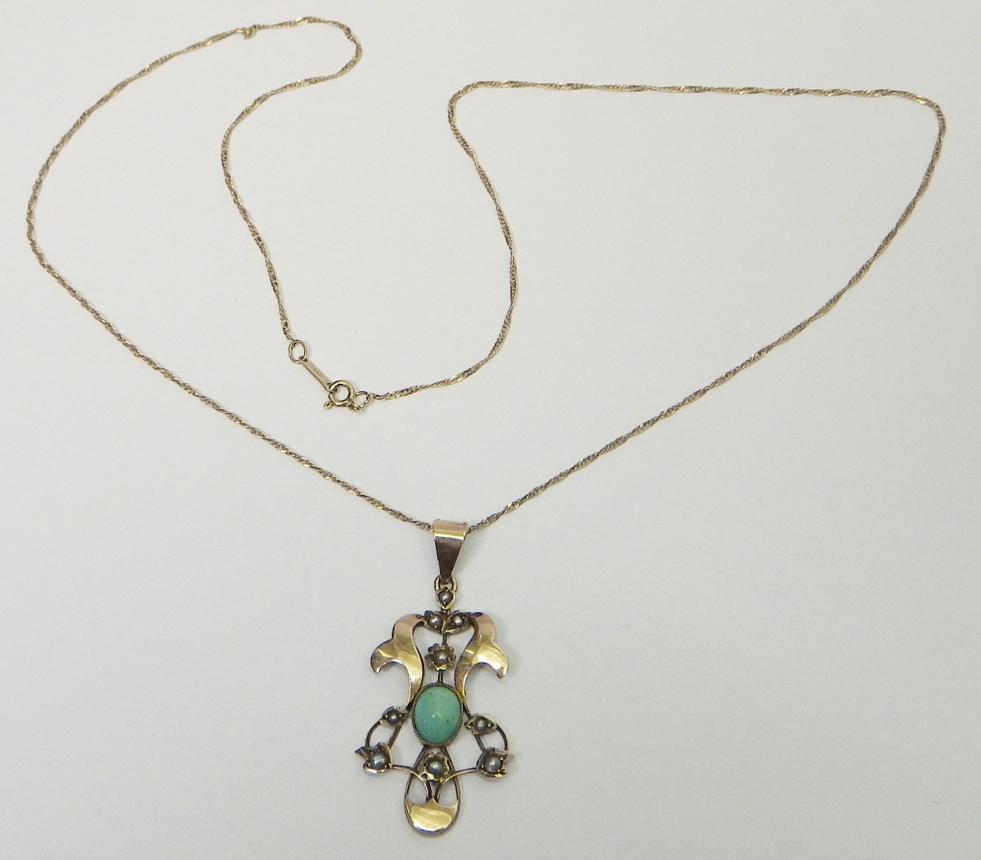 An Art Nouveau pendant set with turquoise & seed pearls, yellow metal indistinctly marked, the whole suspended on a yellow metal chain marked 9kt. 40mm long. The whole weighs approx 3g gross